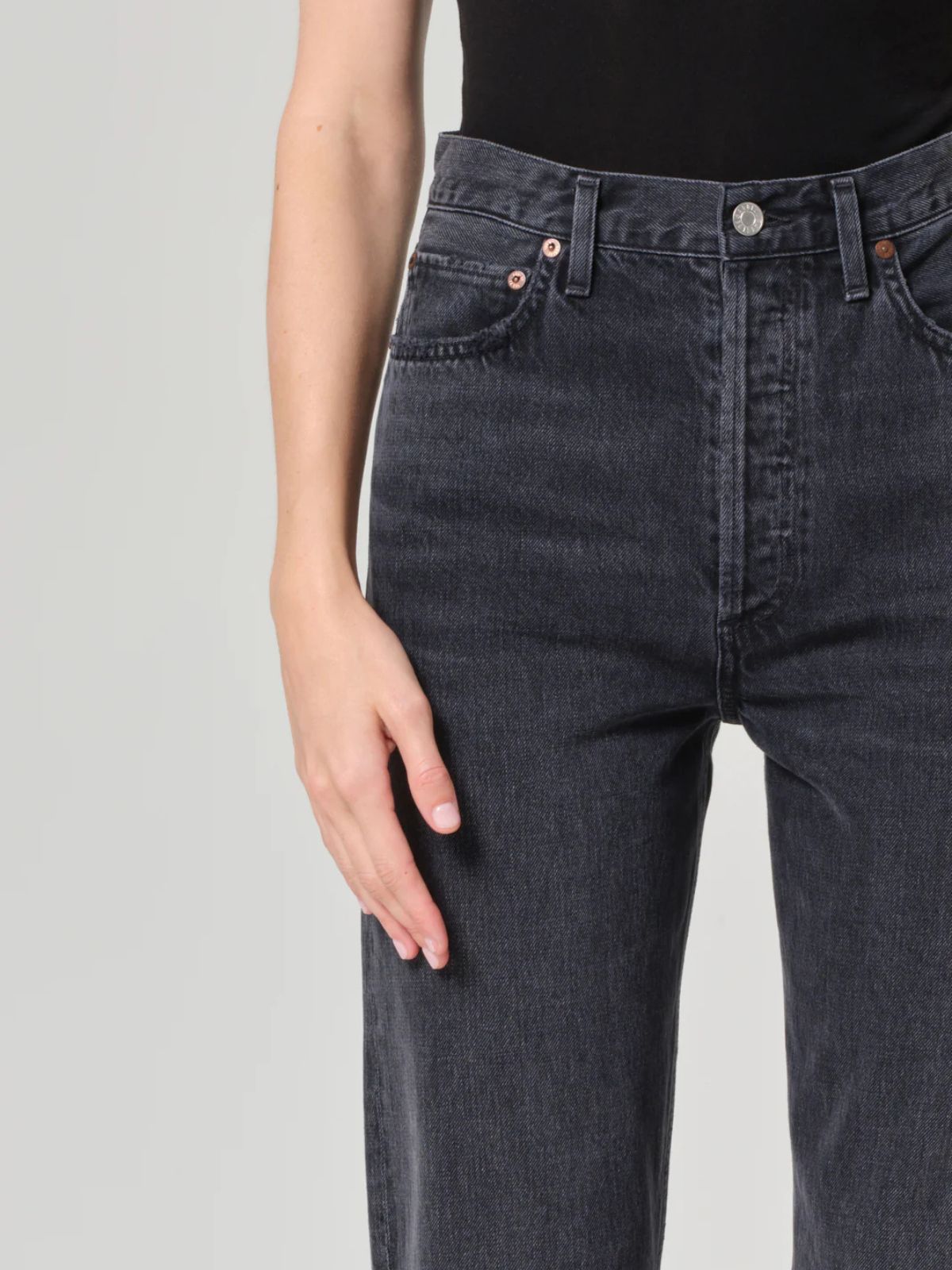 A vintage-inspired fit with a modern feel. The 90’s Pinch Waist features a flattering high-rise waist with a close-fitting top block that hugs through the hips before falling into a classic straight leg. Crafted from black regenerative cotton denim, this pair offers a non-stretch, authentic vintage look. Finished with a full-length inseam, it’s endlessly versatile—style it with anything and everything for effortless, everyday wear