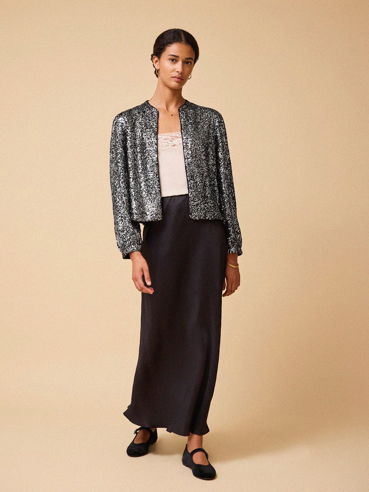 Amira is a bolero-style cropped jacket with puffed shoulders and gathered sleeves designed to deliver instant sparkle to any outfit.