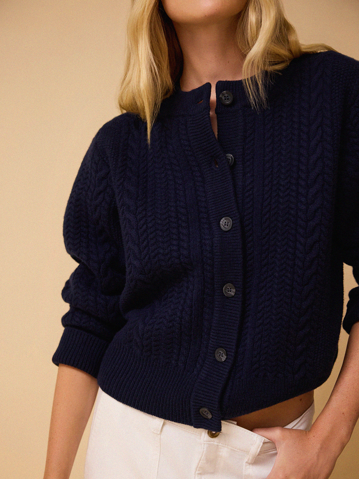 New for spring the Blair button down cardigan channels a collegiate preppy style in the cosiest way. Spun from a chunky merino wool with knit detailing it buttons down the front and is fitted for a nonchalant slightly oversized silhouette. A go to weekend style to take you from a blustery day on the beach to a pub lunch.