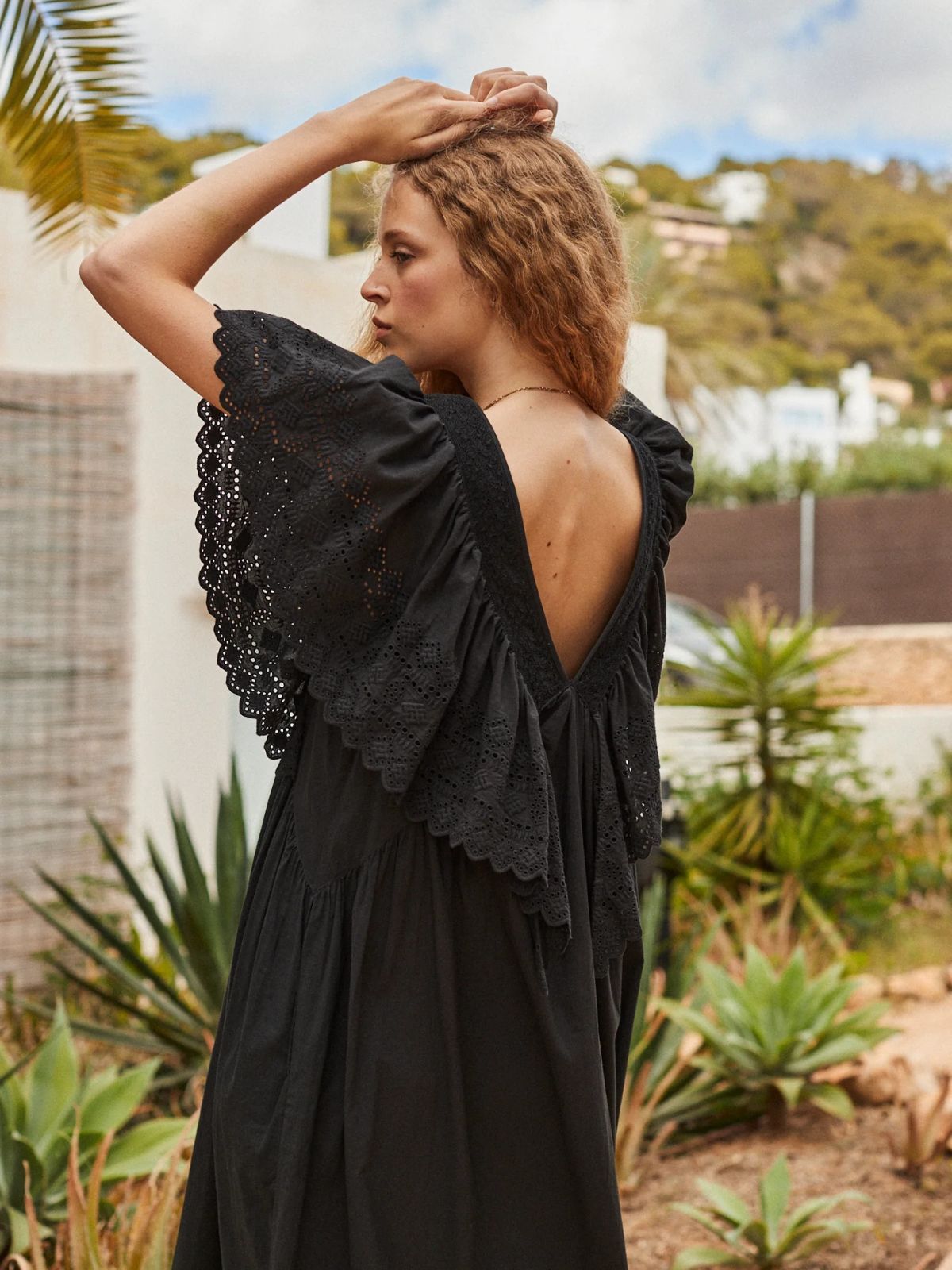 This stunning cotton dress features lovely schiffli cotton lace frills that elegantly cascade like 'wings' in the back. The Camelia dress is a popular choice among customers and has become a signature style for Faune. An extremely flattering shape, this romantic dress is perfect for any occasion, whether you're lounging at home or soaking up the sun