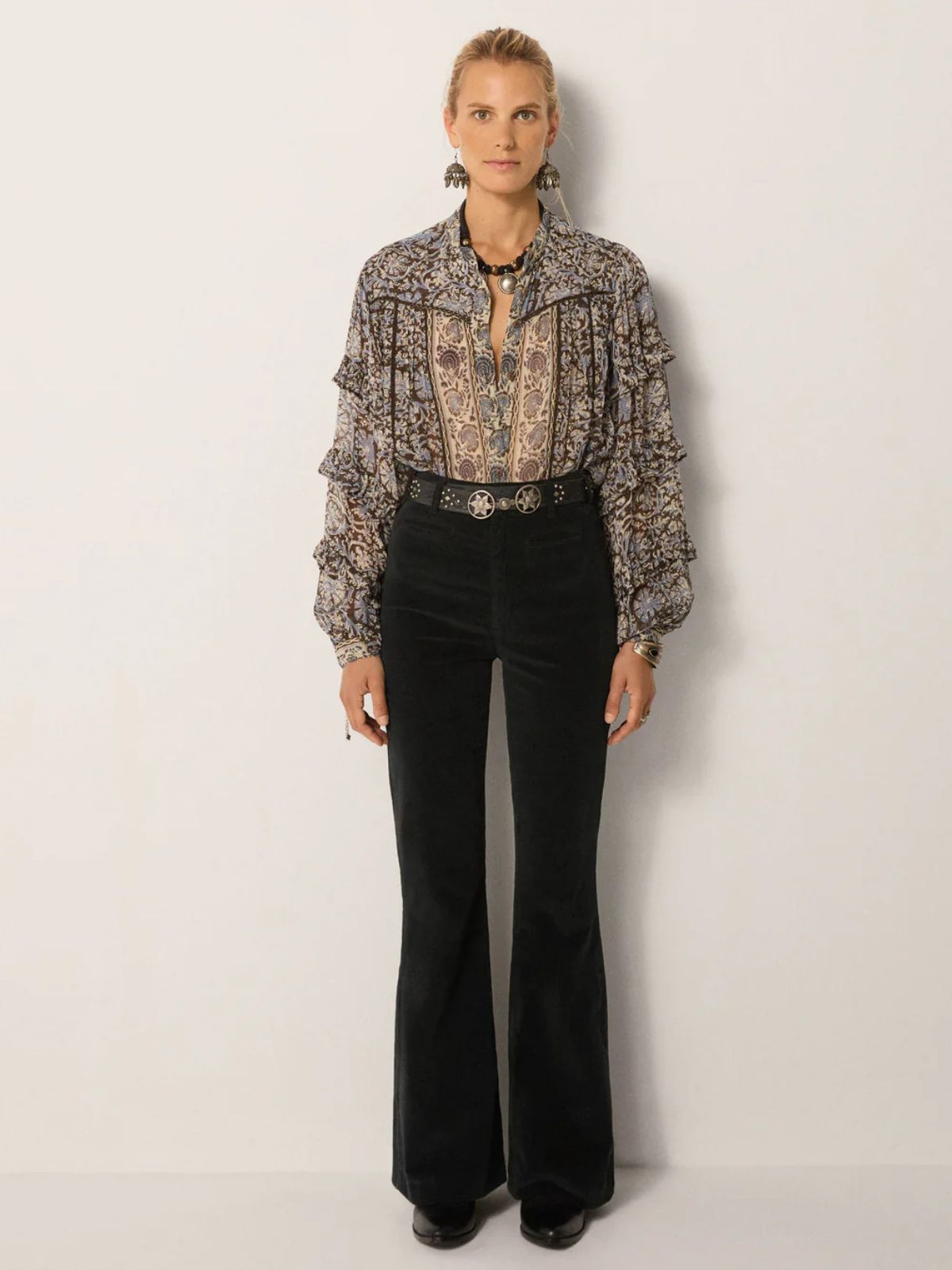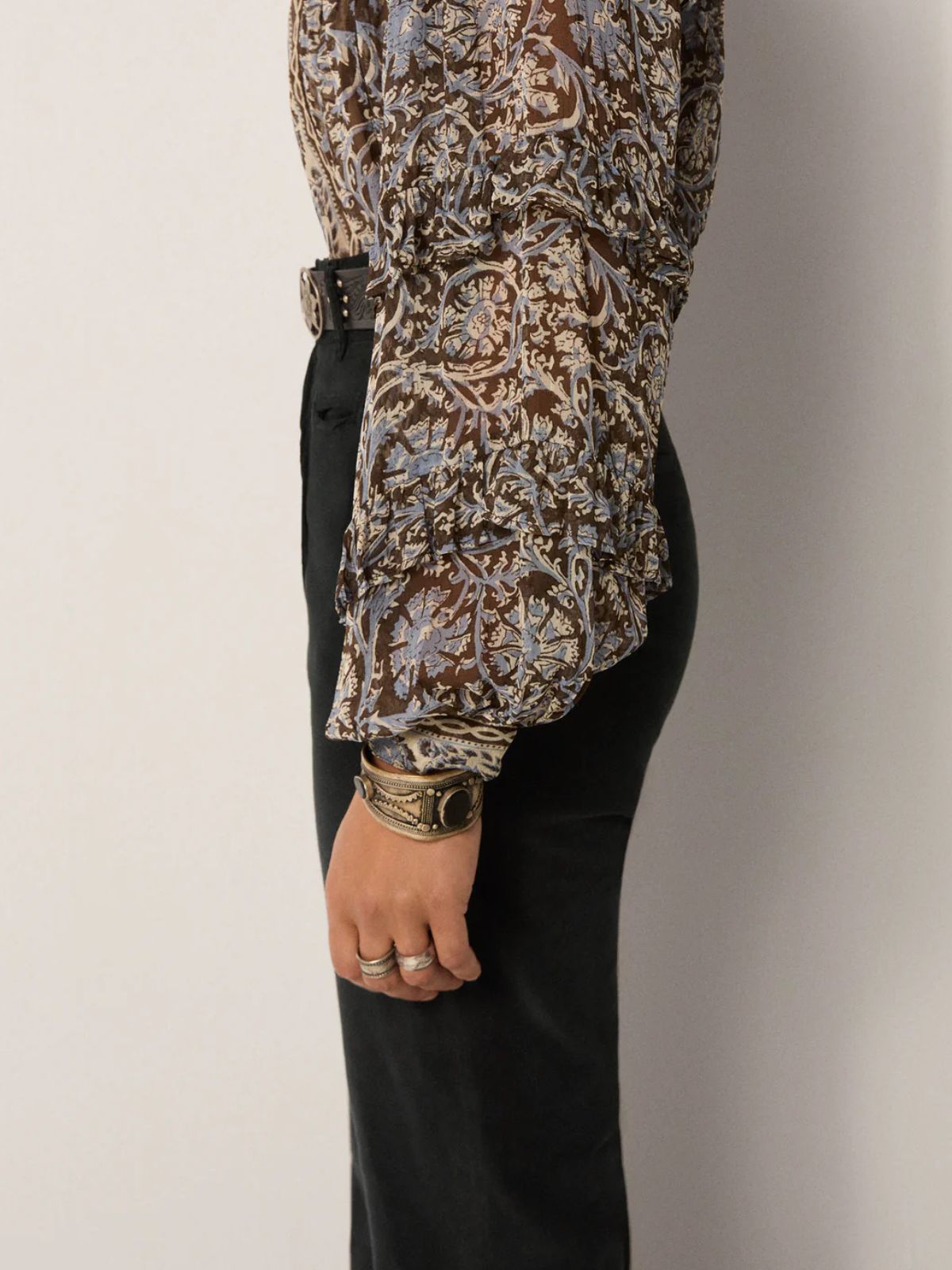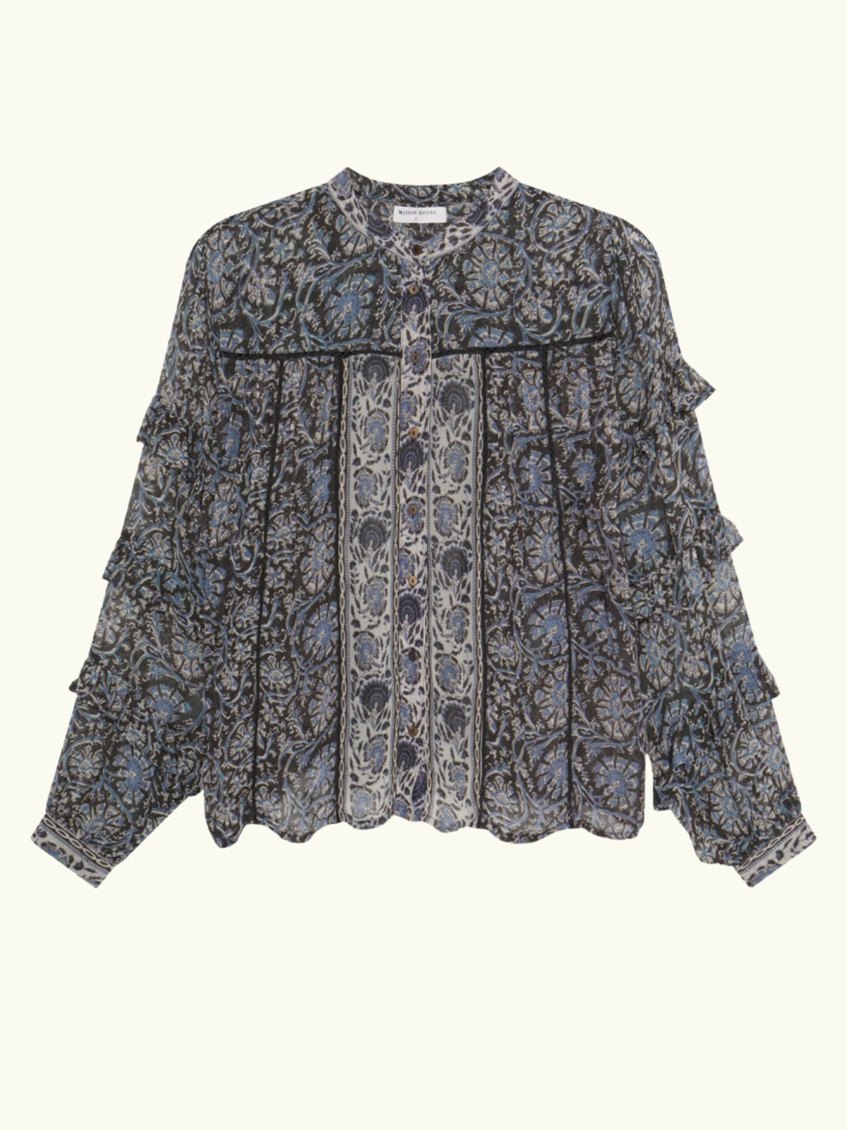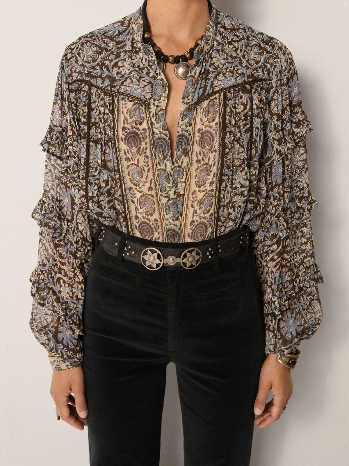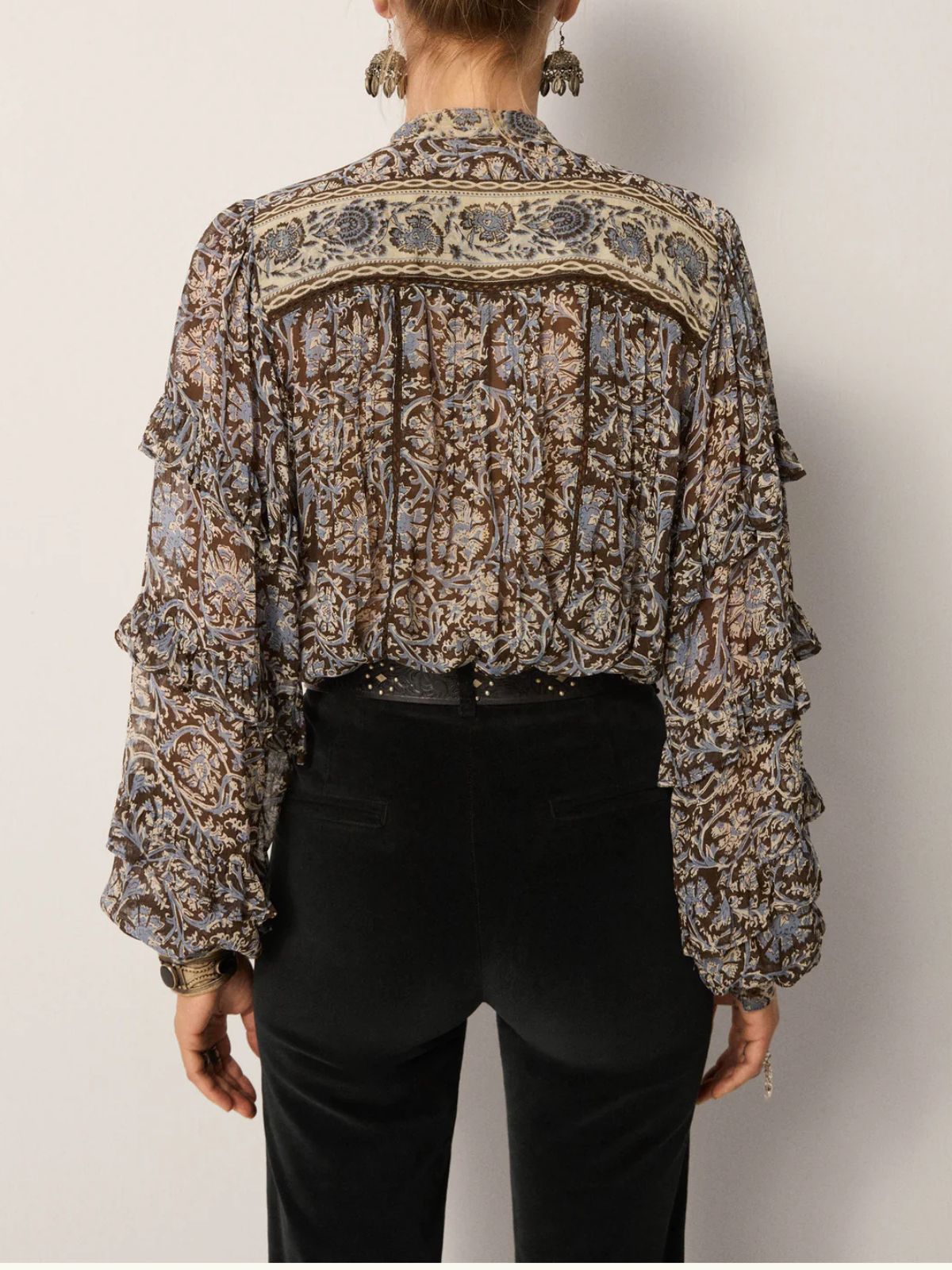 The Camilla Blouse in Blue Orchid is crafted from soft georgette with a light, sheer quality that moves gracefully with you. Its muted shade offers a gentle, bohemian feel. The long sleeves end in flirty ruffles, with extra ruffle panels along the arms adding a lively bounce as you move. The collar can be worn open or buttoned up, giving you options to match your mood.