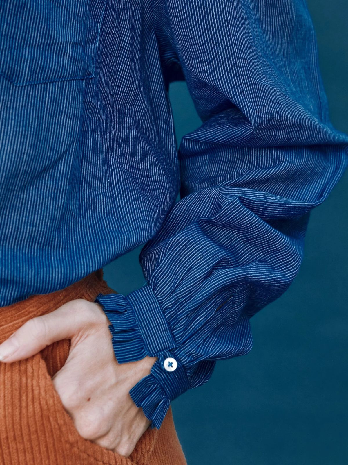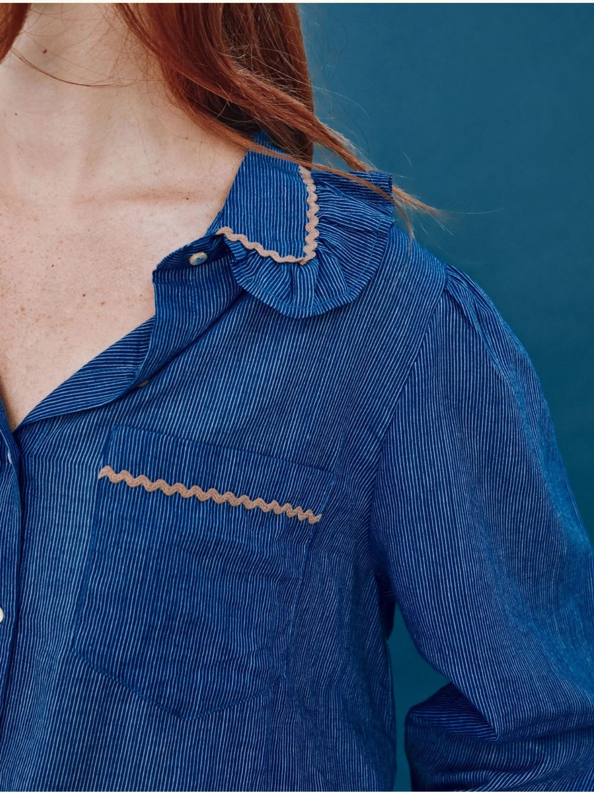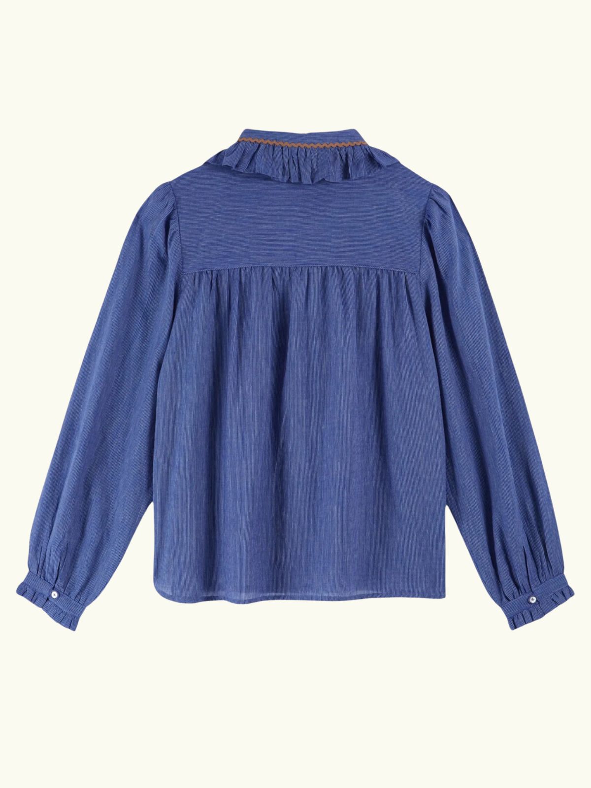 This Cassadre blue cotton blouse is striped with delicate white lines and sprinkled with sweet details such as piping around the yoke, playful ruffles framing the collar and cuffs.