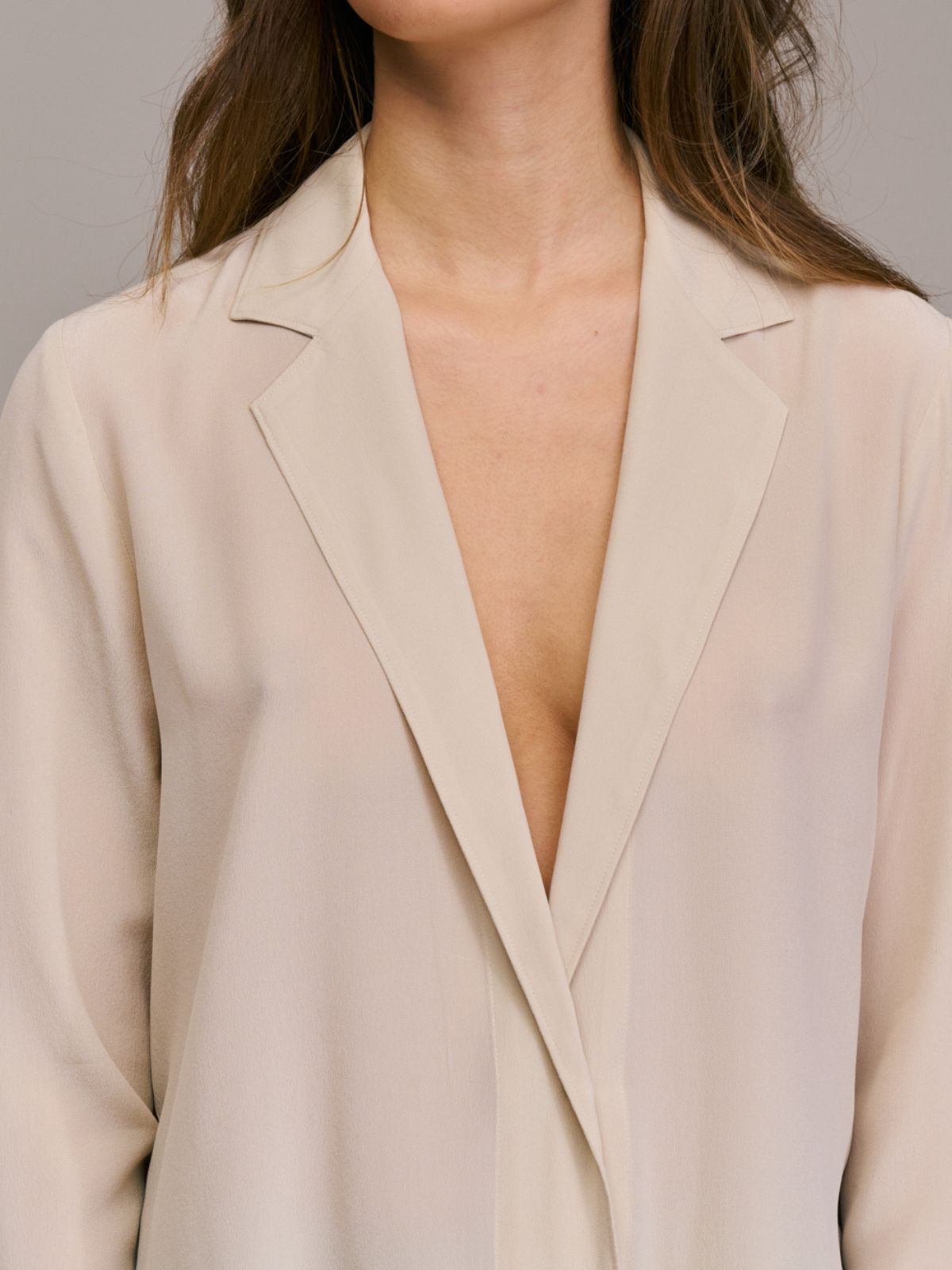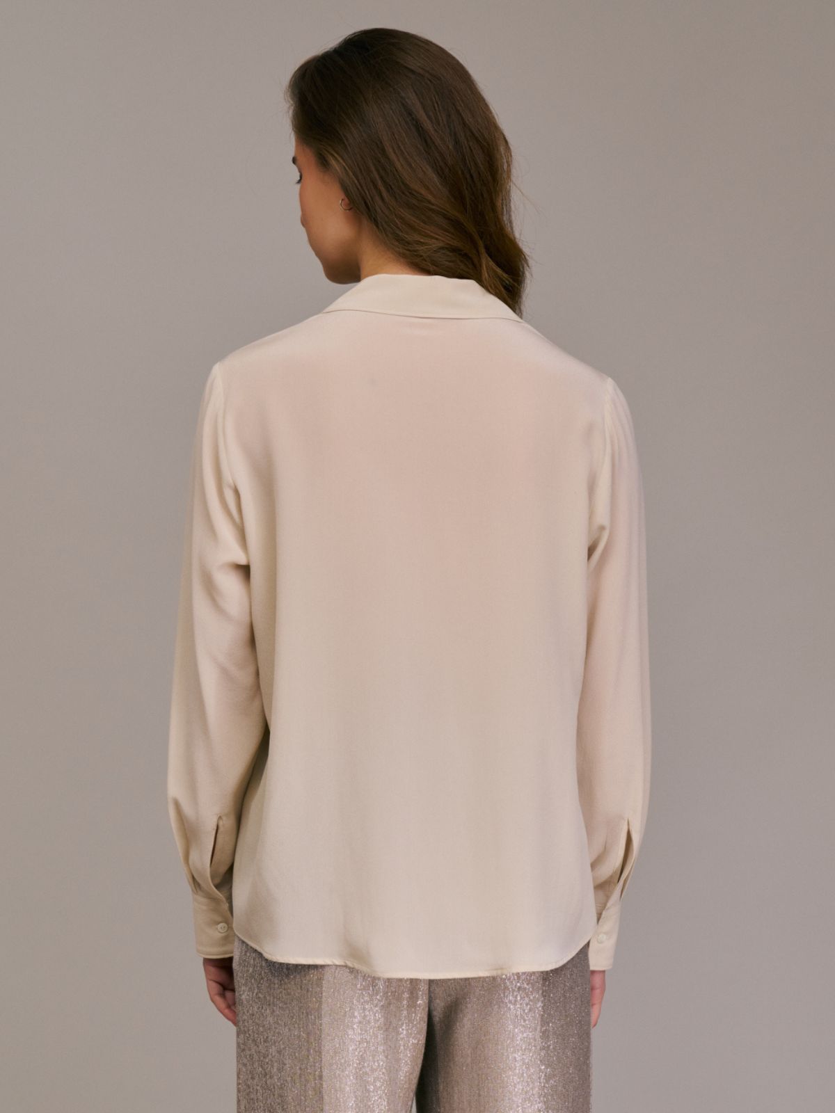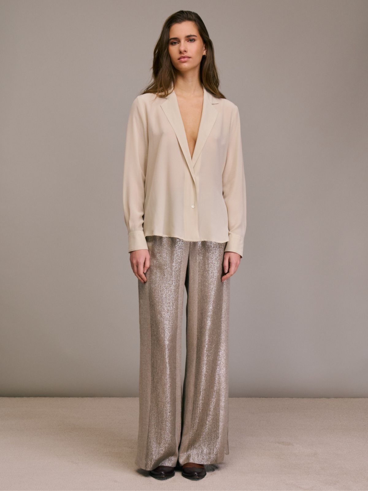 Add a splash of playful elegance to your closet with the Castia Deep V-Neck Shirt, crafted from 100% silk in a soft ecru hue. Its smooth, lightweight fabric flows beautifully, bringing a touch of fun sophistication to any outfit. Ideal for brightening both your workday and evening plans, this timeless shirt combines comfort with a lively, stylish flair.