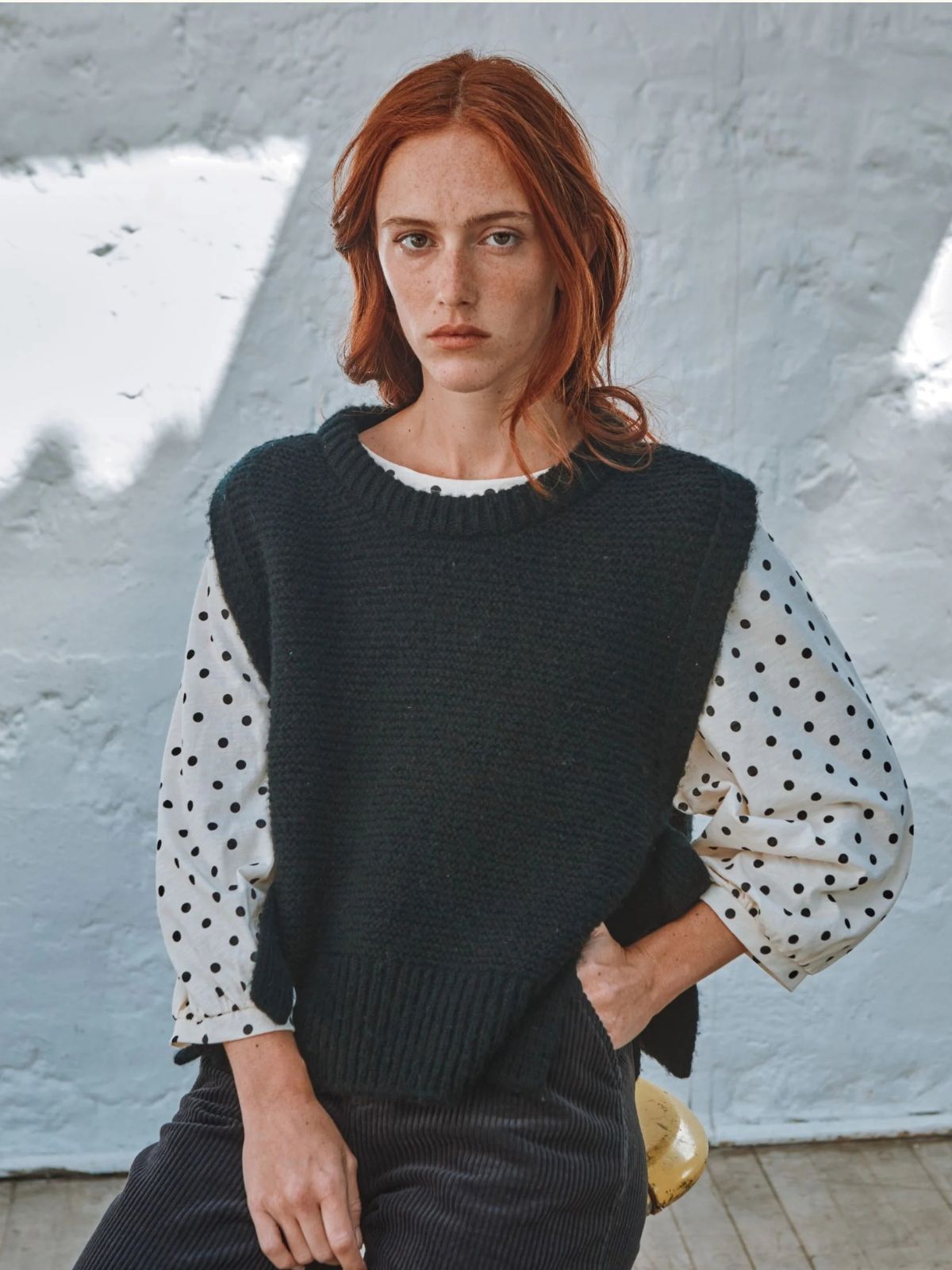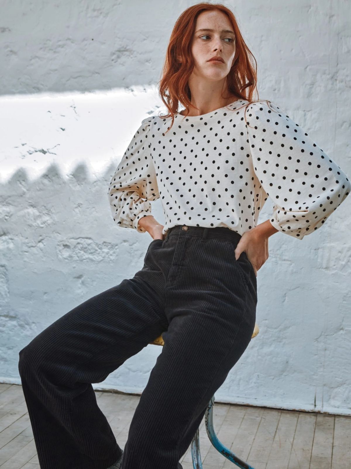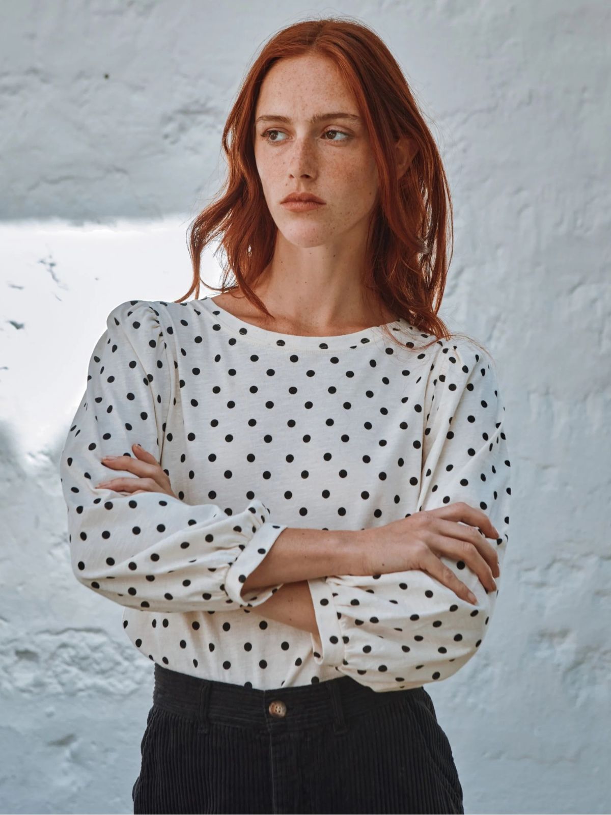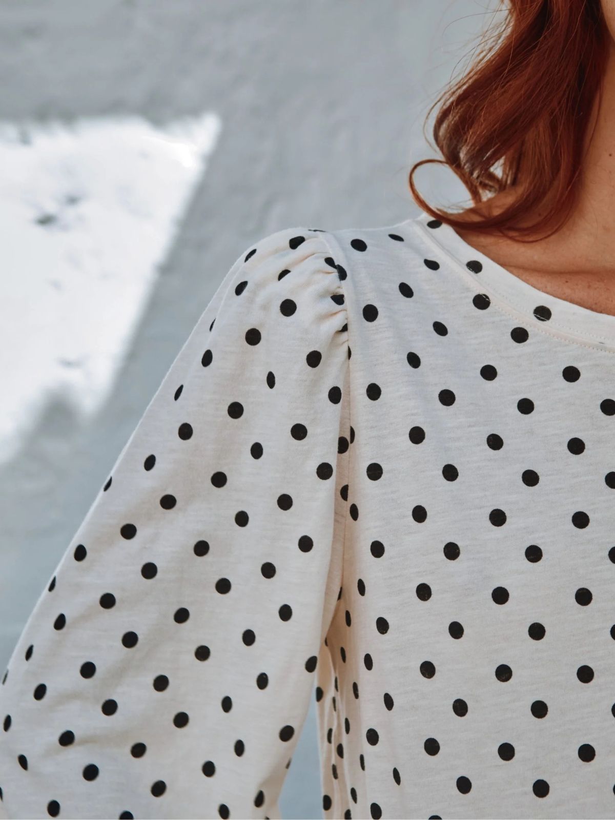 Embrace understated elegance with the Cayda Polka Dot Top, crafted from organic cotton jersey for exceptional softness. This long-sleeved blouse features a refined straight cut and a classic round neckline, while puff sleeves with gathered cuffs add a subtle, sophisticated volume.
