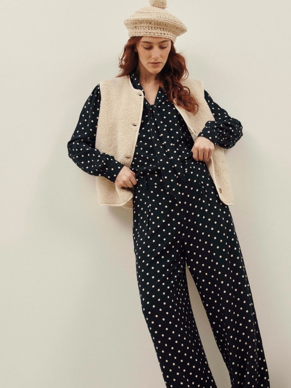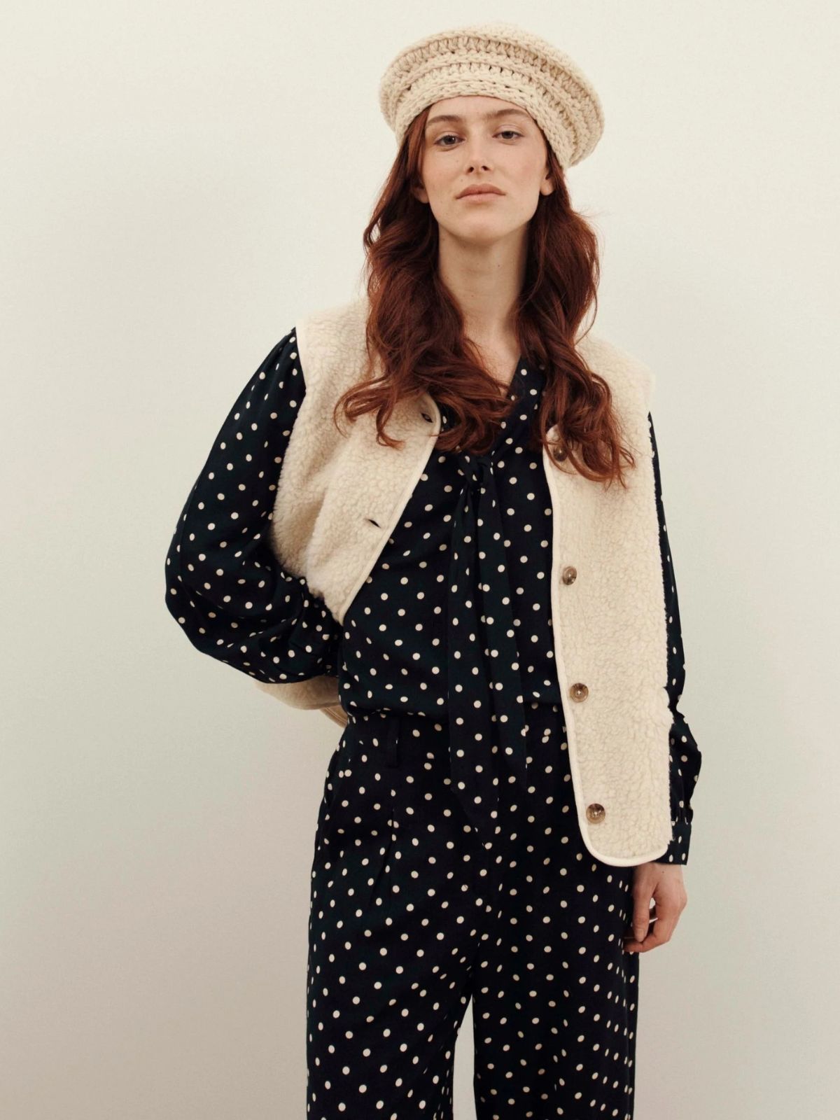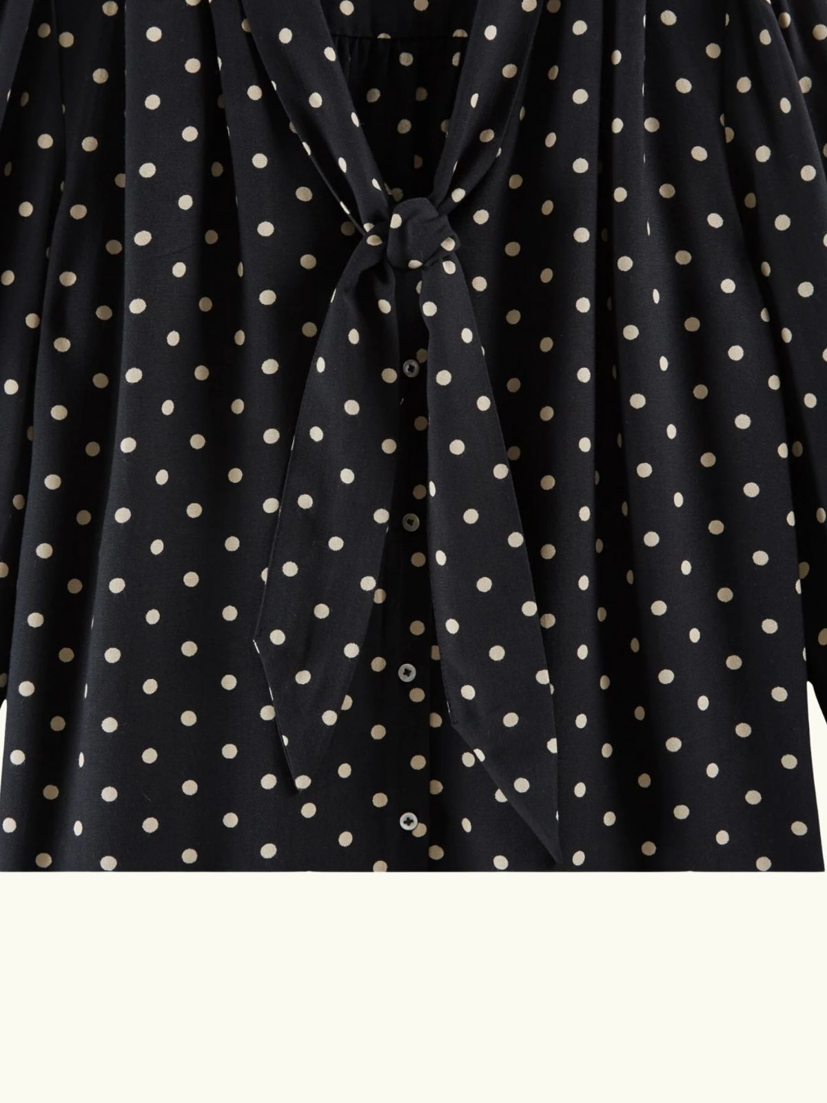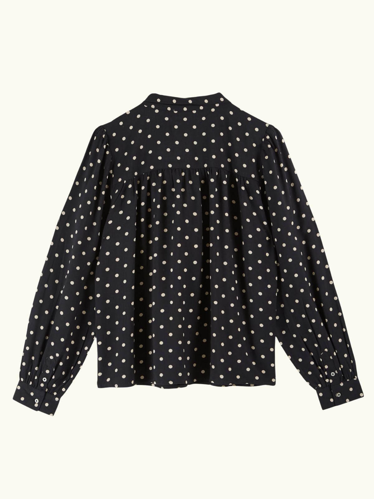 Bring a touch of sweet chic to your wardrobe with the Cecile Polka Dot Shirt. This black silky blouse features white polka dots and playful wide pleats on the shoulders. The straight cut and V-neckline offer a flattering fit, while natural mother-of-pearl buttons and long sleeves with buttoned cuffs add elegant details. Fully lined at the back yoke for comfort, it’s a versatile piece that effortlessly combines style and ease for any occasion.