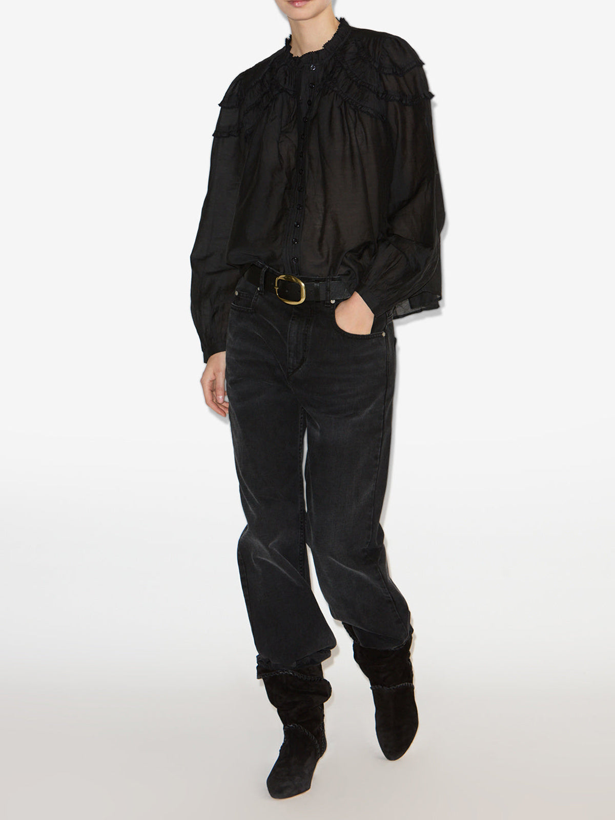 The Christa Blouse in black captures Parisian sophistication with its gathered cotton blend fabric and relaxed fit. Designed with a round neckline featuring gathered finishes, it highlights subtle front and shoulder gathers for refined texture. The buttoned front and long sleeves with slim buttoned cuffs enhance its tailored appeal, while the rounded hem adds a graceful touch. This blouse offers a versatile, elegant option for a polished wardrobe.