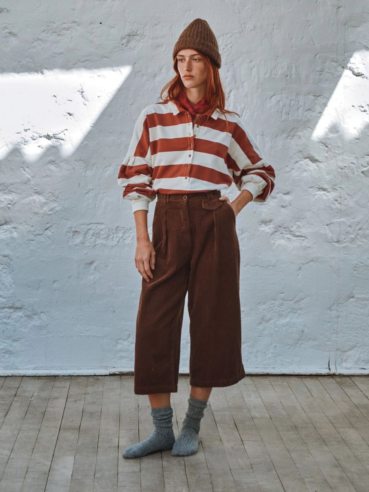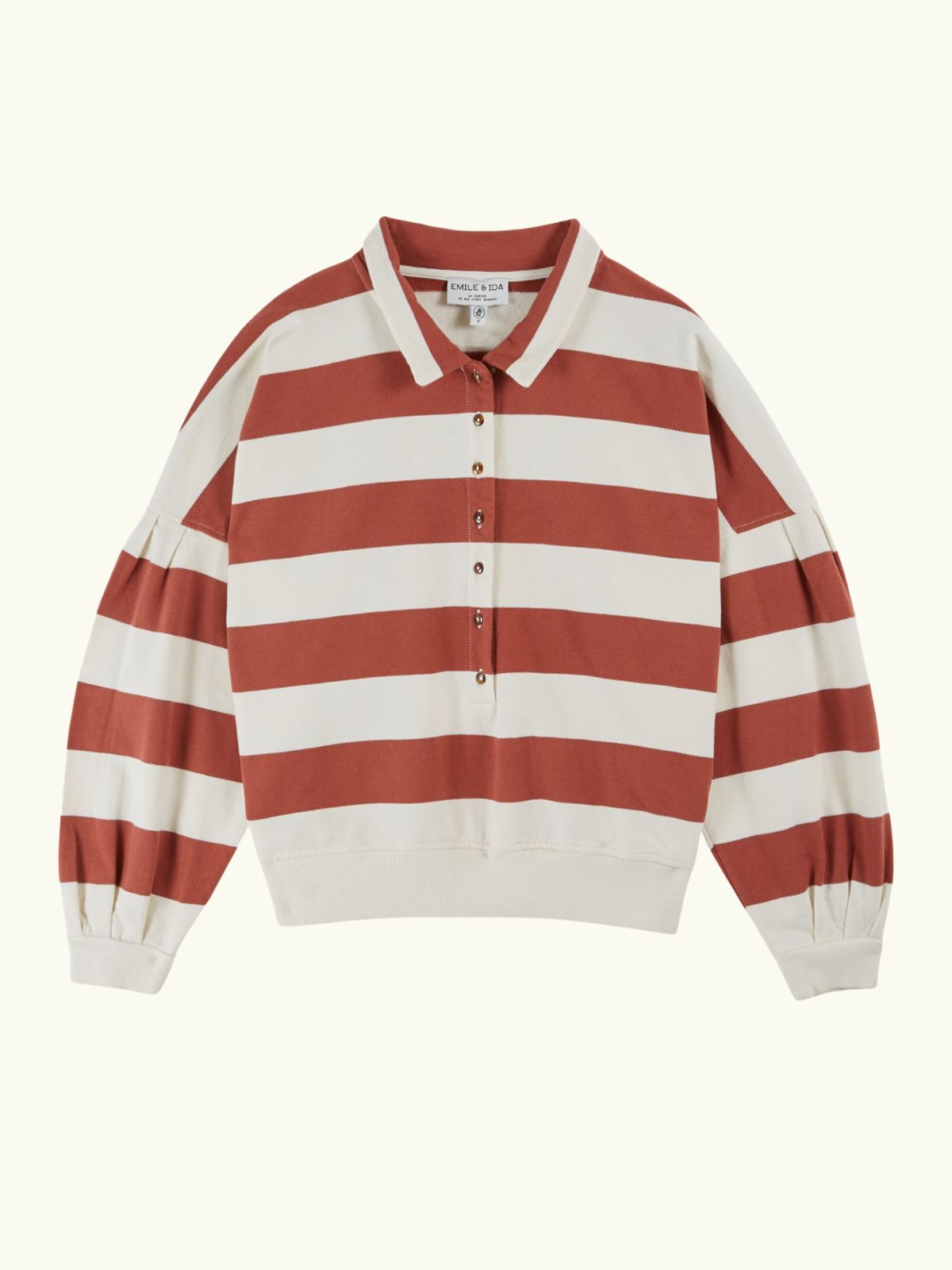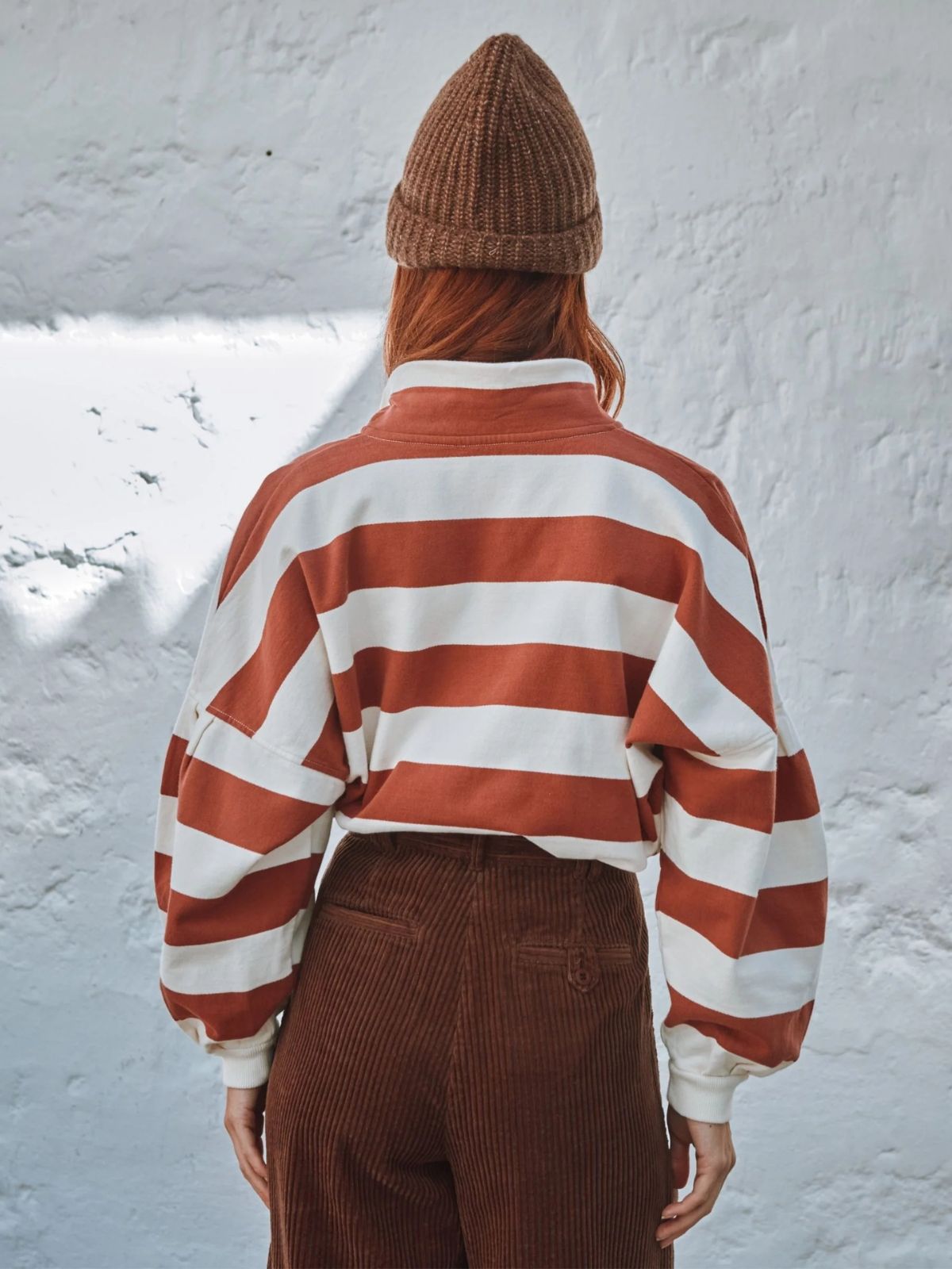 Embrace laid-back style with the Clement Stripe Polo Jumper. Made from soft, fleecy organic cotton jersey, this oversized sweatshirt plays with ecru and brick stripes for a cheerful, casual look. The polo collar and tiny button placket add a quirky touch, while the long, wide sleeves and ecru-ribbed hem and cuffs wrap you in comfort. It’s your go-to jumper for cozy days filled with style and personality.