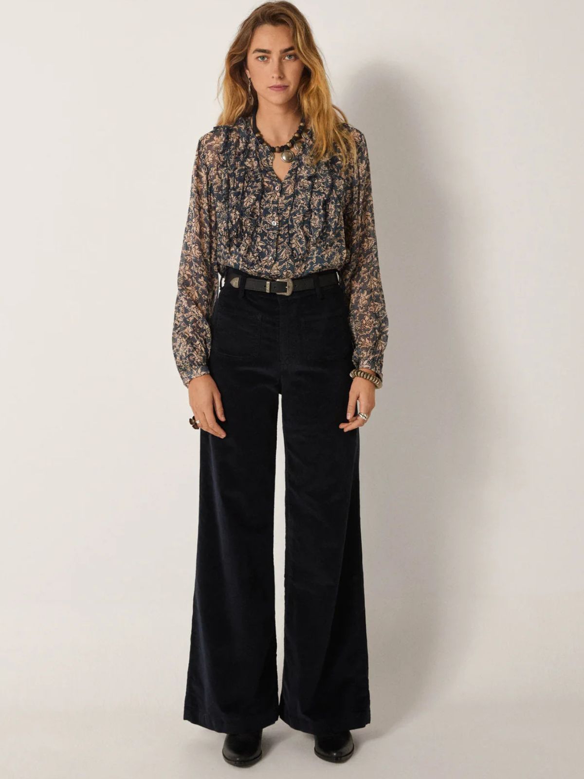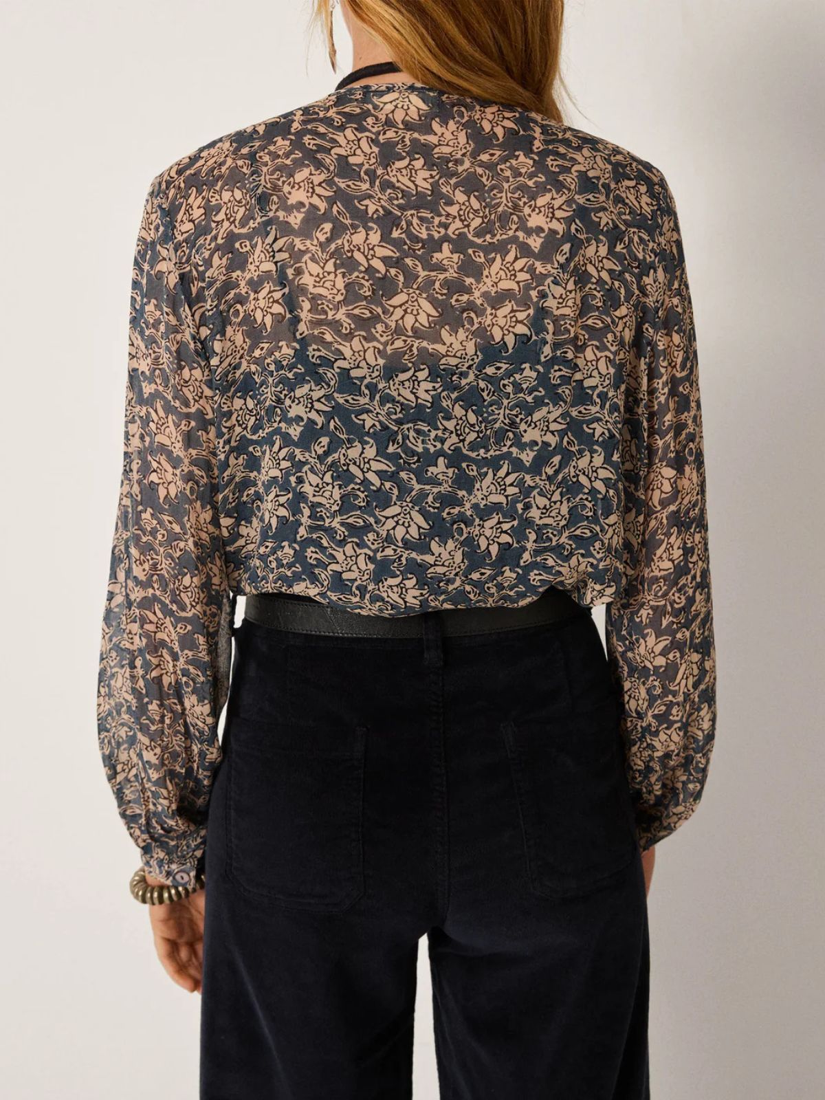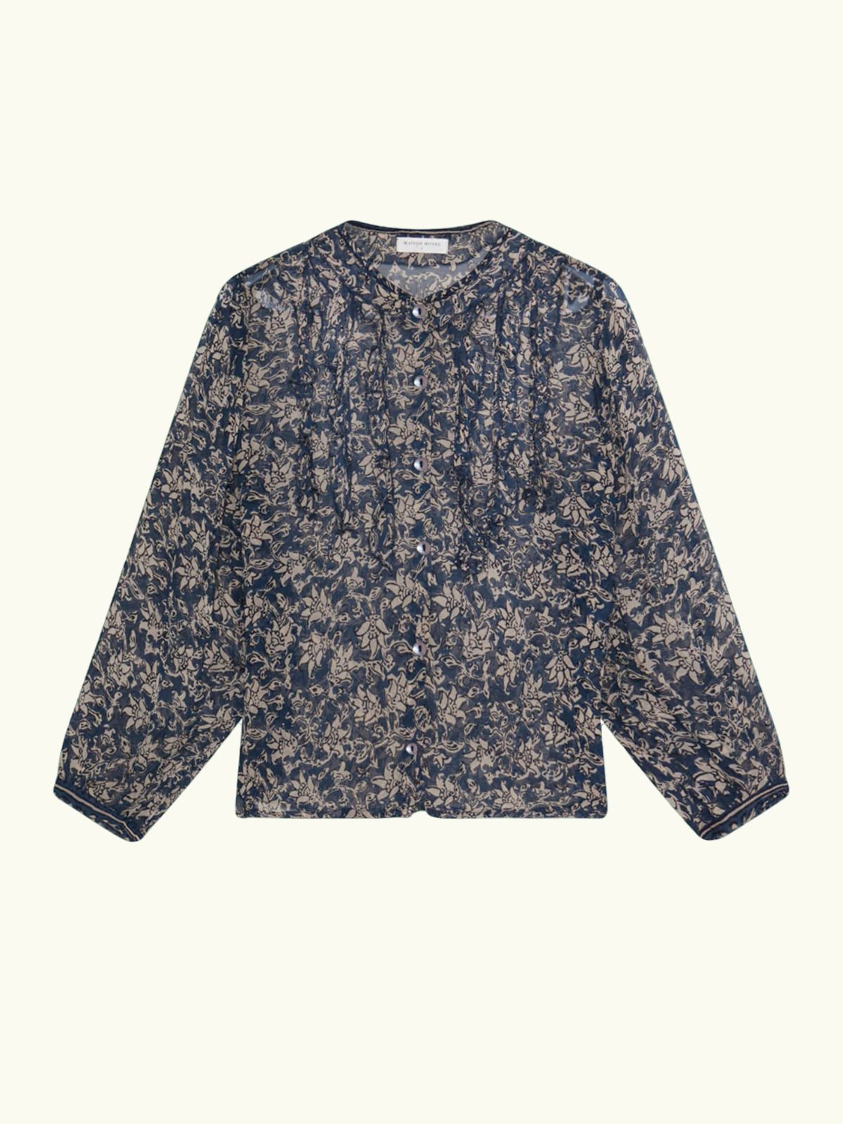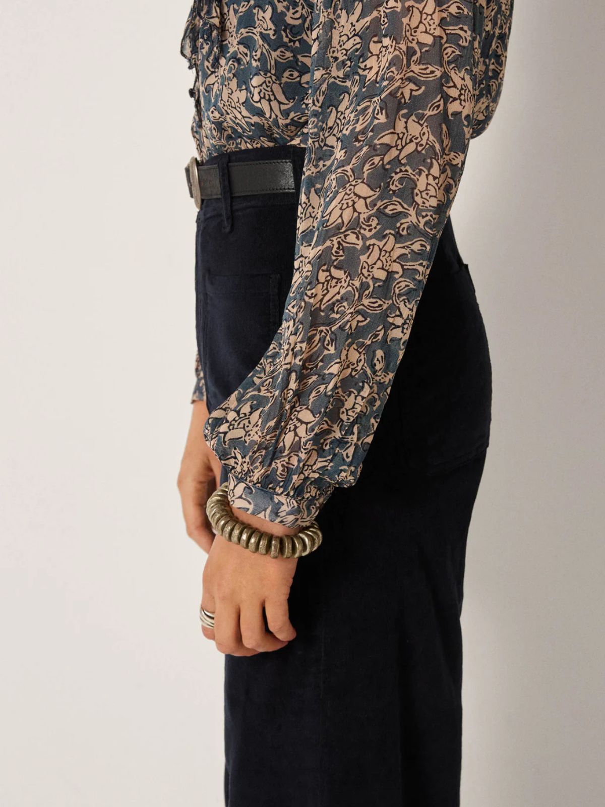 The Corina Print Shirt in teal offers a sophisticated blend of lightness and elegance. Crafted from semi-transparent georgette viscose, it features a delicate sand-toned floral print set against a rich teal background. Subtle ruffles adorn the front, adding fluidity and texture, while the loose silhouette and gathered sleeves create graceful shaping and refined detail. This blouse combines effortless style with understated charm, perfect for elevating any wardrobe.
