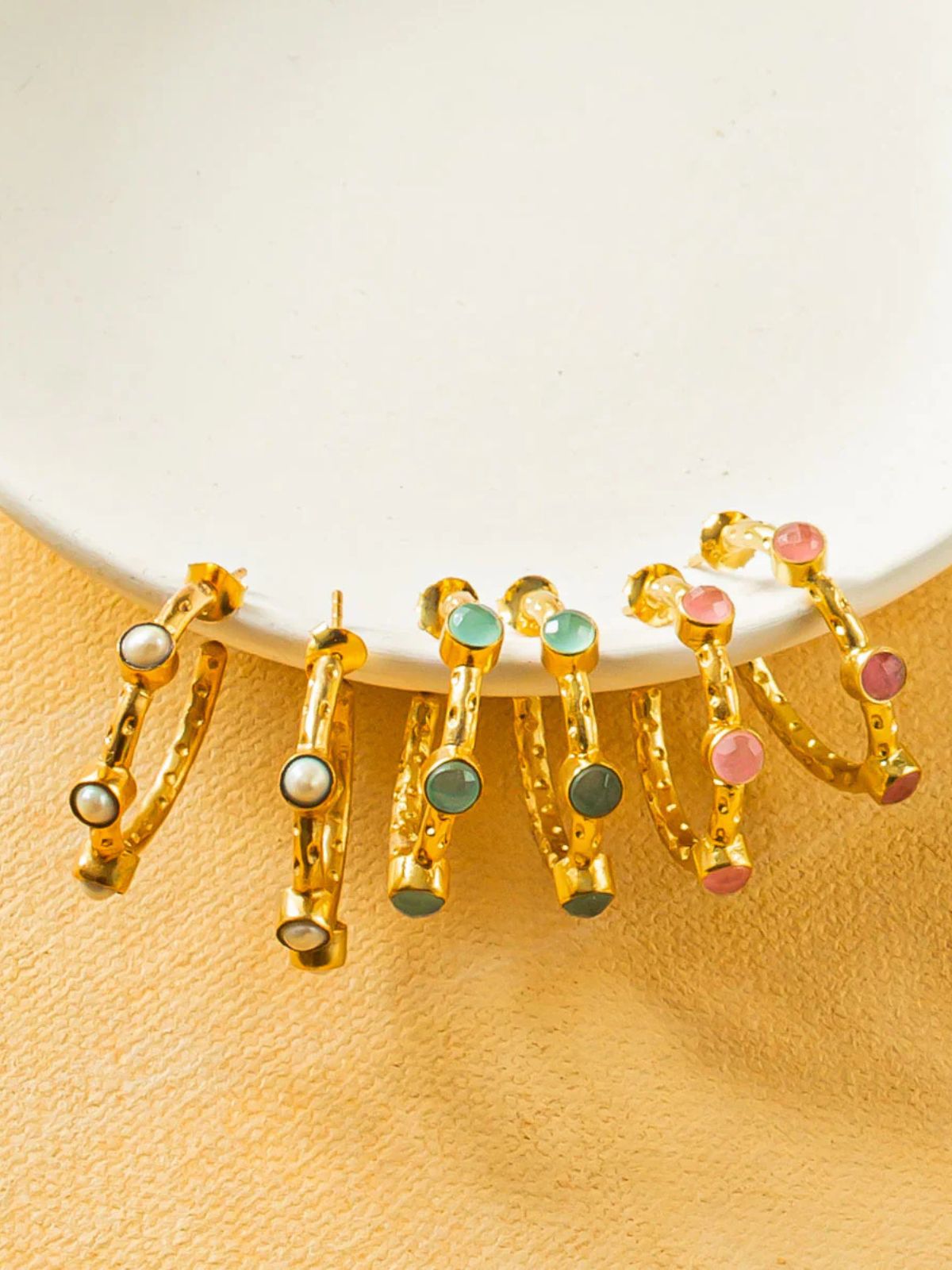 Handcrafted by artisan jewellery makers and set with three tiny semi precious gemstones, these textured gold hoops suit any occasion, from home and work to holidays overseas.