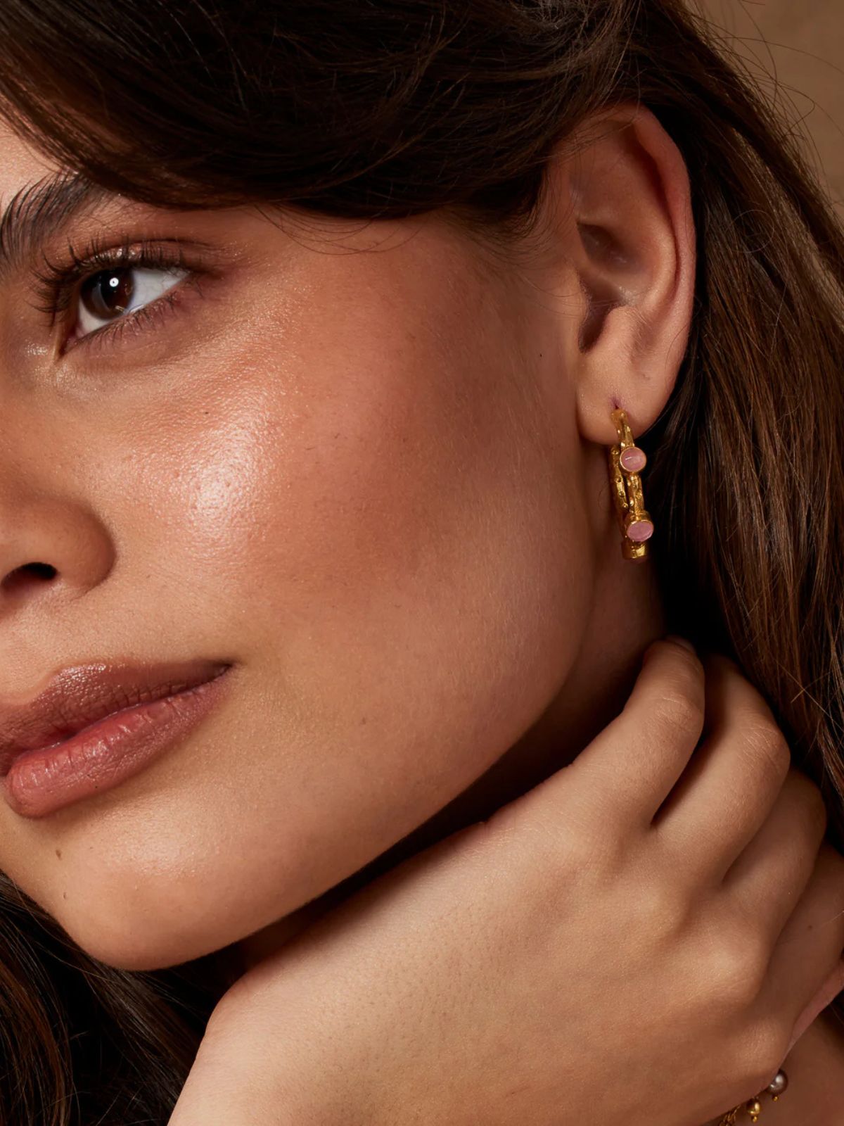Gold hoop earrings with set pink jade gemstones
