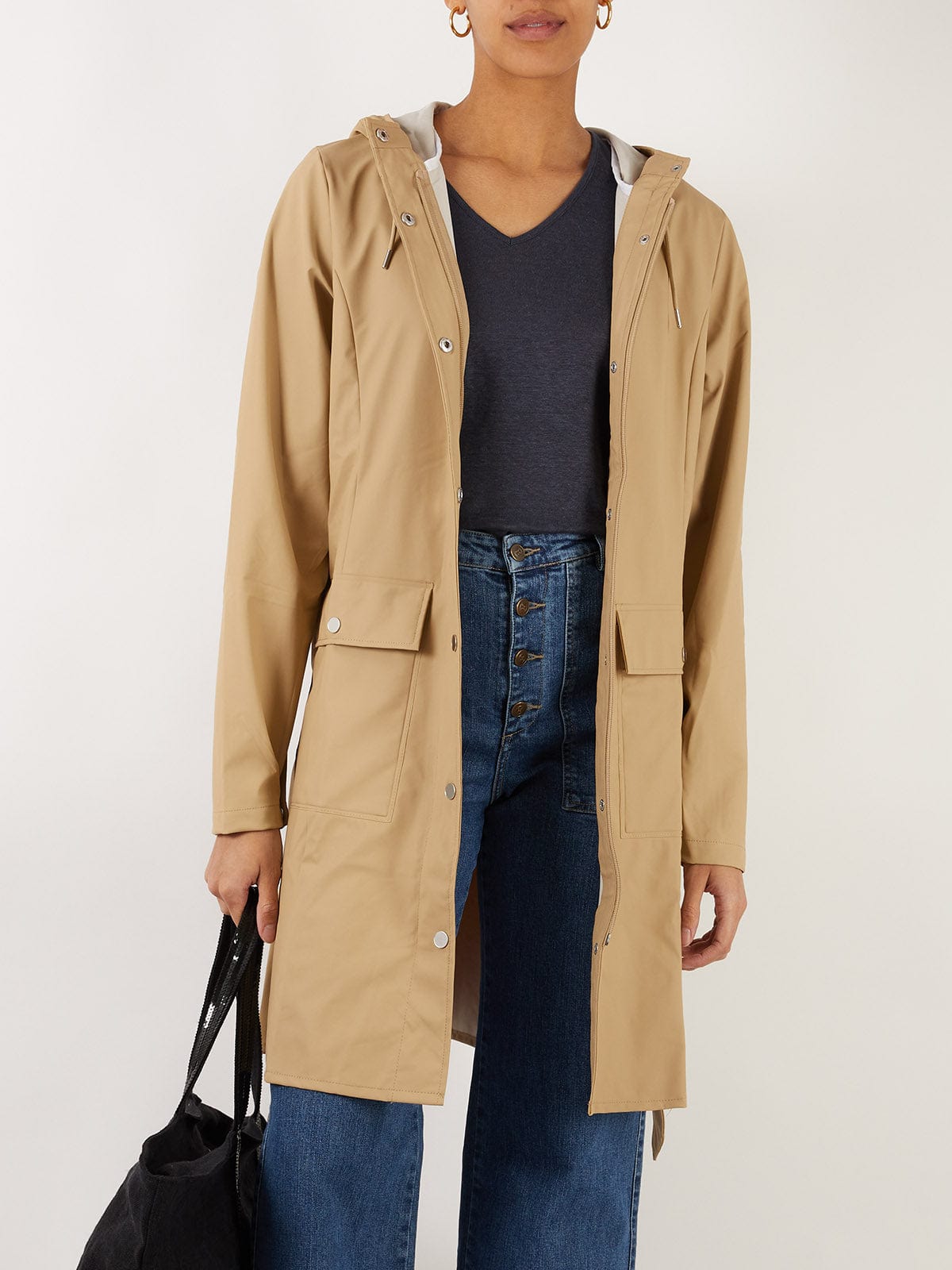 The curve jacket is RAINS interpretation of a classic trench. The minimal design delivers a figure-flattering silhouette, with its subtle a line fit and waist belt. Curve Jacket features a drawstring hood with cap brim, main zip closure with snap fastened placket, adjustable cuffs, and a fishtail hem. The look is completed with two front patch pockets.