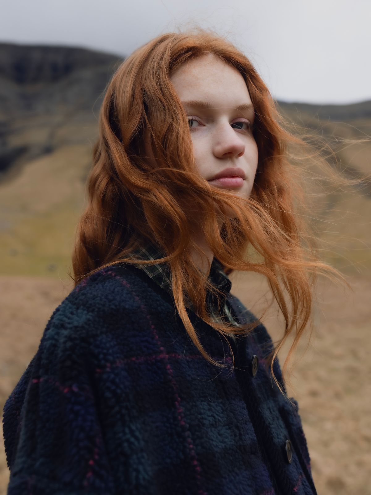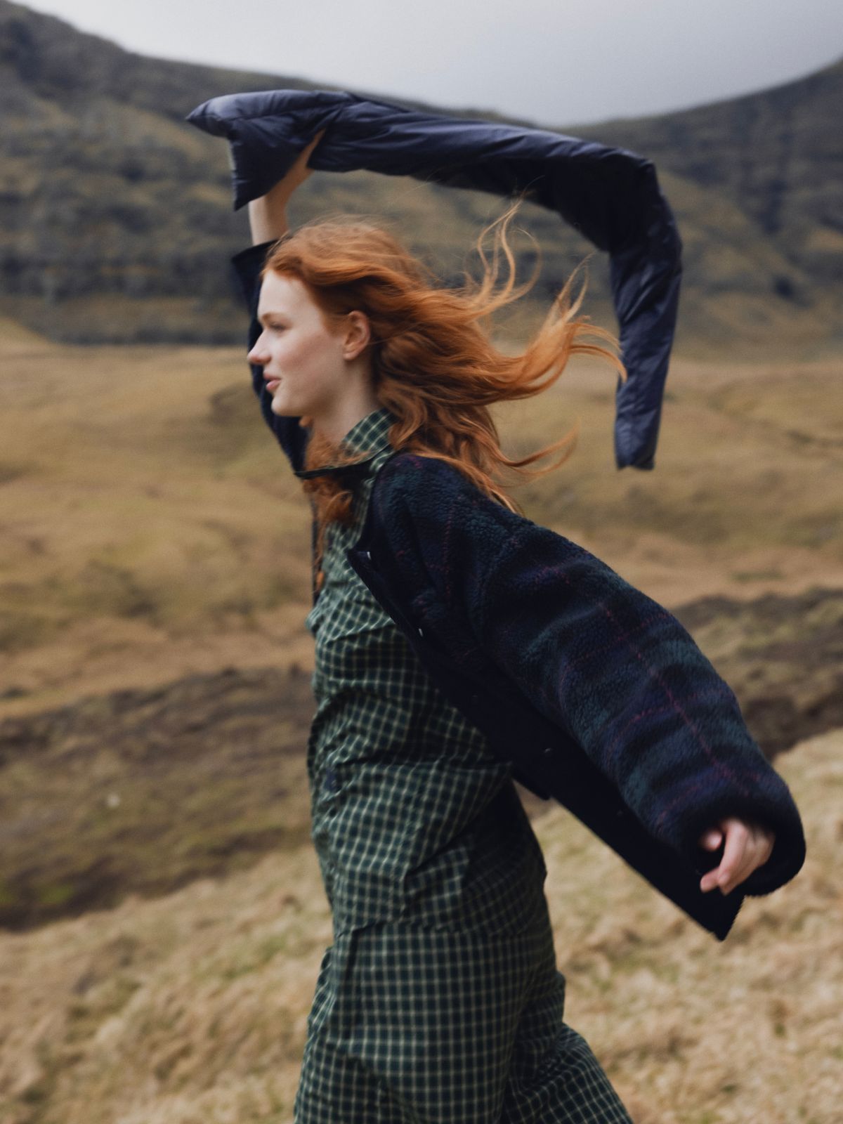 This Dalida Check Jacket in navy features a chic all-over check pattern with subtle rust lines for added depth. Crafted from soft fleece, it offers warmth and style, while three front patch pockets provide practicality. The button-up front and refined black corduroy trimming lend a polished finish, making it a versatile layering piece for a stylish, sophisticated look.
