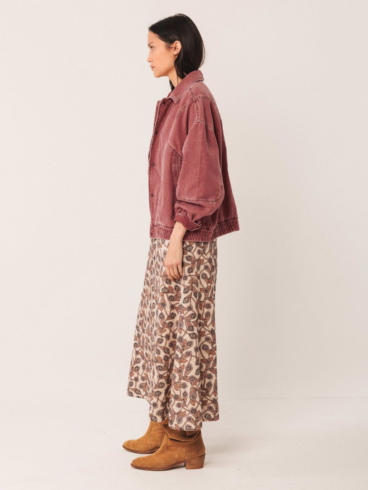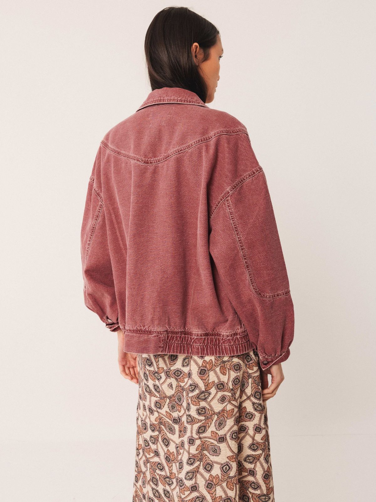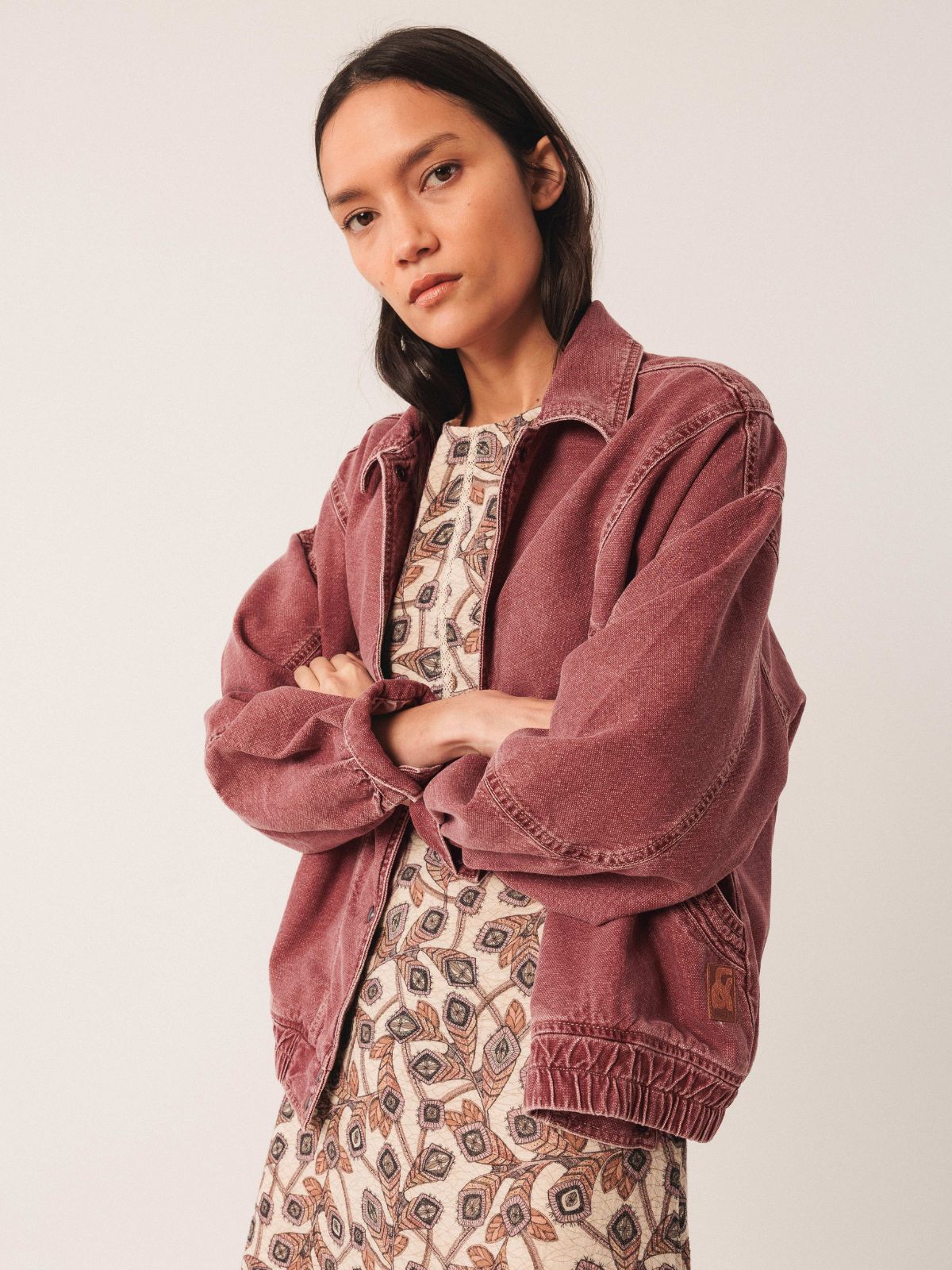 This Denim Bomber Jacket in cherry combines a soft, washed cotton twill fabric with a worn-in look that exudes understated elegance. It features a classic shirt collar and snap front closure for a clean, refined finish. The elastic waistband enhances the vintage-inspired silhouette, making it a versatile and chic addition to your wardrobe.