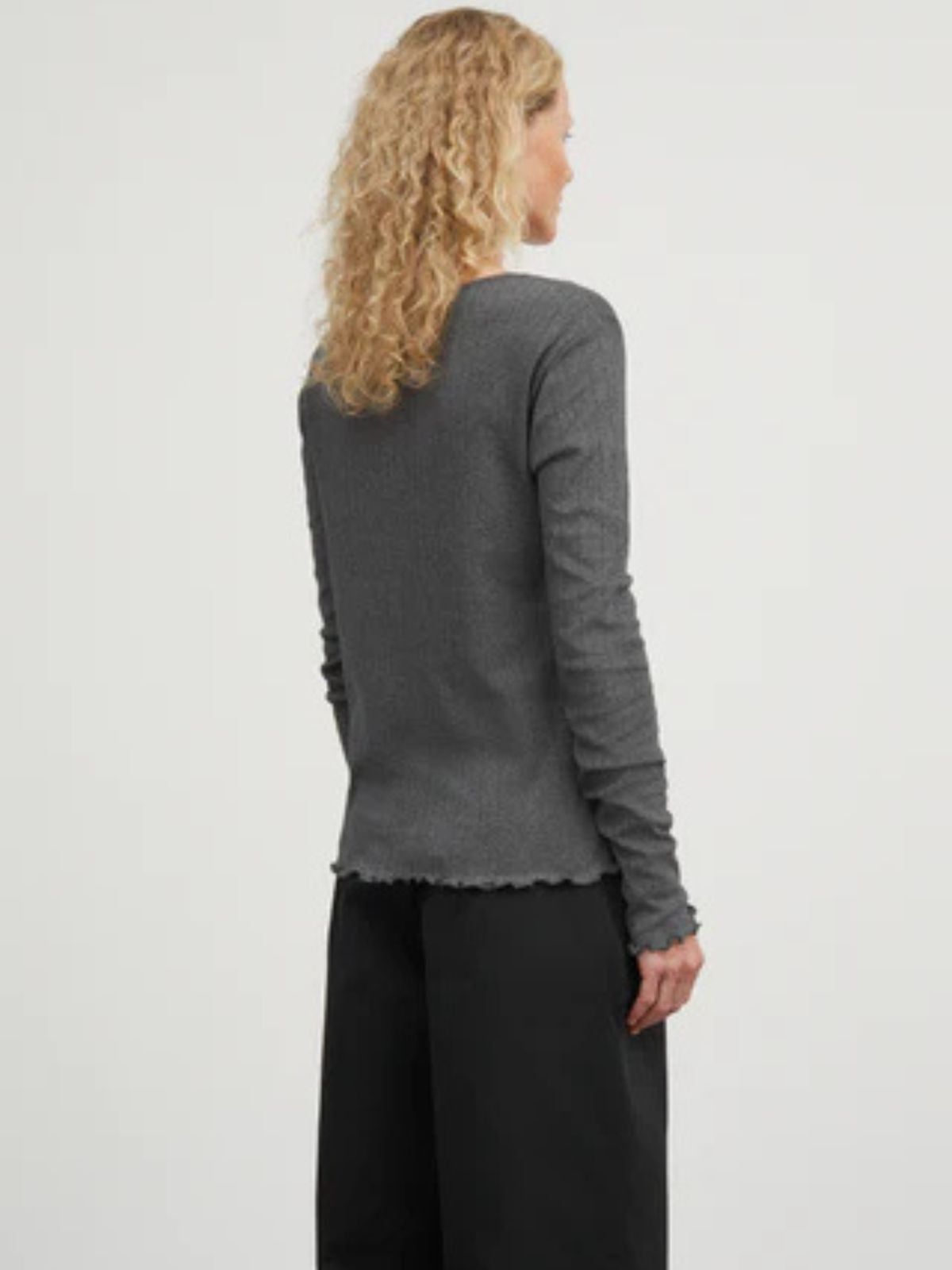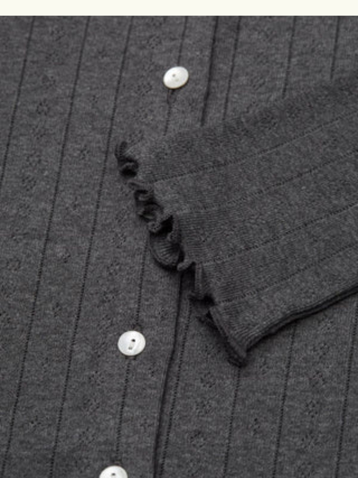 Edie cardigan in grey is made in cotton jersey pointelle. It has a classic fit with long sleeves, baby lock edges and closes with mother of pearl buttons.