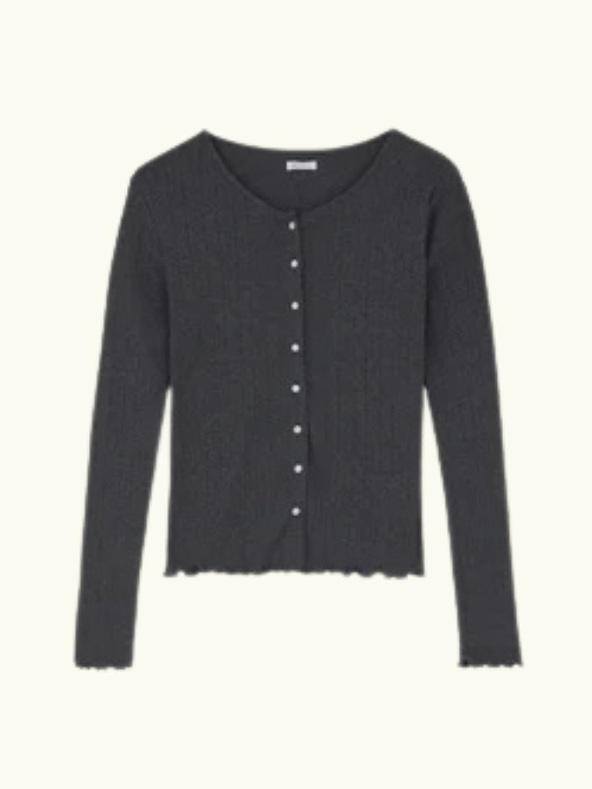 Edie cardigan is made in cotton jersey pointelle. It has a classic fit with long sleeves, baby lock edges and closes with mother of pearl buttons.