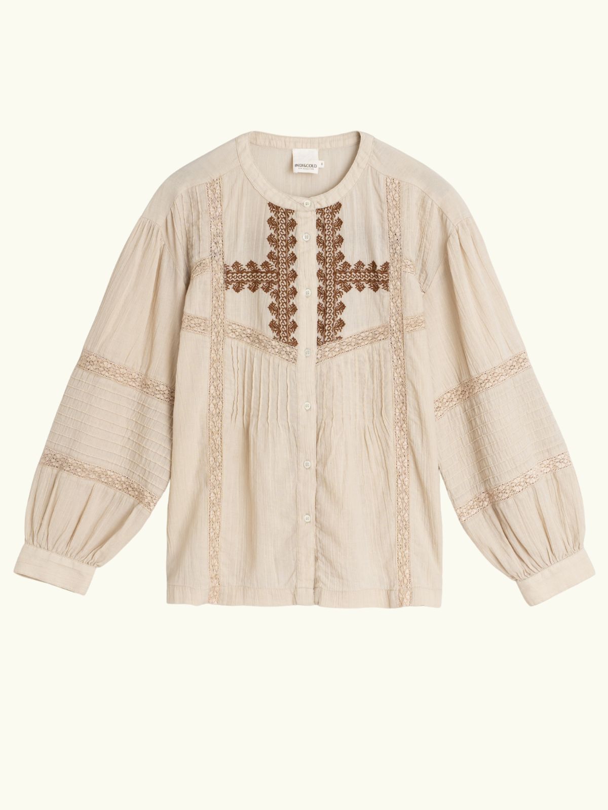 This elegant beige blouse blends subtle ethnic embroidery with delicate lace inserts and refined pleats, creating a romantic yet sophisticated look. Featuring dropped shoulders and balloon sleeves, its regular fit offers comfort alongside style for an effortlessly graceful seasonal favorite.
