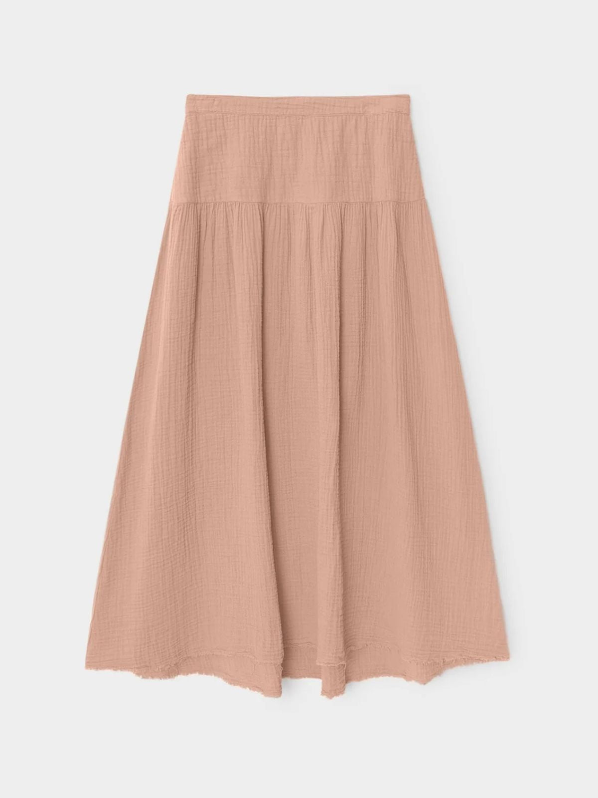 Easy Breezy. Evelyn is new this season in our washed double faced cotton gauze for a soft, gently crinkled feel. Evelyn is an A-line pull on skirt with a flat front waistband and elasticized back waist, front and back yokes, and raw edge hem.