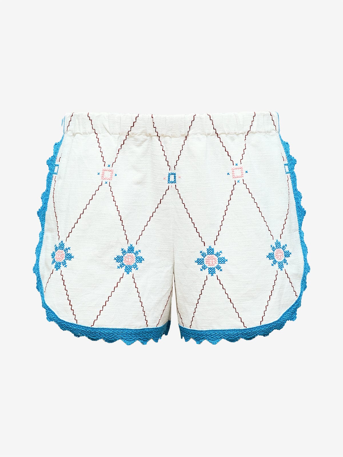Introducing the Fae shorts in an ecru cotton-linen blend with embroidered flower pattern and contrast hem trim in a bright sea blue. Pair with the Eloise top for an adorable, midsummer co-ord.