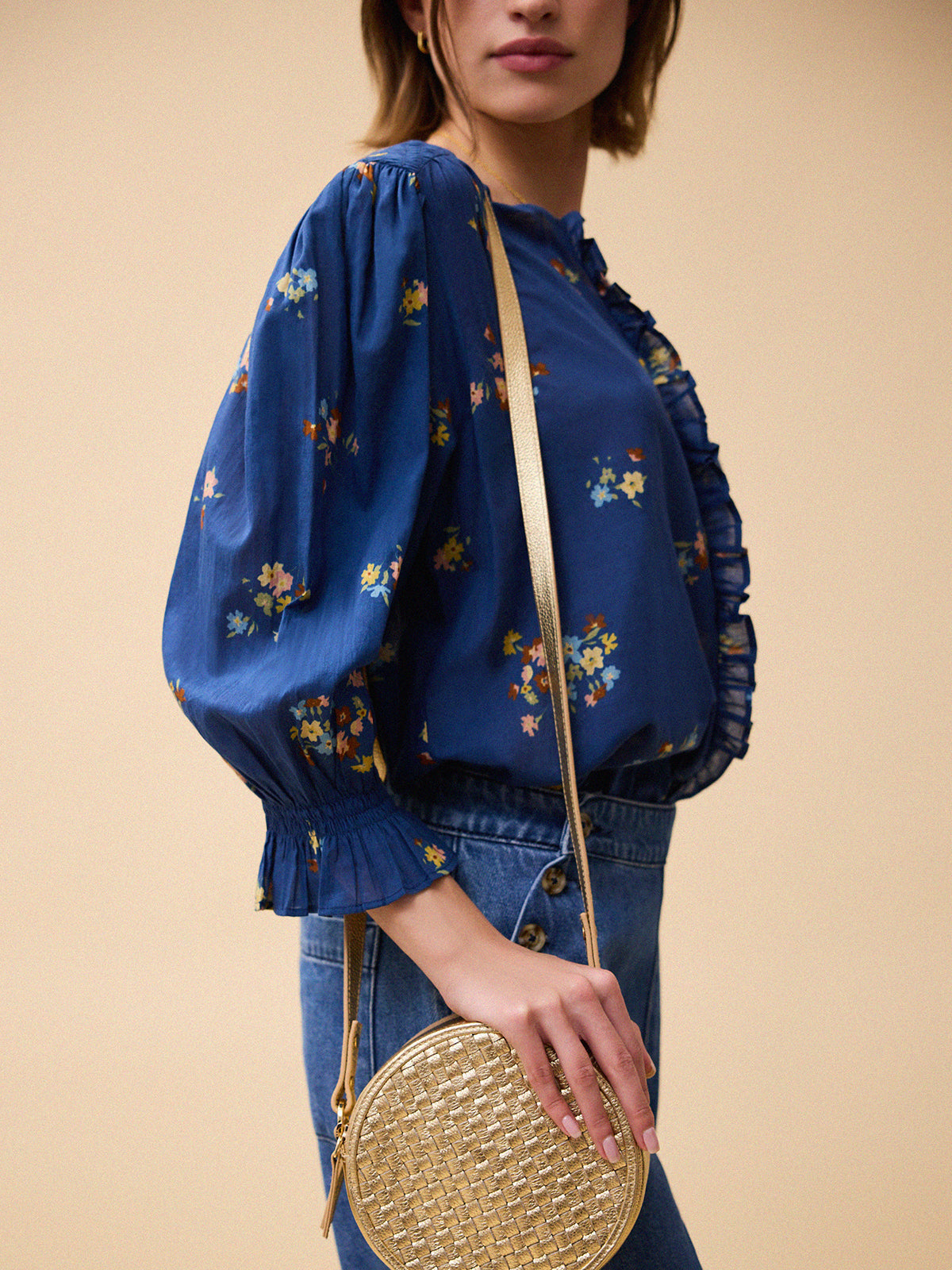 This Florence blouse is made from a cobalt-blue, ditsy-floral cotton voile and sports a relaxed fit with a mandarin collar, frilled cuffs and a smocked back panel.