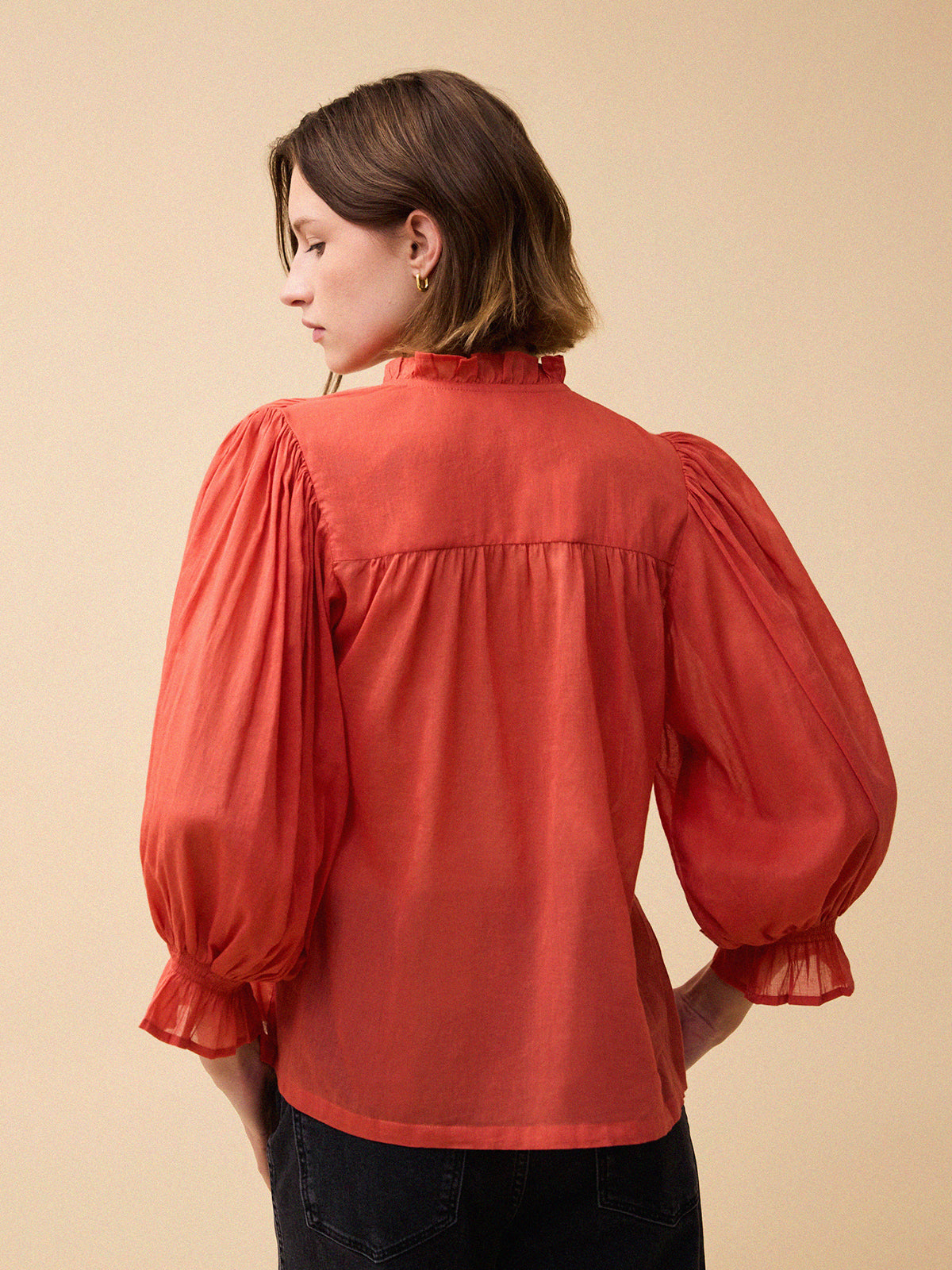 One of our bestselling blouse shapes, the Frankie, has been redefined this season with a sexy, sheer cotton-voile in a rich shade of rust red. Perfect for layering or not, she boasts a feminine, frilled collar and button placket and gathered sleeves and shoulders.