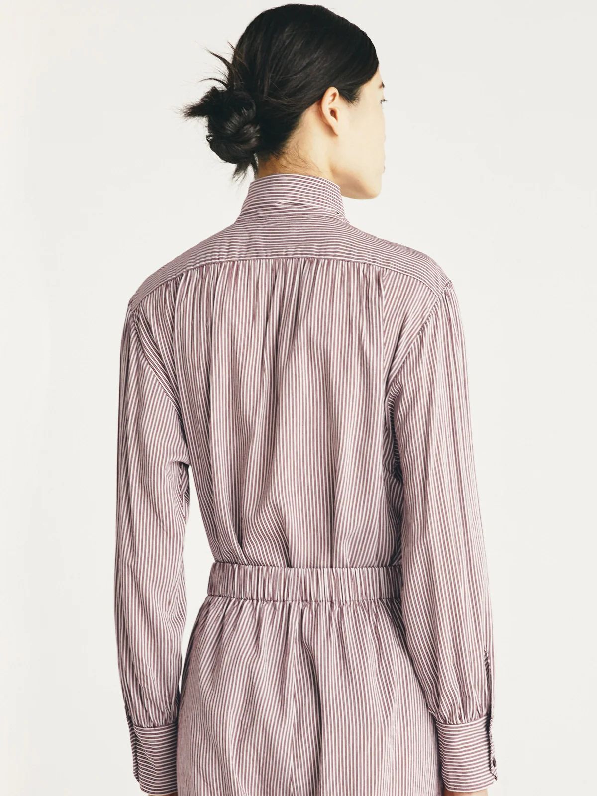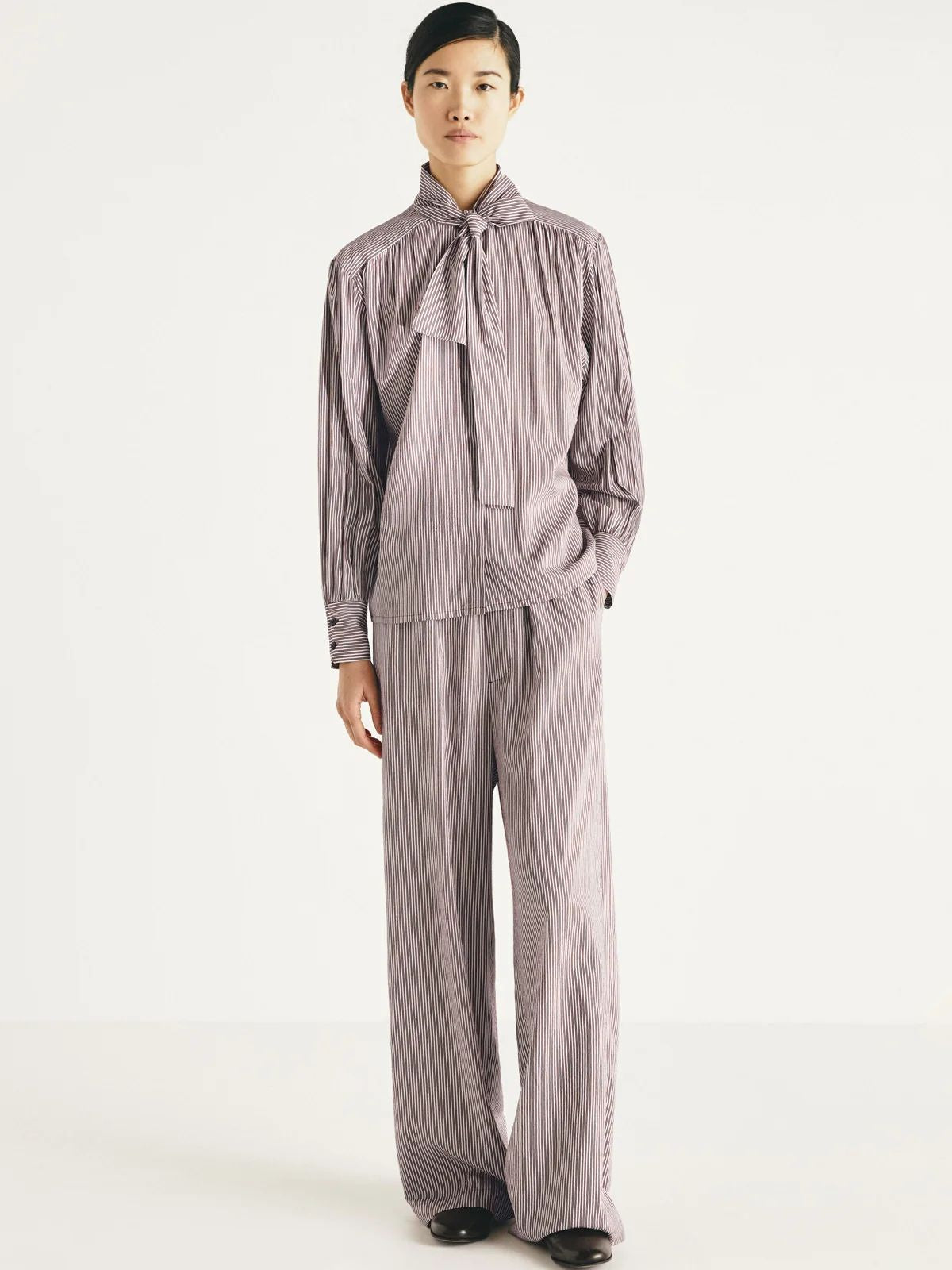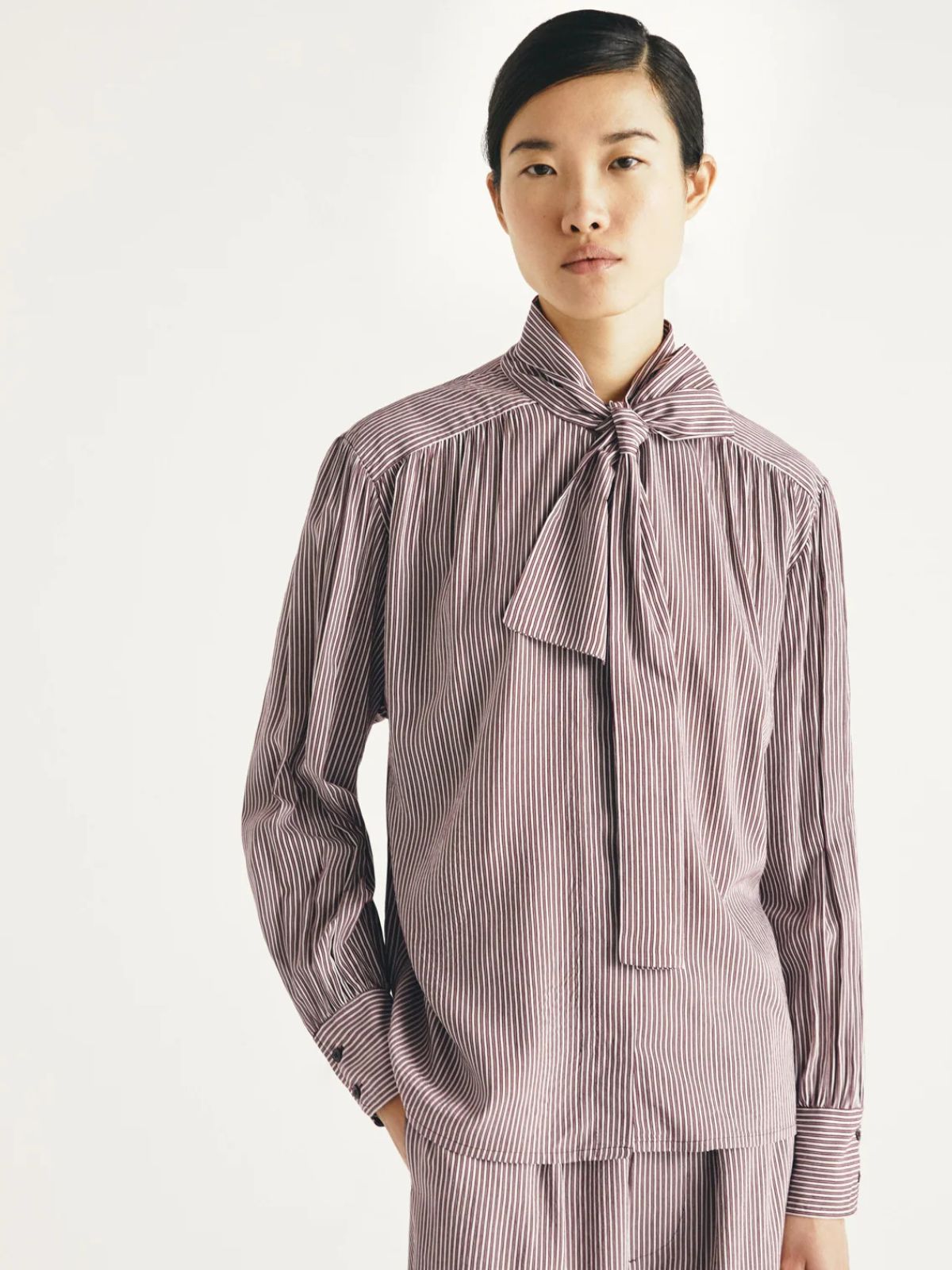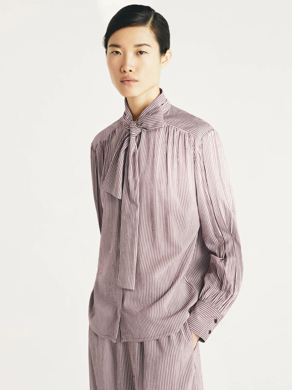 An elegant striped blouse in a luxe silk viscose. An elegant collar with bow detail and front button closure.