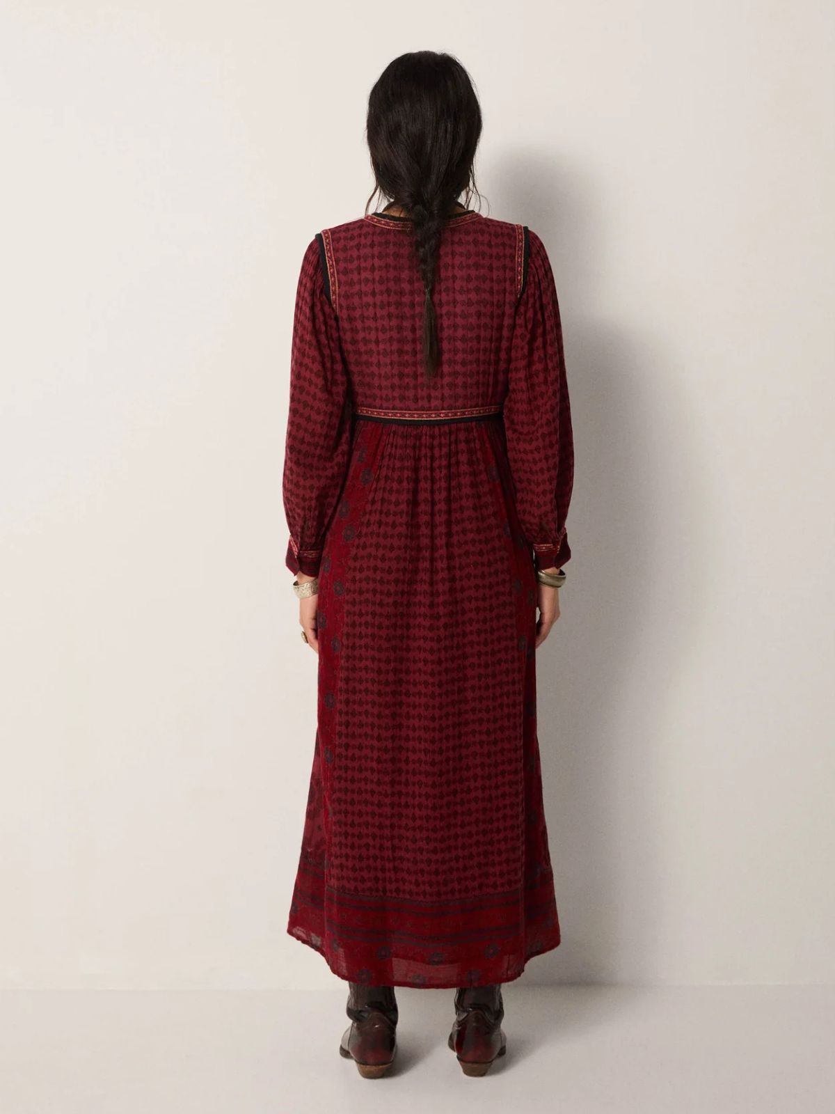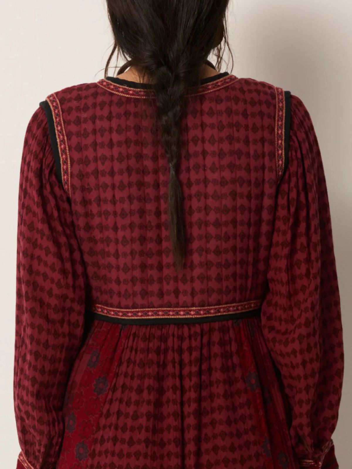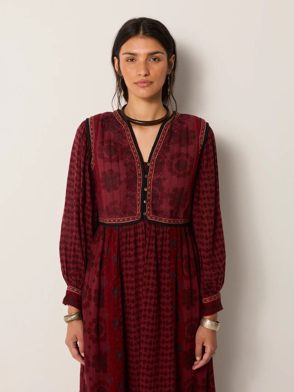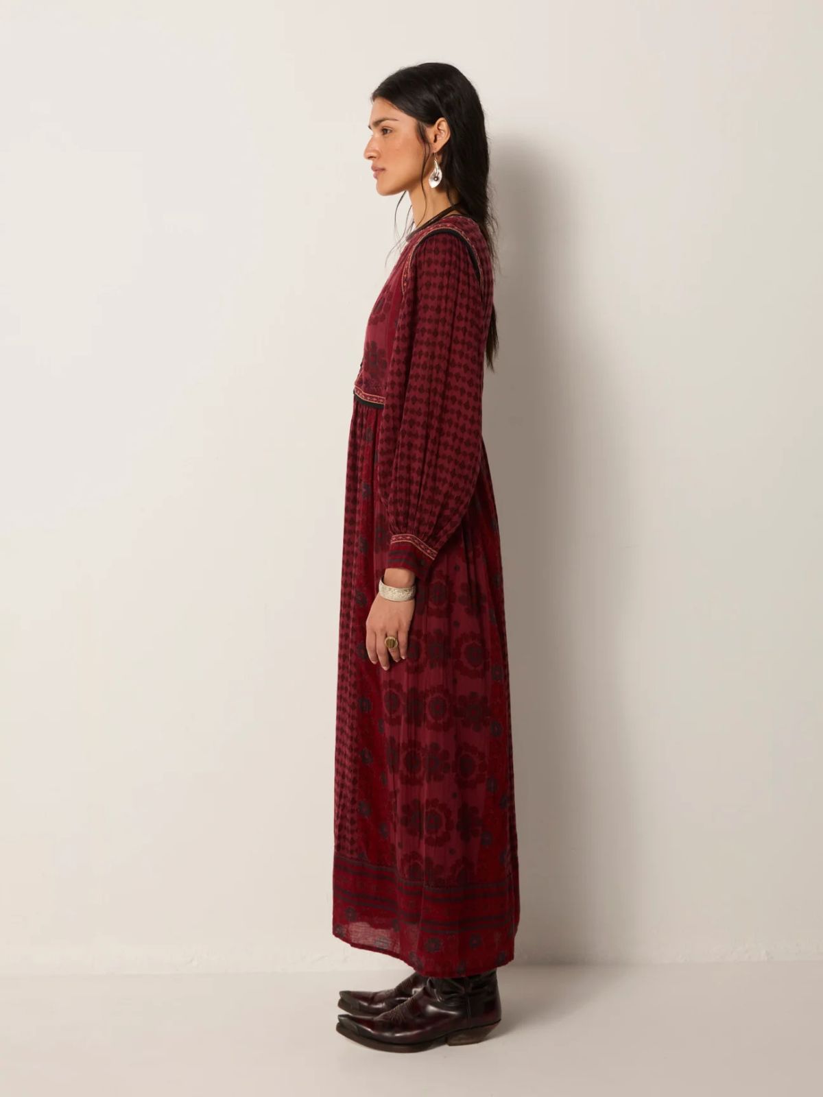 The Ginevra Dress in burgundy offers an elegant blend of comfort and subtle sophistication. Crafted from cotton gauze with a natural crinkle, it feels light yet warm, draping effortlessly for a relaxed silhouette. Padded chest panels provide gentle structure, while delicate embroidery at the cuffs adds refined detail. The muted burgundy shade, softened into a dusky shadow, lends a quietly graceful appeal perfect for understated elegance.