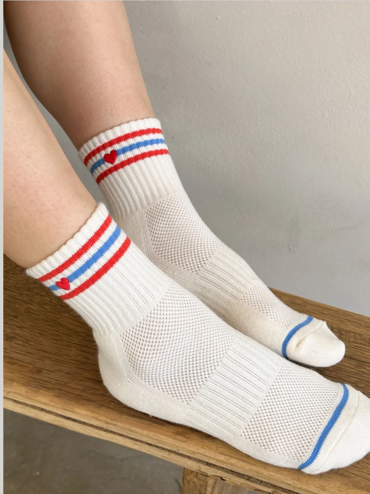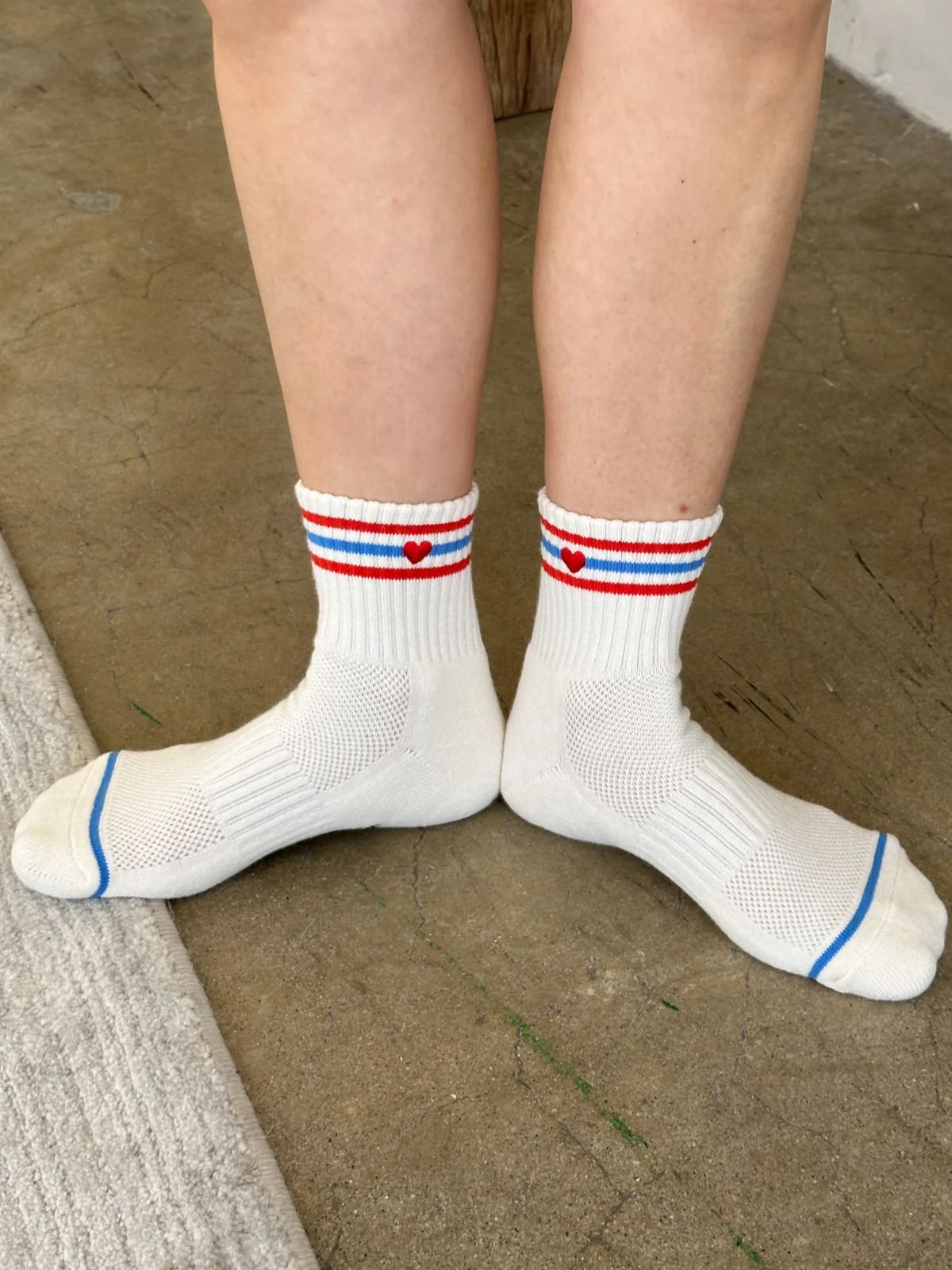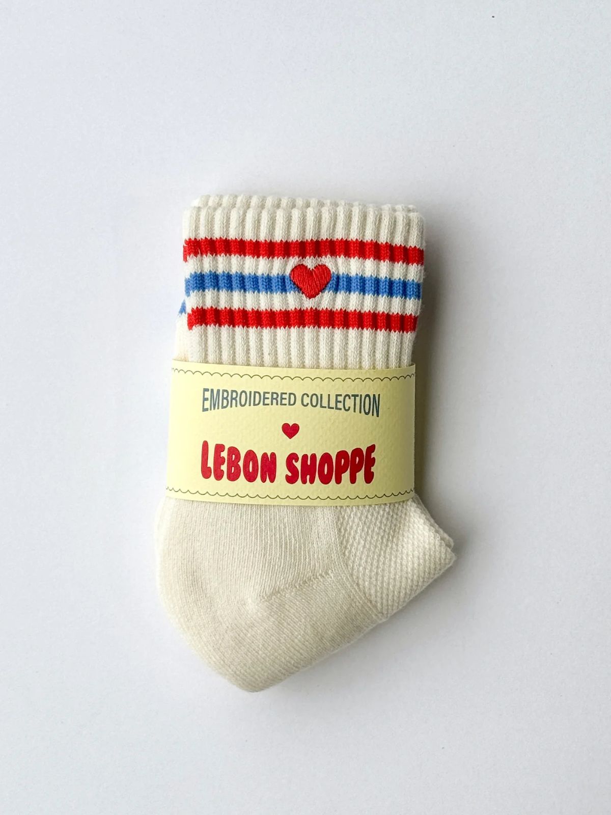 Say hello to the cutest crew socks to exist. Similar to the Boyfriend Socks, except with a short leg that fits true to the classic crew length. Under the classic triple contrast stripe sits an embroidered heart, adding the sweetest touch of affection to any outfit.