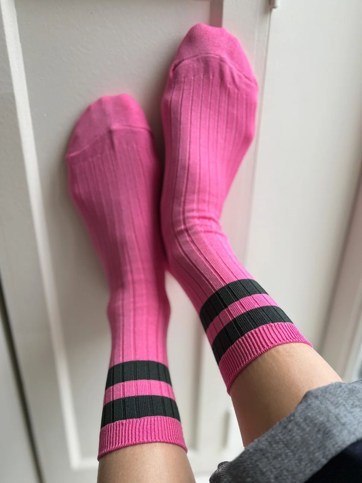 Her Varsity Socks in Bright Pink offer a refined update to our classic design, featuring a ribbed texture and quarter-crew length for an elevated sporty silhouette. Crafted from a breathable cotton blend, these socks combine comfort with style, enhanced by striking contrasting stripes that add a subtle yet confident touch to your ensemble. Perfect for those who appreciate understated sophistication with a playful edge.