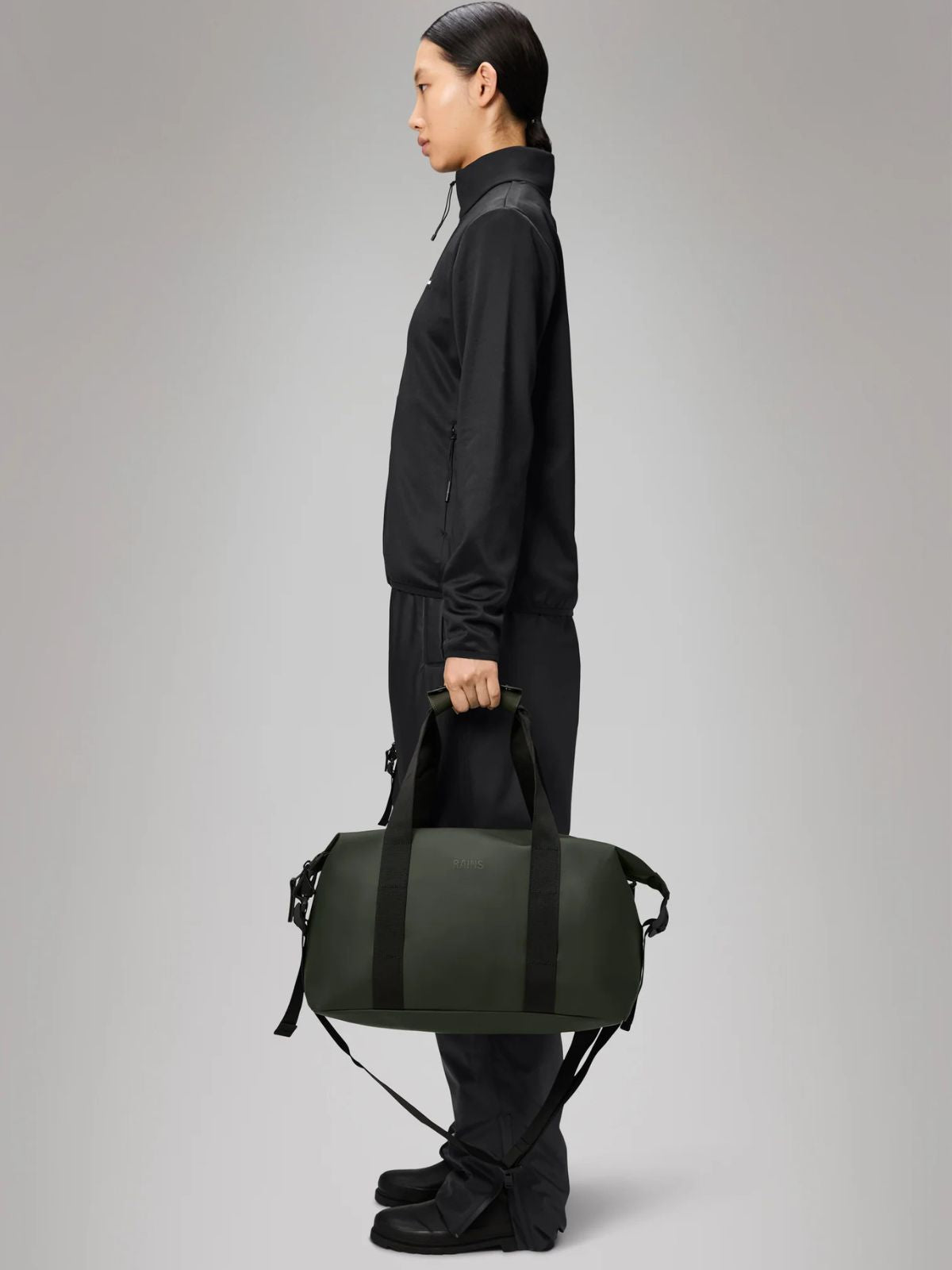 The Hilo Small Weekend Bag in green combines minimalist design with practical functionality, making it ideal for light travel. Crafted from Rains’ signature waterproof fabric, it features a spacious main compartment accessed through a full-length coated zipper. Side compression straps ensure secure packing, while webbing carry handles with comfort sleeves and attachment rings for a detachable shoulder strap offer versatile carrying options. This bag effortlessly blends style and utility for a refined, on-the-go experience.