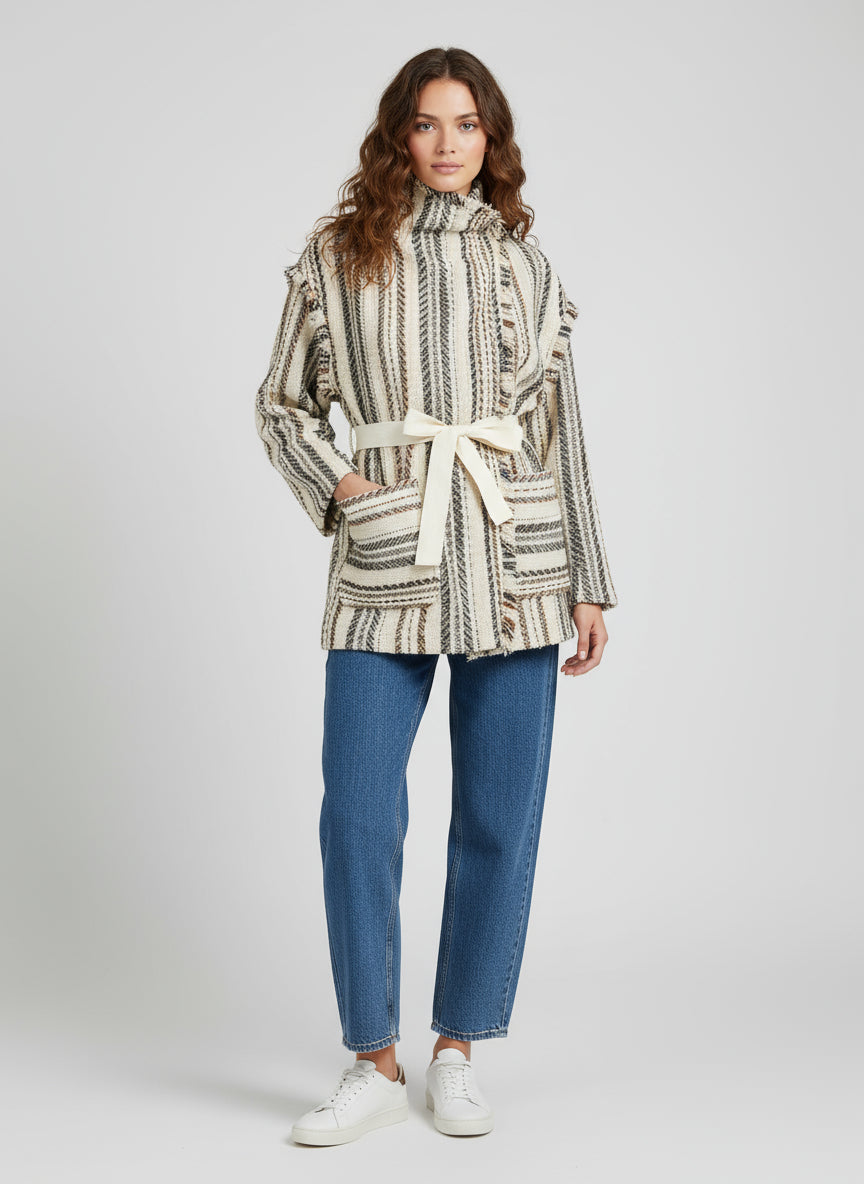 Marant Étoile's Illisa Belted Jacket blends bohemian charm with refined sophistication. Crafted from a tweed blend of cotton and wool, it features earth-toned stripes woven with artistic detail. The relaxed fit, dropped shoulder seams, and patch pockets enhance its effortless appeal, while fringed edges add a subtle touch of texture. This jacket offers a graceful balance of comfort and style for a polished, yet laid-back look.