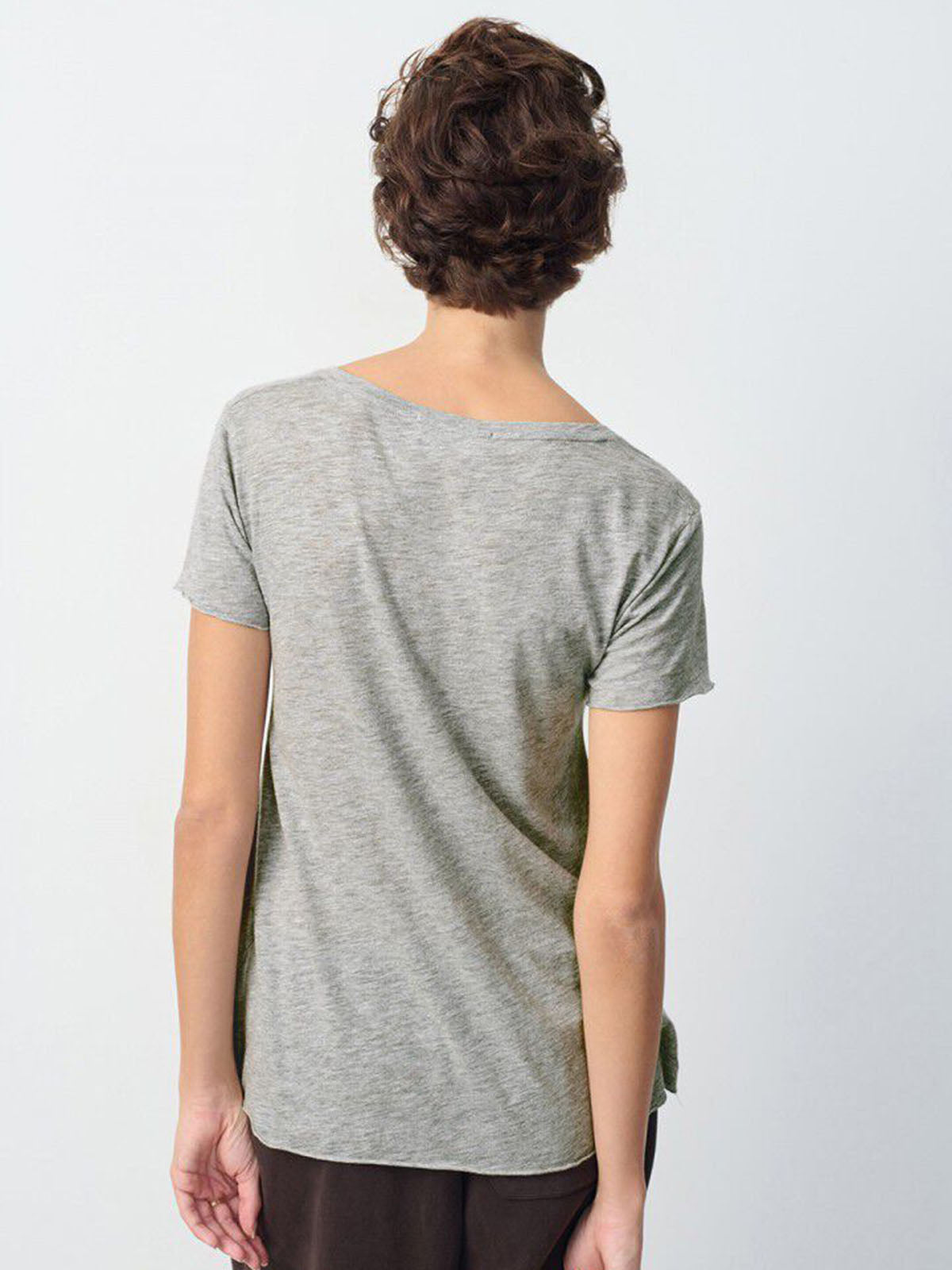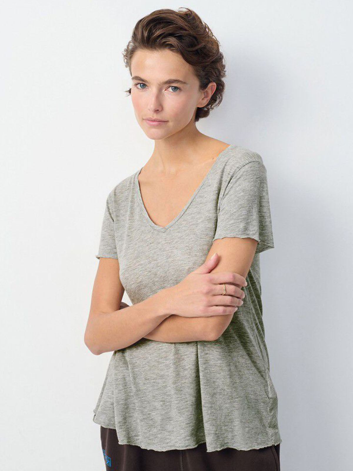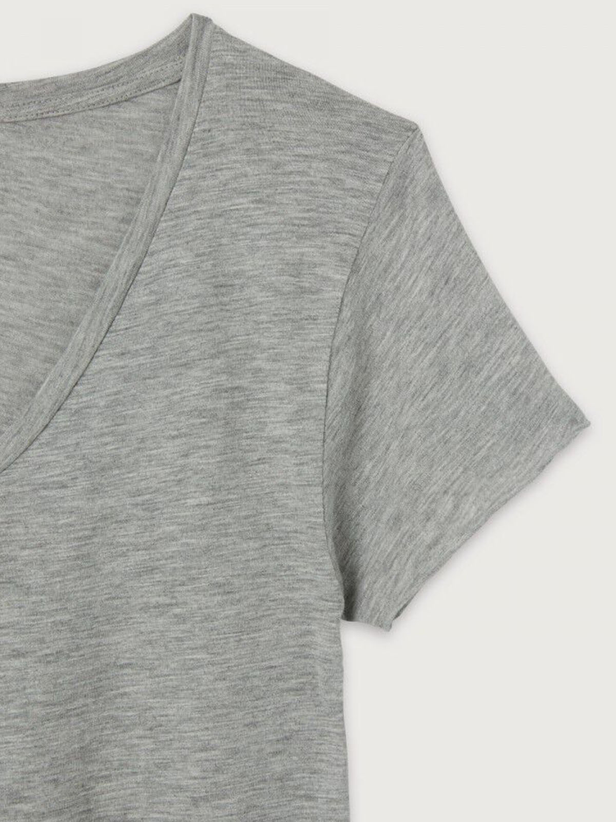 The American Vintage Jacksonville V-Neck T-Shirt in soft grey is your new go-to for effortless style. Made from slub cotton, it feels delightfully textured and light against your skin. Its flattering v-neck neckline and flared fit add a playful twist to a classic tee, perfect for layering or wearing solo. Short sleeves keep it breezy, making it a year-round favourite. Also available at IRIS in a vibrant red