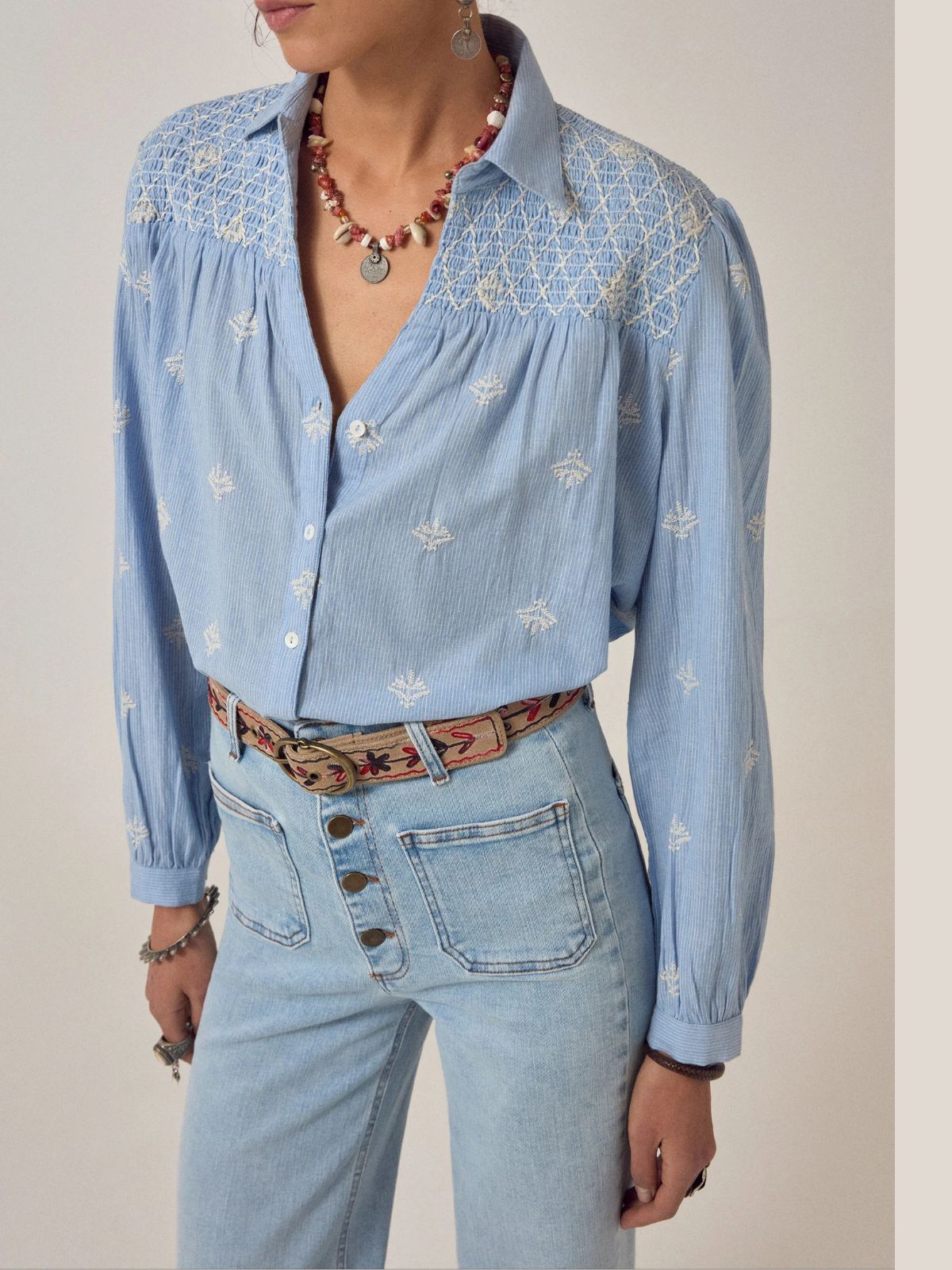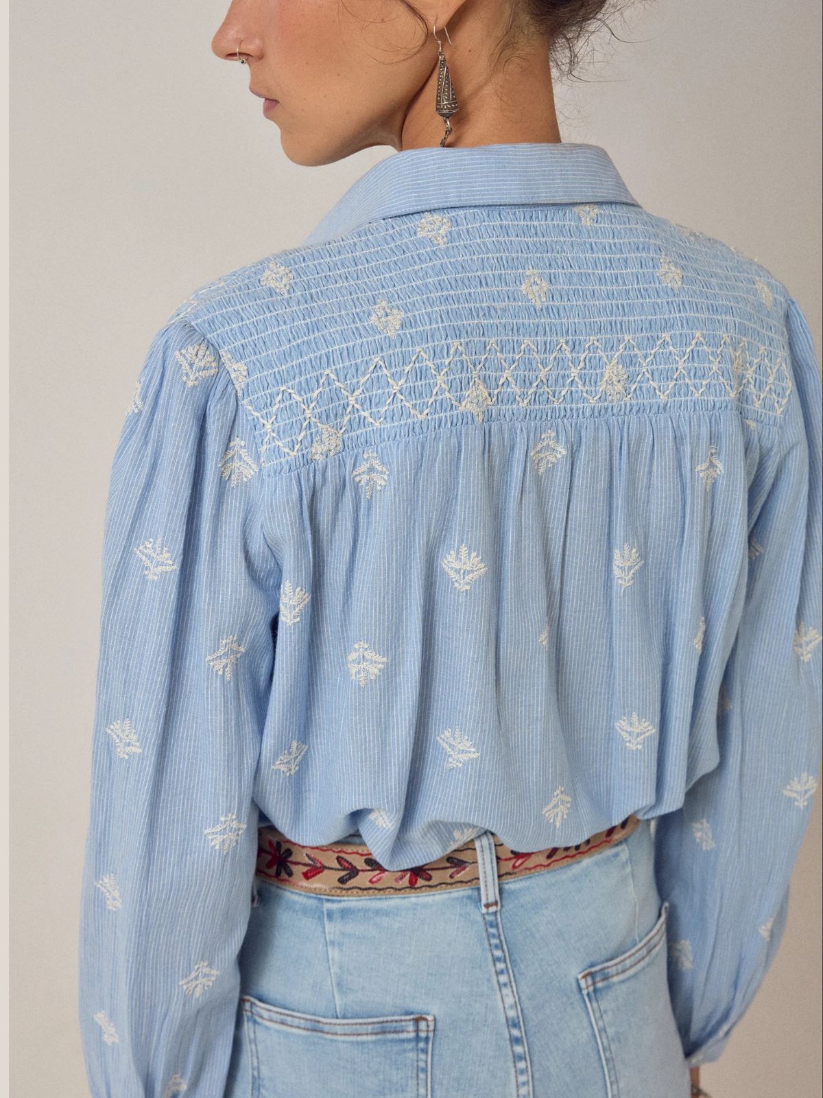Long-sleeve shirt in lightweight cotton with subtle texture. Soft sky blue base scattered with cream embroidered motifs that catch the light. Collared with a button-down front and button cuffs for easy fastening. The smocked yoke features delicate cream embroidery, while balloon sleeves with elastic cuffs add gentle volume and movement. Relaxed fit that drapes without clinging, designed to feel effortless and comfortable all day.