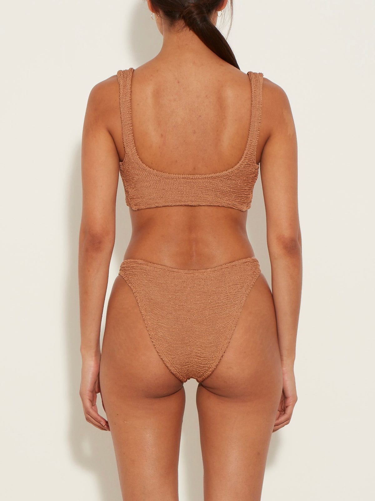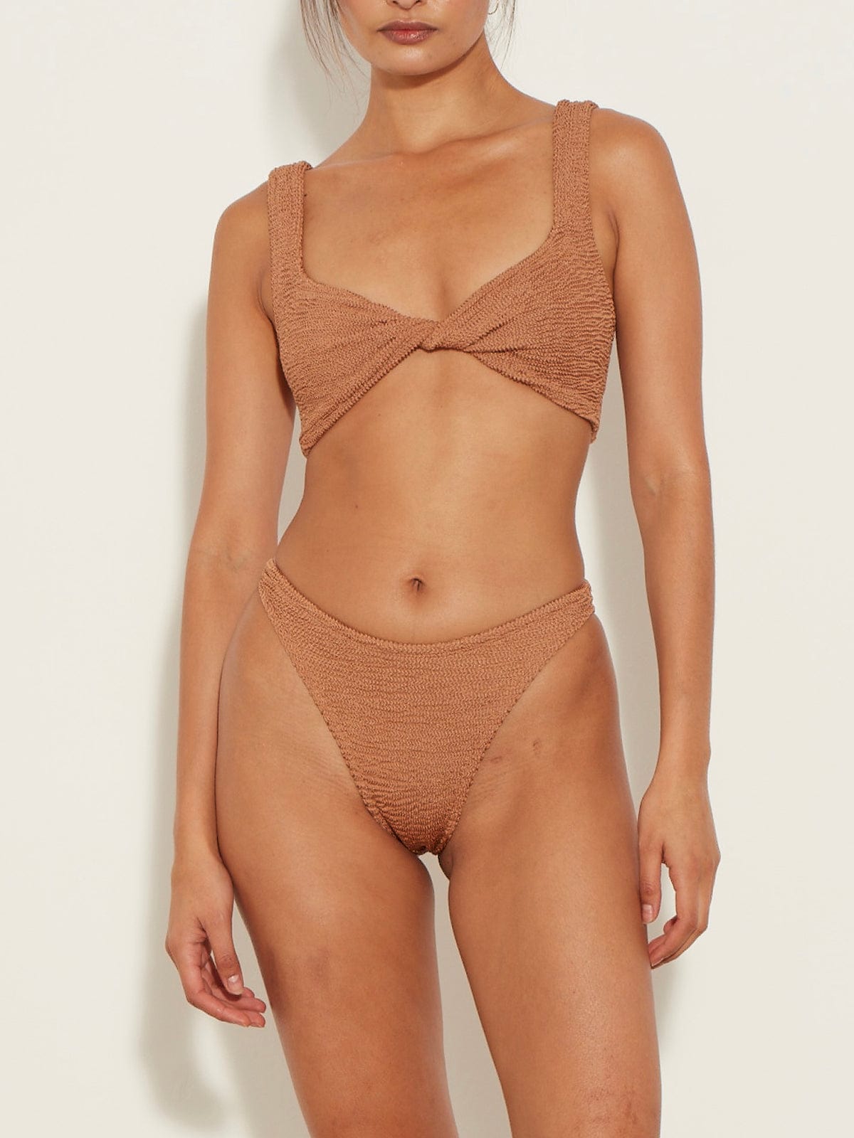 Support and style meet with Junos twist detail top and classic coverage bikini bottoms that can be worn high or low on the hip.