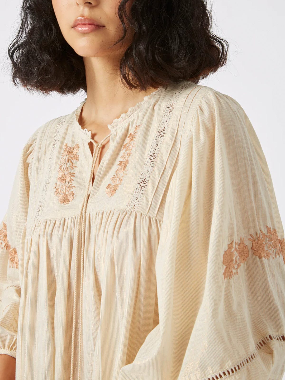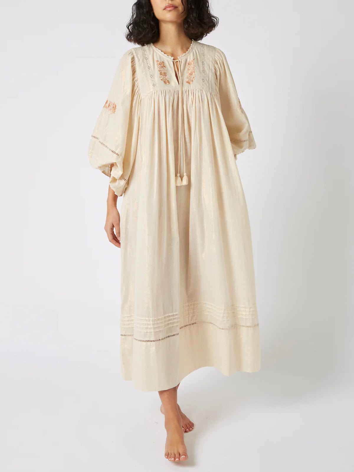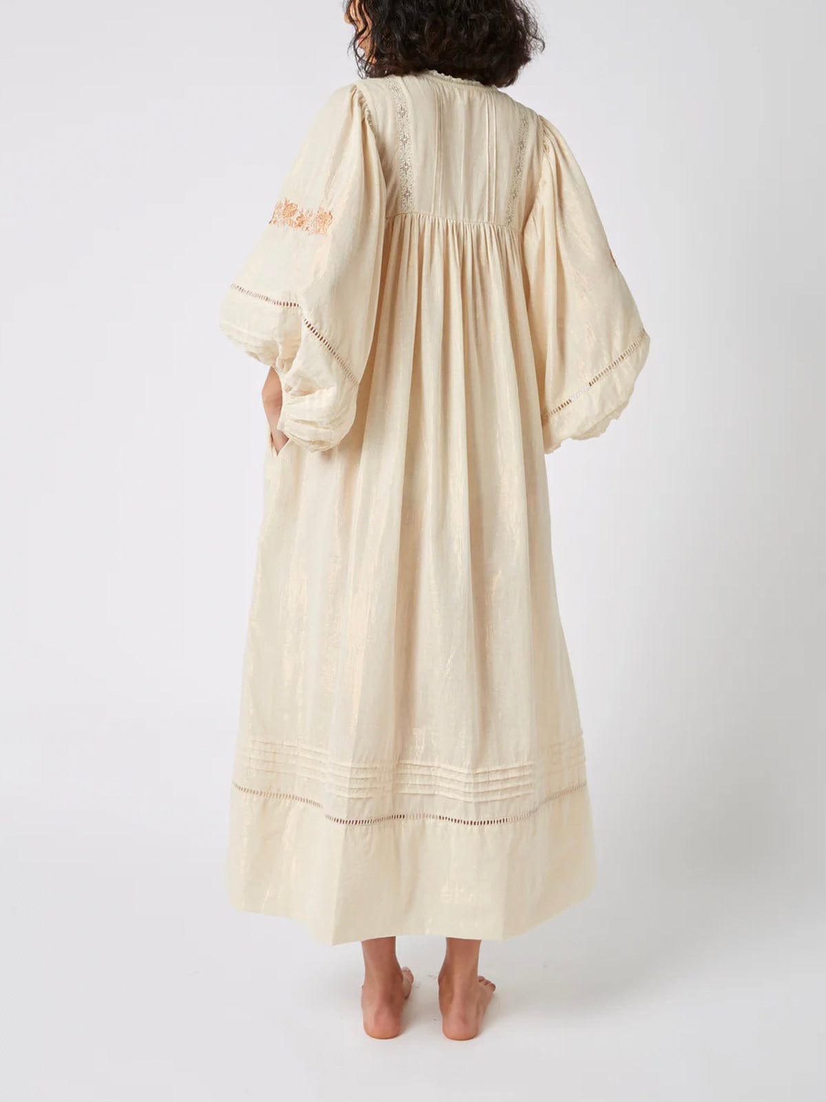 A truly stunning gown in a fluid lightweight gold lurex cotton with fabulous oversize balloon sleeves. The many gathers give this dress amazing volume, making it a wonderfully comfortable style to relax and lounge in. FAUNEs signature lace trims, embroidery and pin tucks add a delicate touch to this beautiful and timeless style.
