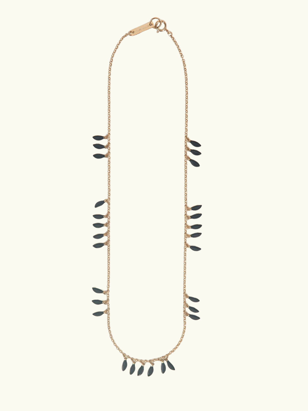 Its all in about the leaf on this dainty charm necklace by French designer Isabel Marant. Glossy, black enamel ones dangle from a gold-toned link chain measuring 17 inches long. The logo charm signs it off. Team with the matching Leaves earrings.