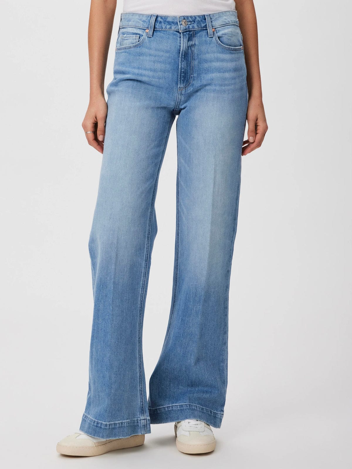 This sleek wide leg is designed with a high-rise, a flattering bow leg and 32" inseam that pairs perfectly with flats and also works well with a heel for petite women. This pair is crafted from PAIGE VINTAGE denim in a faded light blue wash with subtle distressing at the back pockets. PAIGE VINTAGE takes all of the work out of breaking in your favorite pair of vintage jeans. Combining the comfort of stretch with everything you love about authentic vintage denim to create super soft jeans that feel perfectly lived-in from the very first wear.