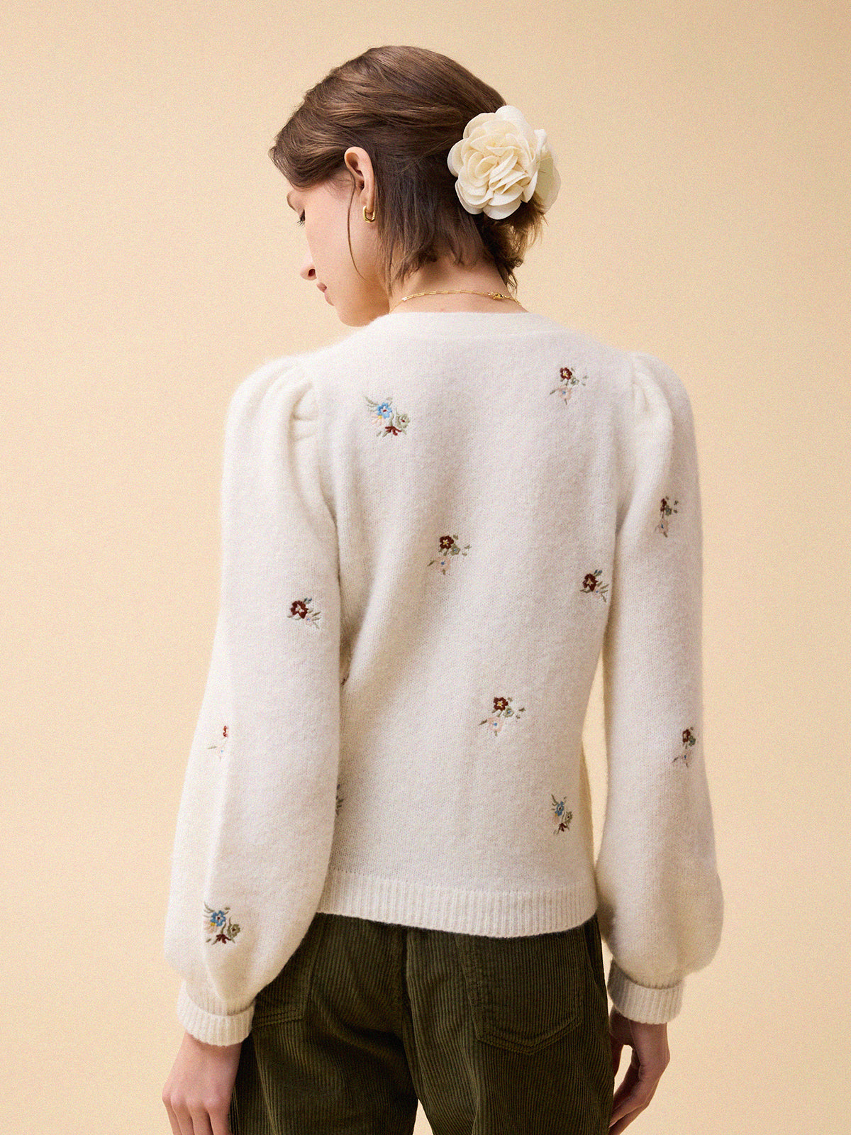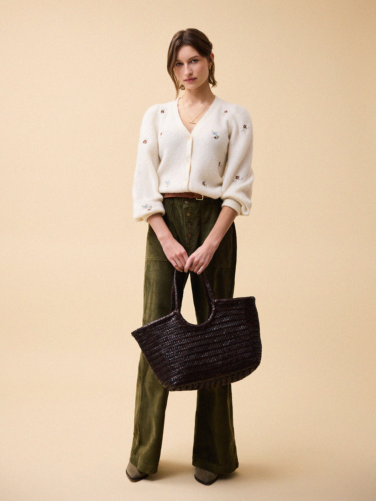 Spring is in the air! Lilly is a cropped alpaca cardigan in a warm cream with a V neckline and a sweet, embroidered floral – delivering a dreamy, romantic look to a simple dress or your favourite pair of jeans.