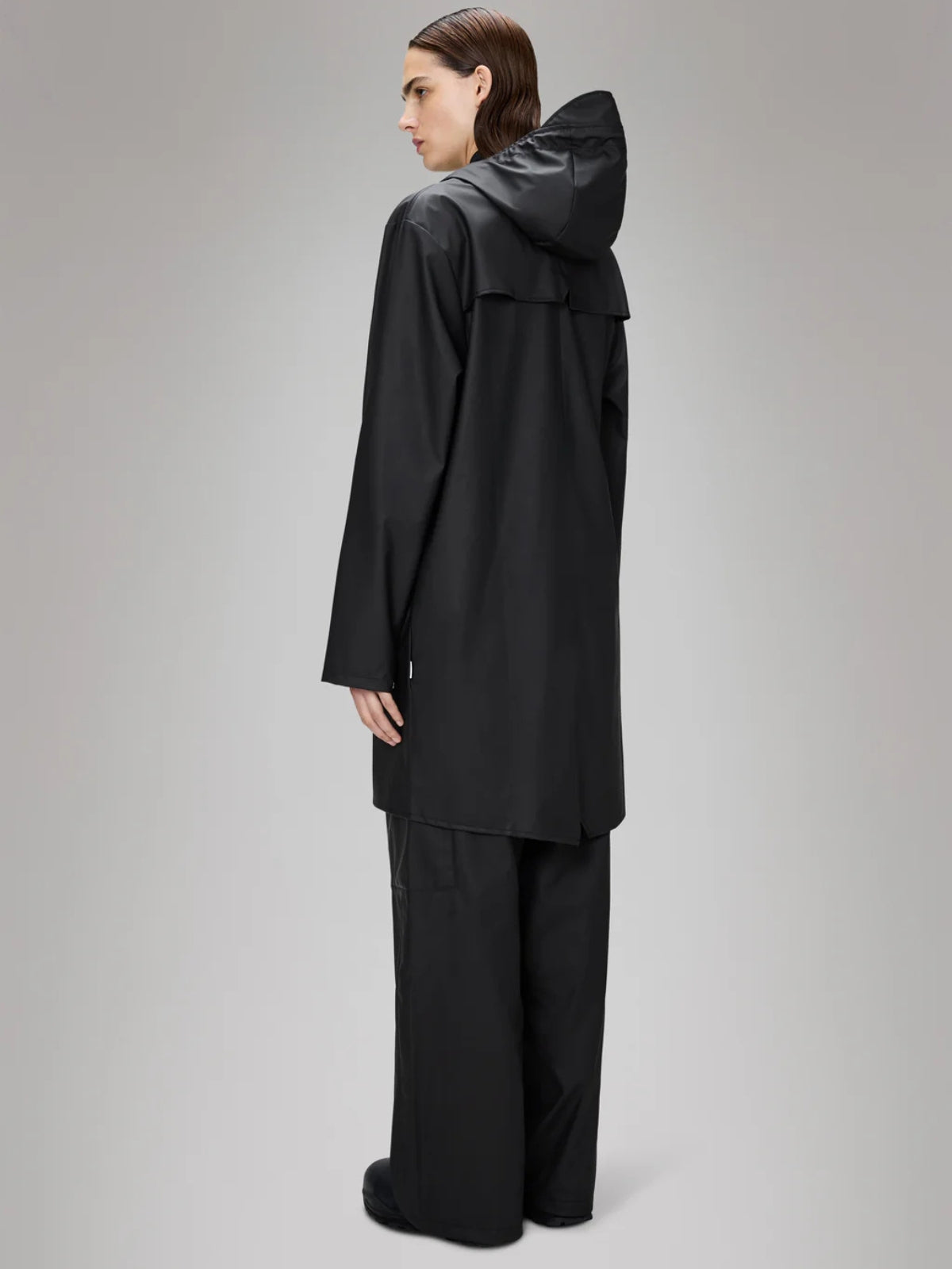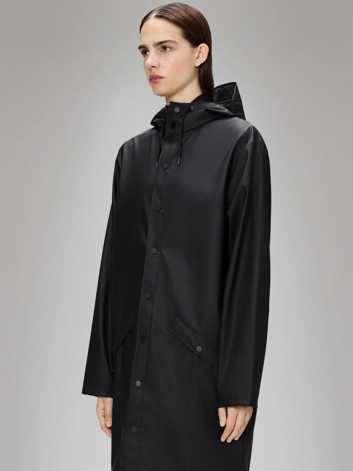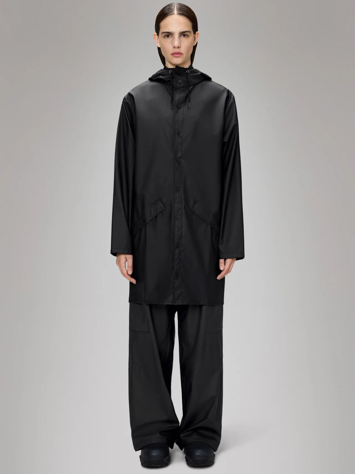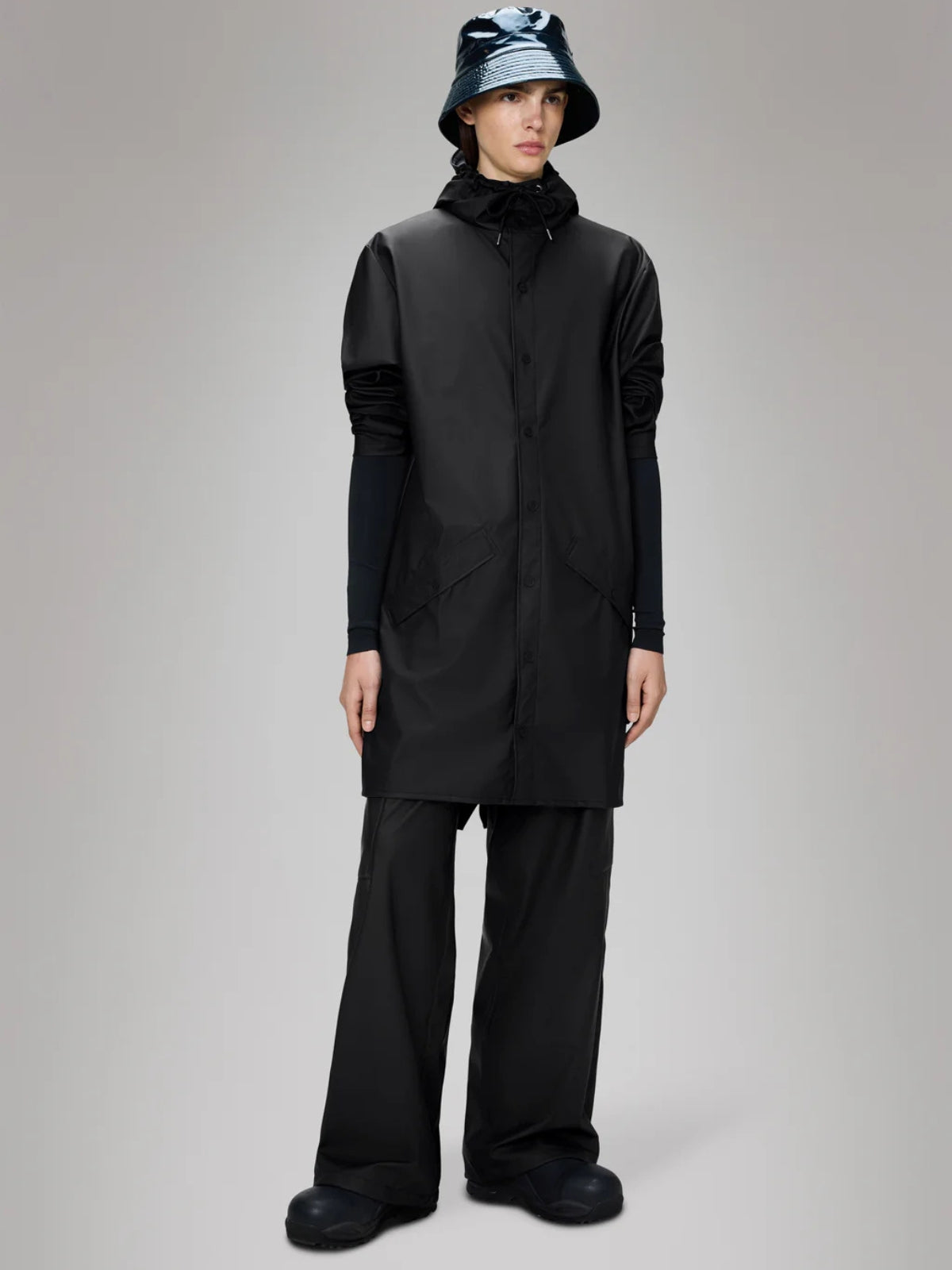 Stay dry in style with the Long Jacket from Rains– a sleek, unisex raincoat that’s anything but ordinary. Featuring snap closures, an adjustable hood with a built-in cap, and side pockets perfect for stashing your essentials. With adjustable sleeves and breathable vents, it’s designed for comfort and a flattering fit. Crafted from lightweight, smooth PU fabric with welded seams, it’s your go-to for rainy days with a playful twist. Comes in Lagoon blue and black