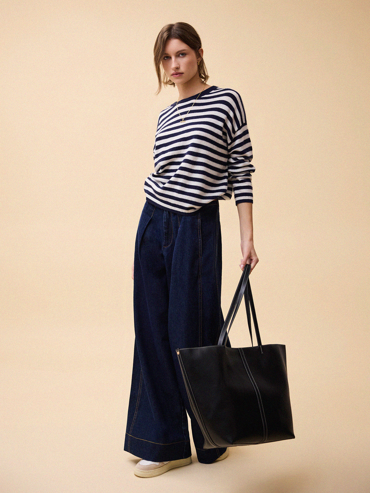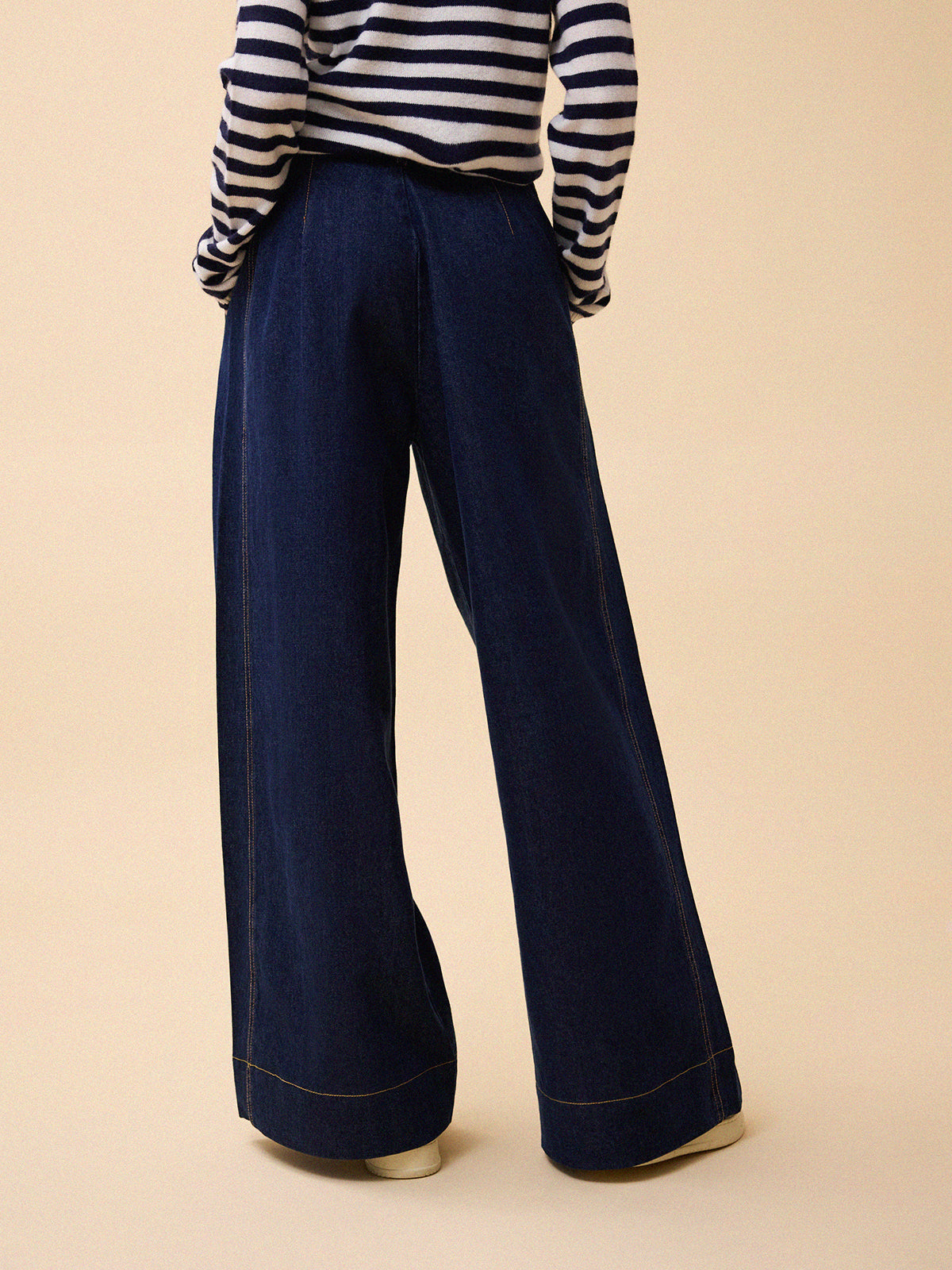 The Luca is a tried and tested style in the by Iris collection much loved for its flattering fit with a high waist and leg lengthening longer wide leg. It has already appeared in the collections in a variety of iterations but this season the Luca comes in a timeless dark blue denim. The Luca perfectly encapsulates this seasons denim trend for a wide legged silhouette - we love to wear them paired with a luxe roll neck knit for elevated day wear with stacked leather boots but they are the perfect slouchy weekend jean to style simply with a Tee and sneakers for running around town - one jean - a myriad of ways to wear them.