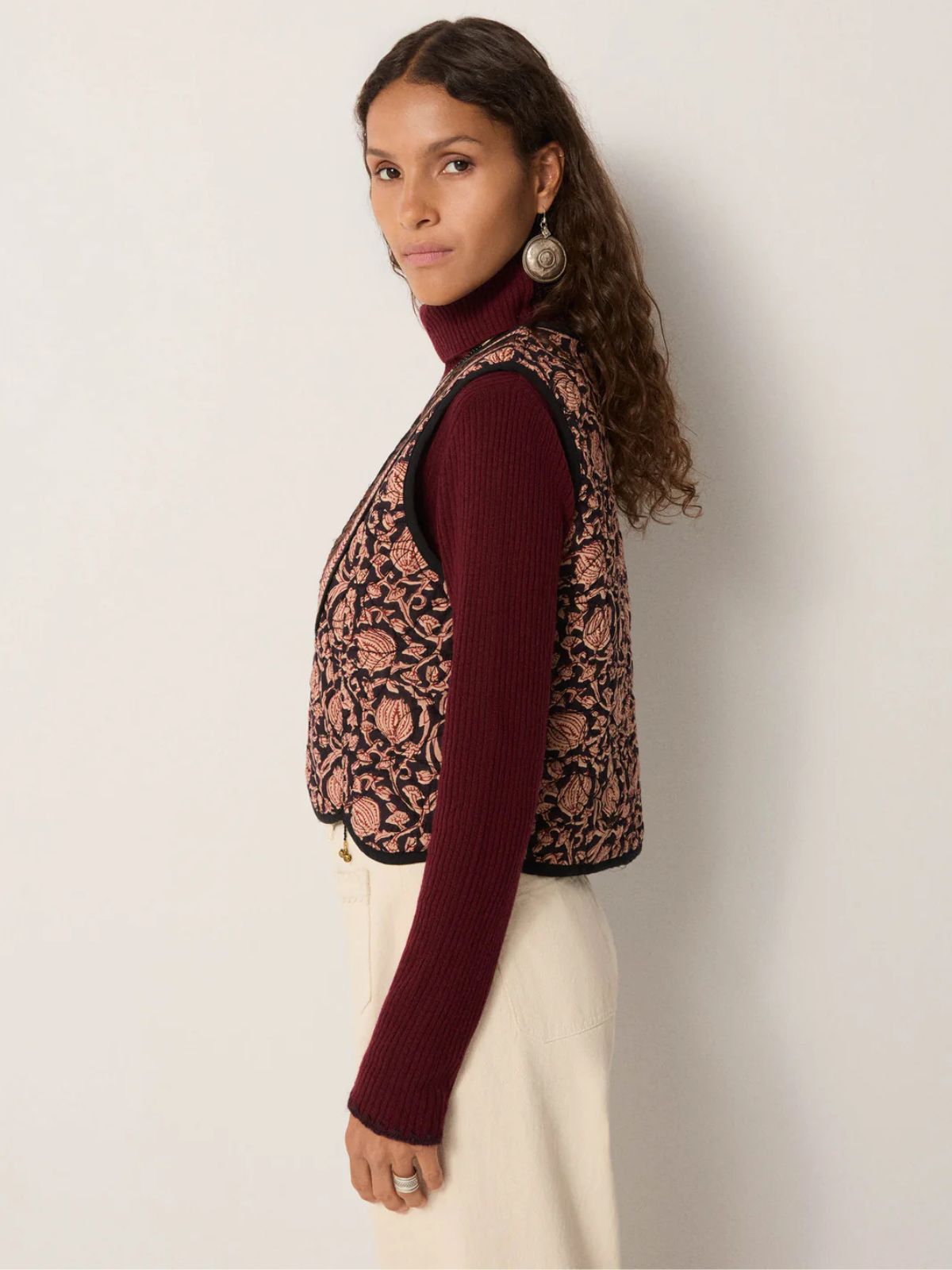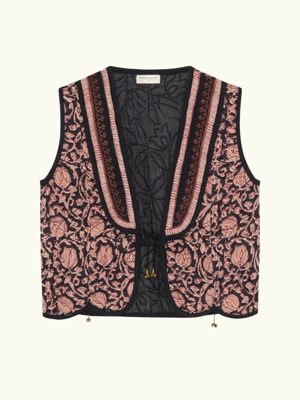 The Luna Print Vest in Black is a beautifully crafted layering piece made from soft, featherlight cotton voile. Its sleeveless, structured design offers effortless comfort without bulk. Adorned with intricate floral embroidery and delicately raised pale stitching, it adds subtle depth and texture against a dark backdrop. Featuring a sharp tailored silhouette, a neat open front, and finely finished edges, this vest showcases exceptional craftsmanship while maintaining an elegant and refined aesthetic..