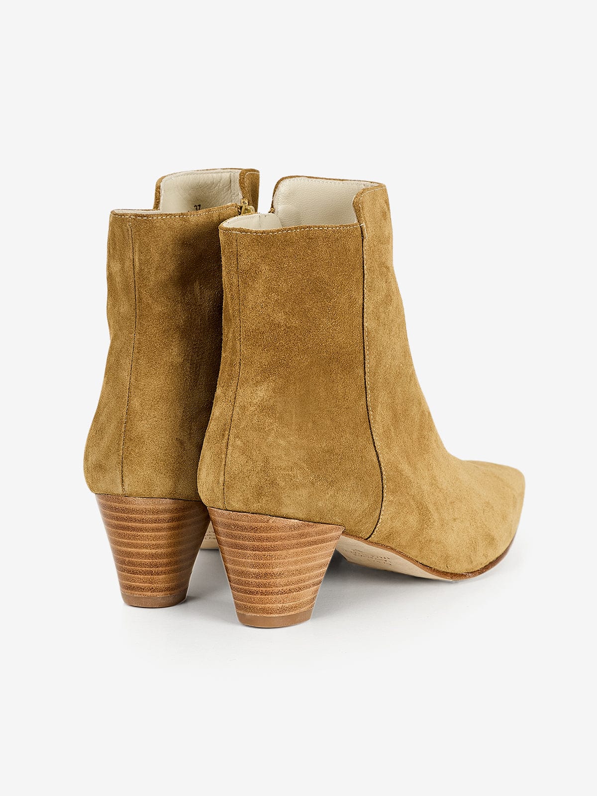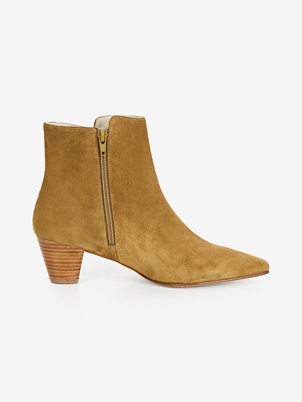 Our Mali boots are elegant, suede ankle boots with a pointed toe and a stacked heel. Giving chic and cowboy in equal parts, these are a beautifully-made pair of shoes with trans-seasonal mileage.