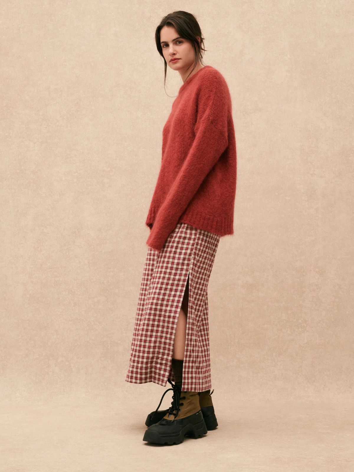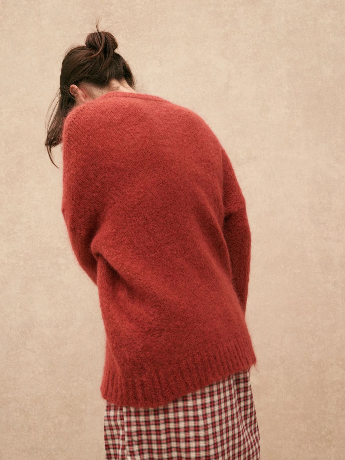 Melina is the cozy sweater to curl up in all winter long. Its collar is round, its sleeves are long, straight, and tightened at the cuffs. It has a slightly oversized cut that will make it look chic on its own or over a shirt or dress.