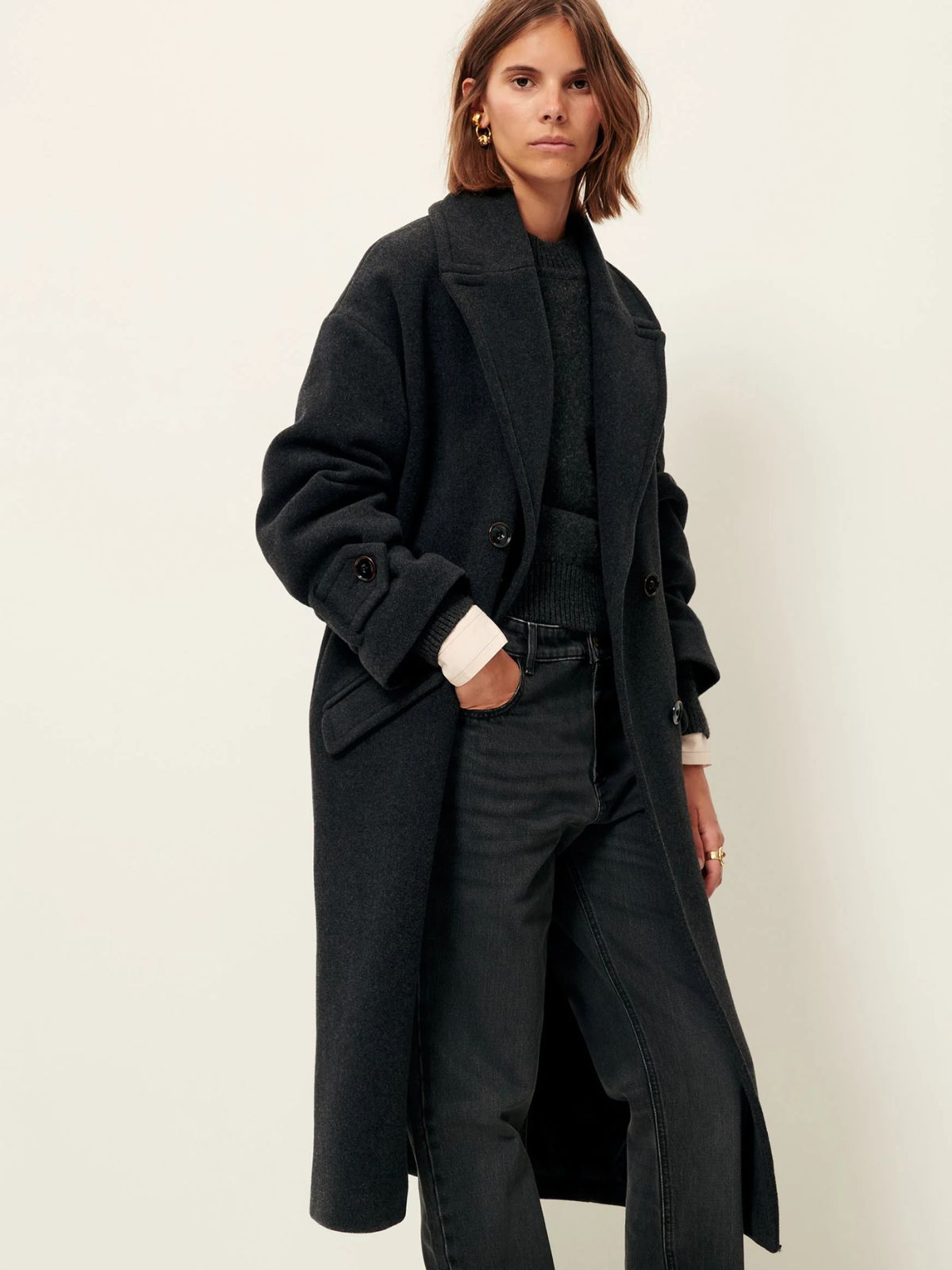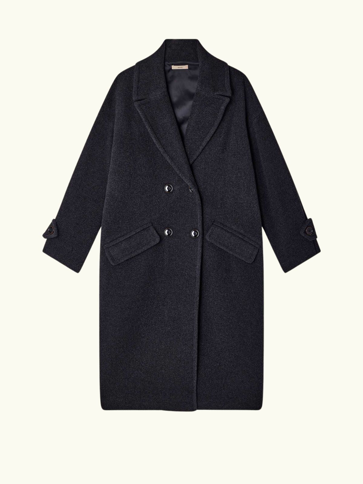 Long, double-breasted coat in a velvet-finish double weave Melton fabric, woven in Italy.