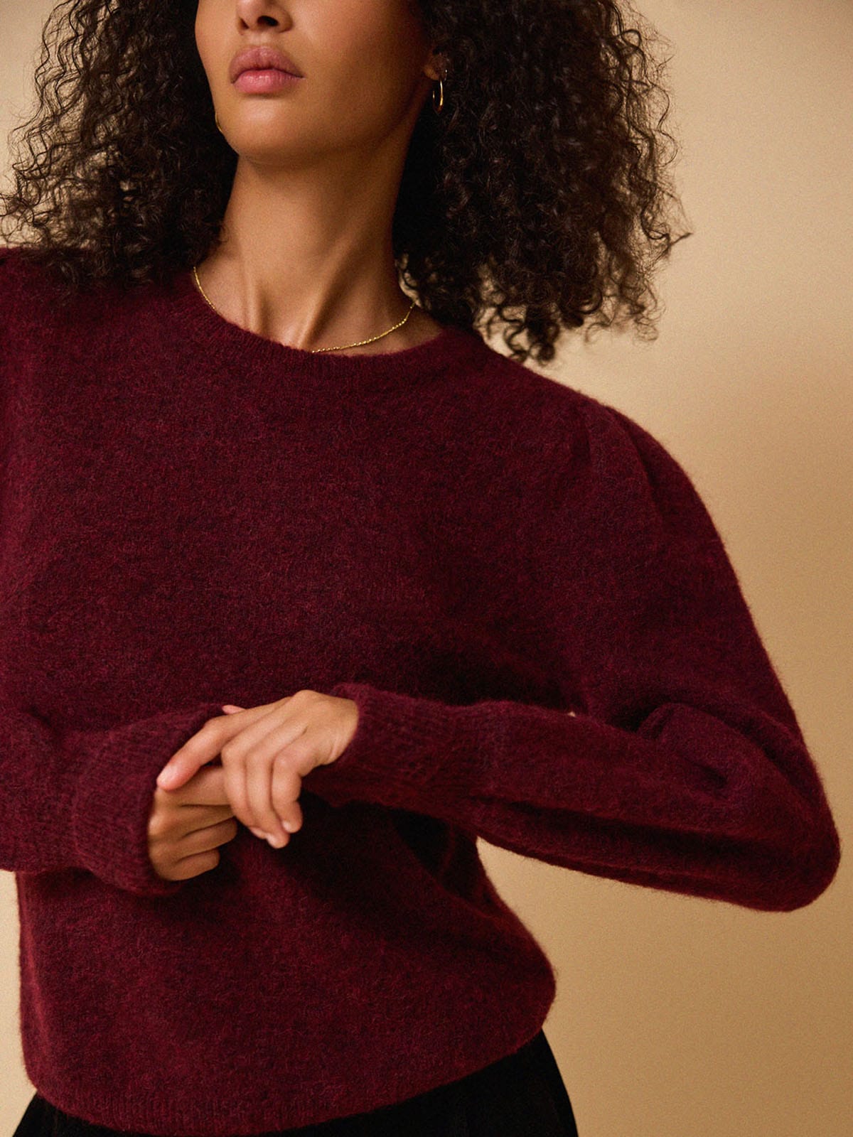 Mina is a crew neck jumper with a subtly puffed shoulder in the softest alpaca blend. Her feminine silhouette pairs perfectly with relaxed trousers or jeans