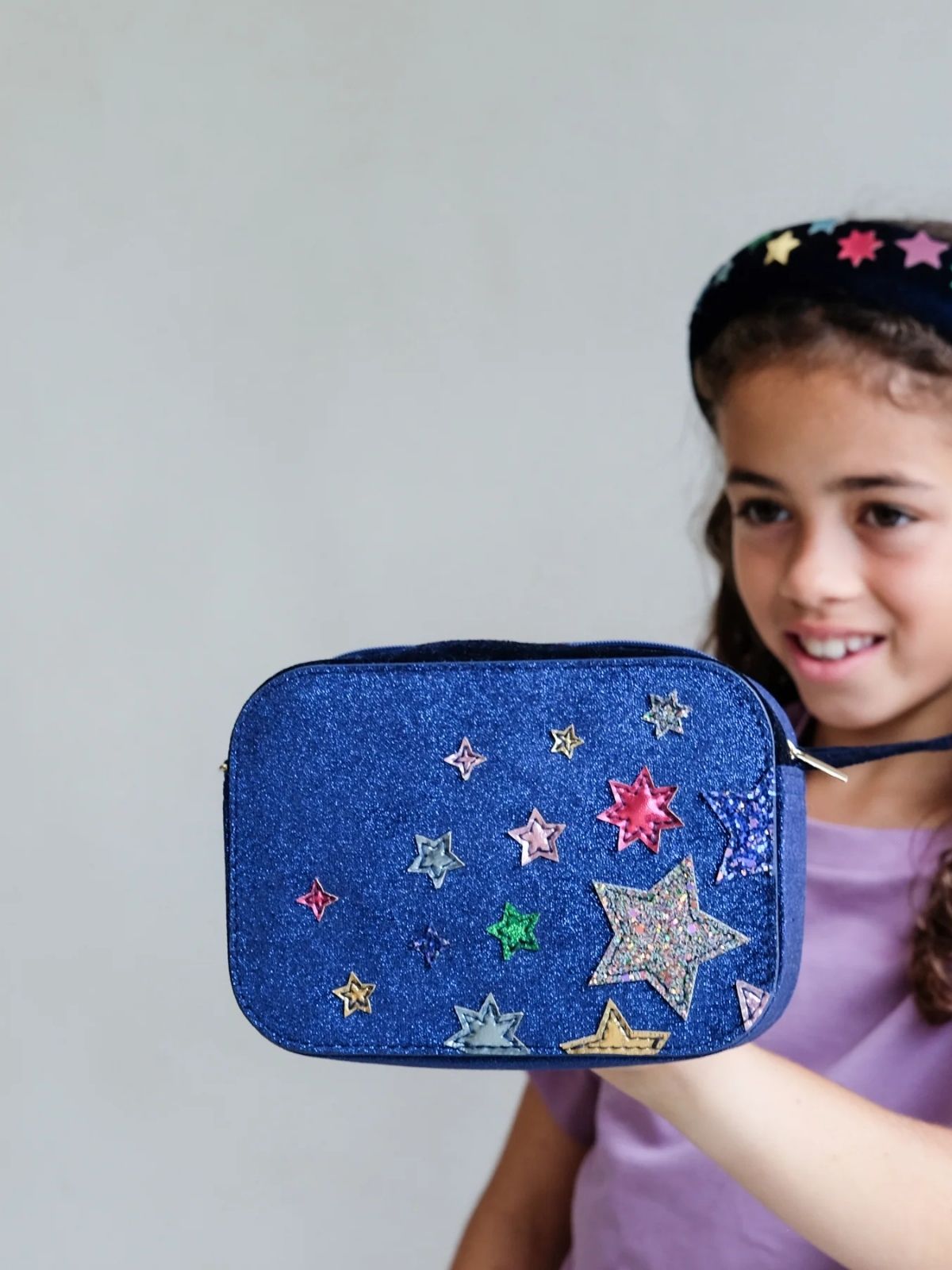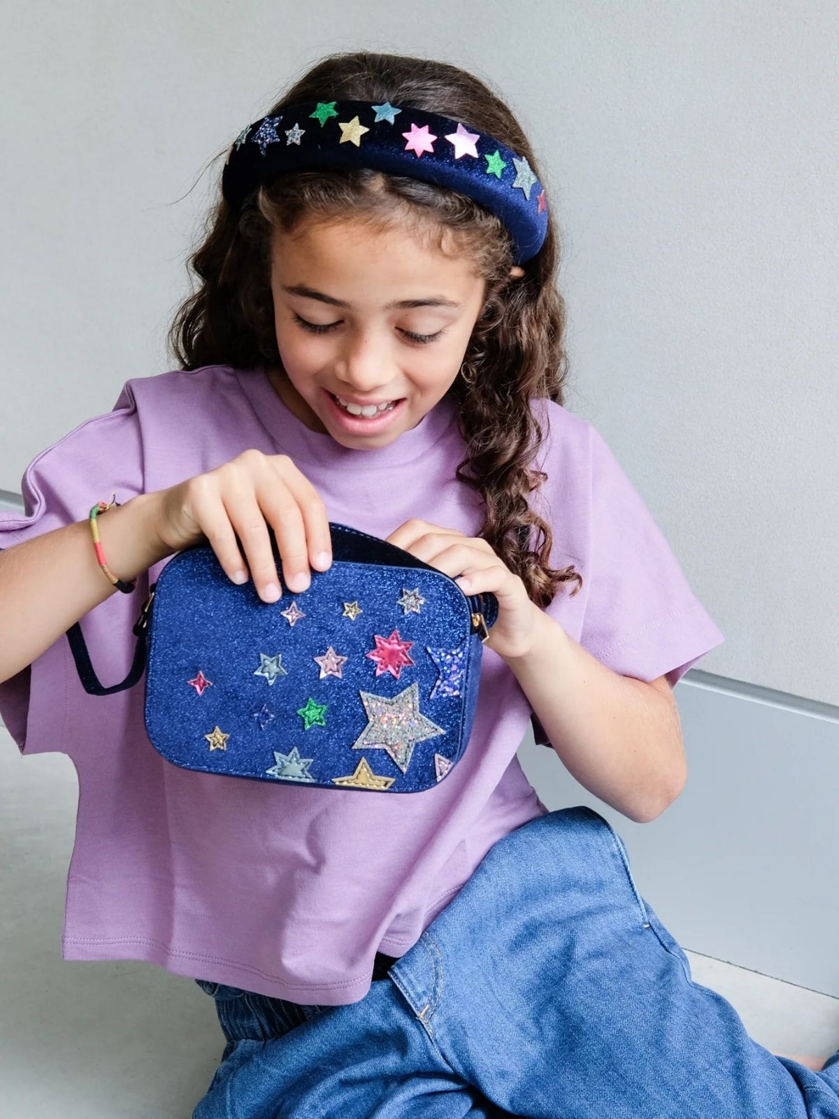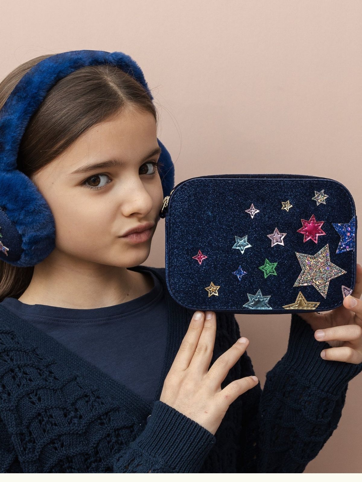 - Crafted from super soft blue velvet adorned with a mix of glitter and metallic fabric stars