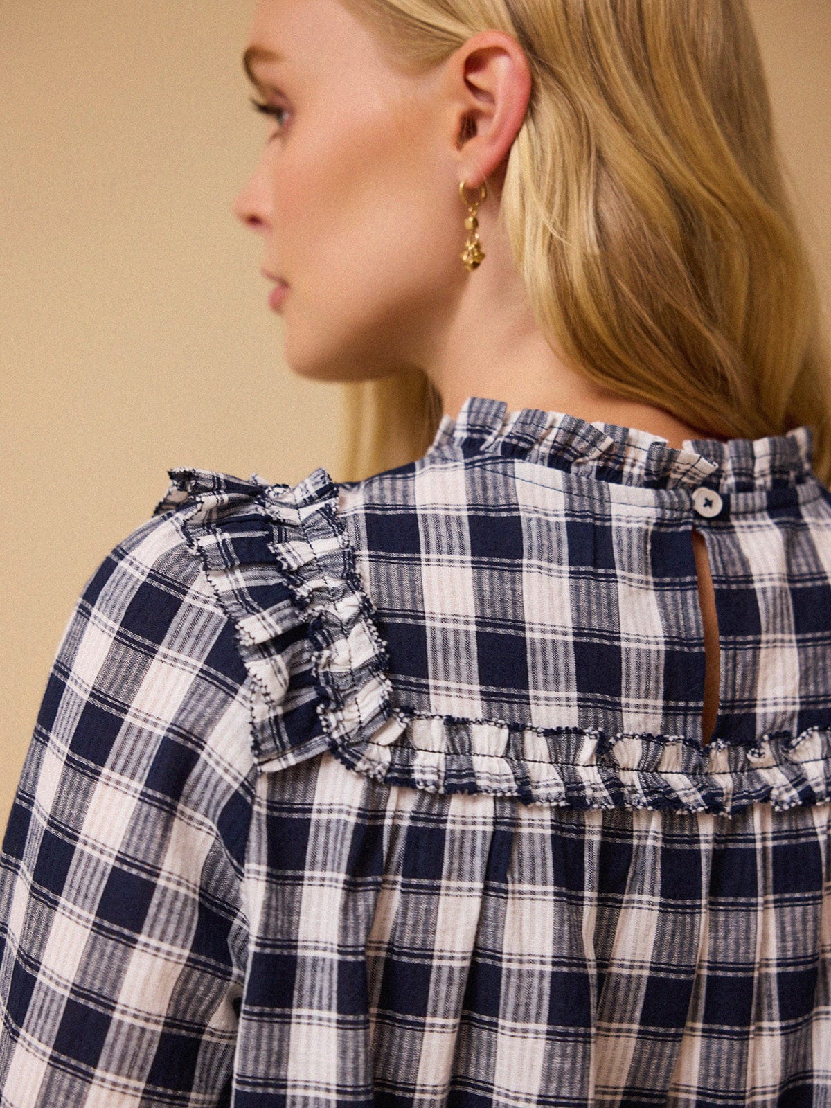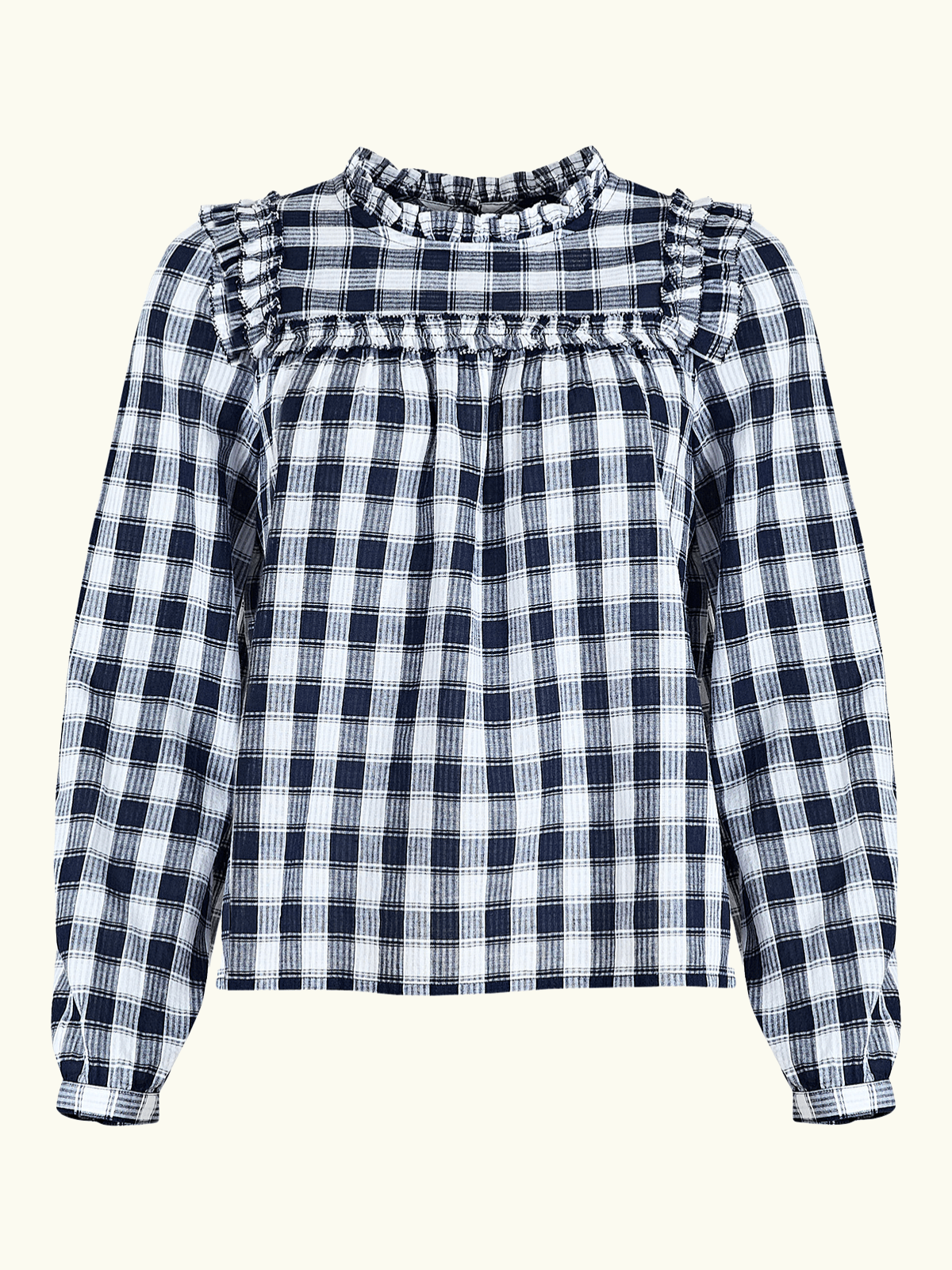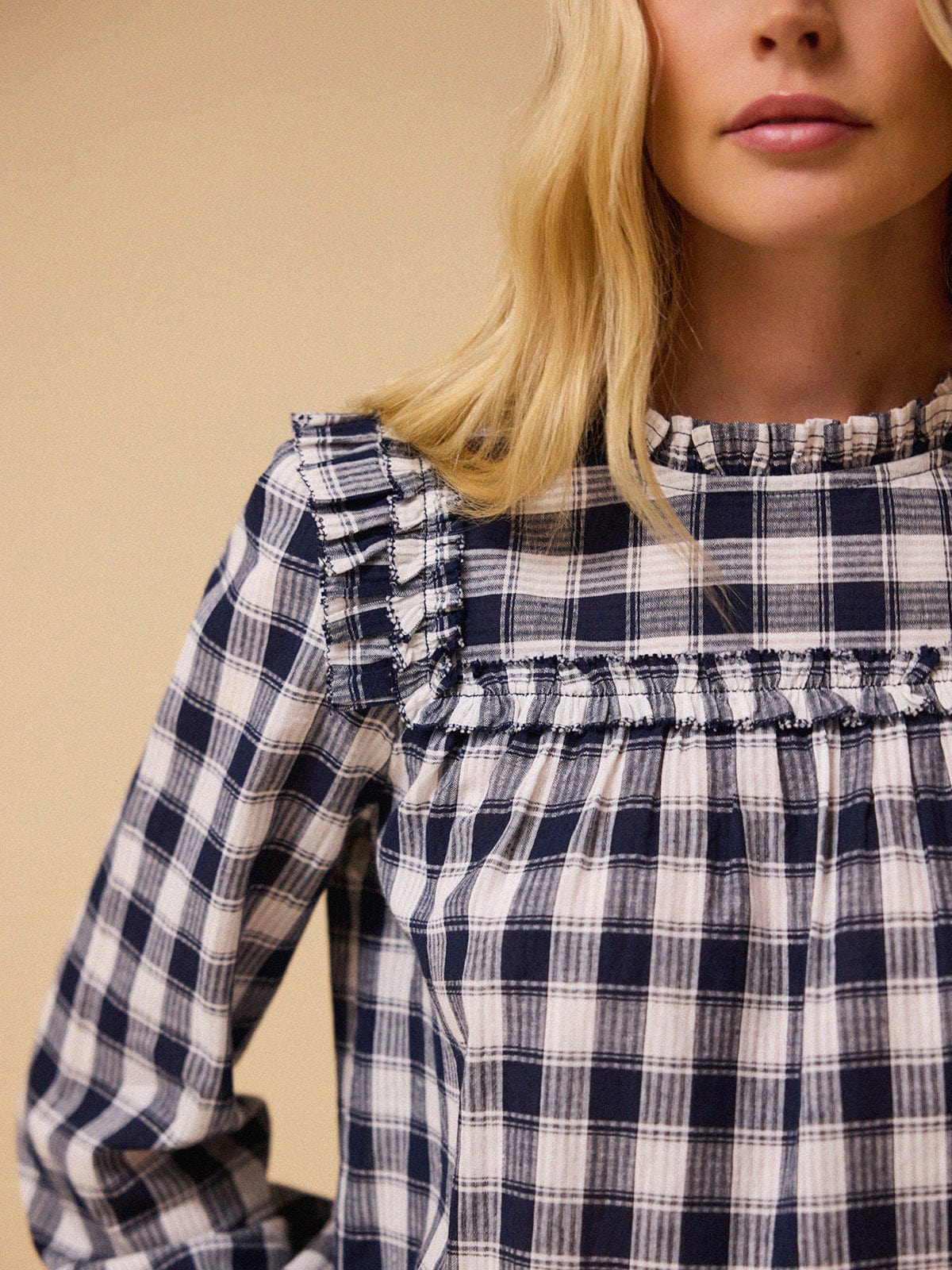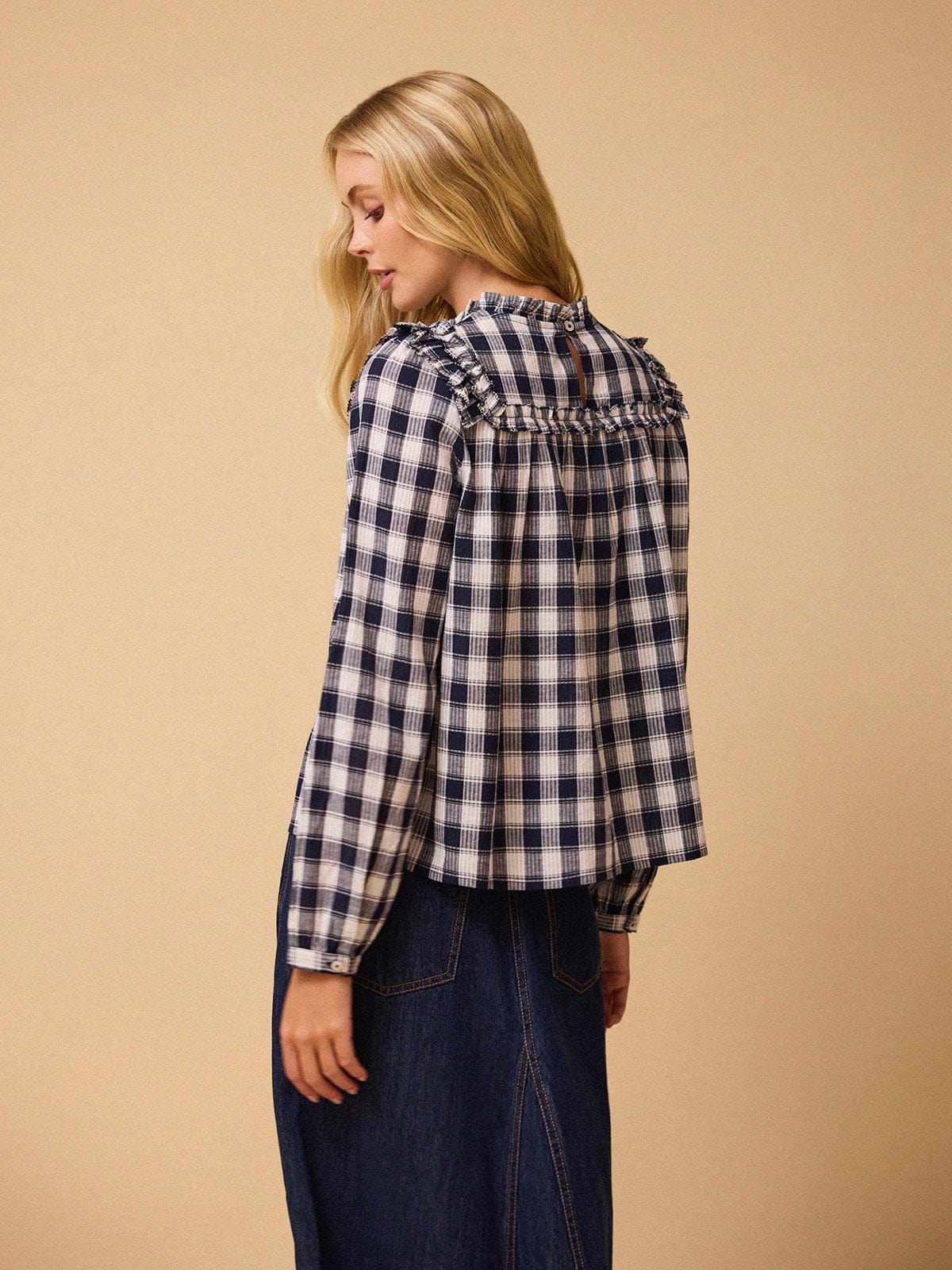 Oriel is a dreamy gingham blouse with a ruffled yoke and long, buttoned sleeves – perfect with denim for a sweet, daytime look with a touch of nostalgia.