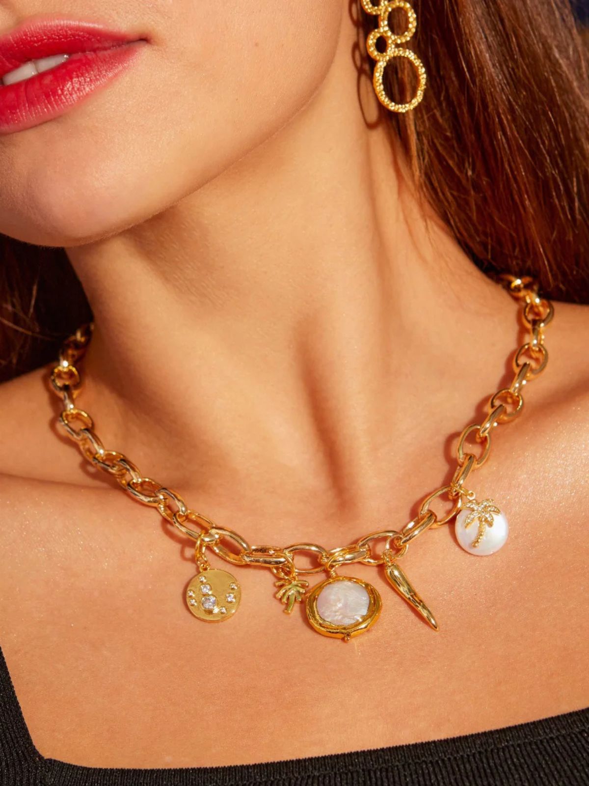This stylish mini gold palm tree charm from our design your own collection can be worn as a simple pendant, on hoop earrings, or combined with other charms on our base necklaces and bracelets. Made with 18 carat gold plated brass, the Palma charm features a cute golden palm tree