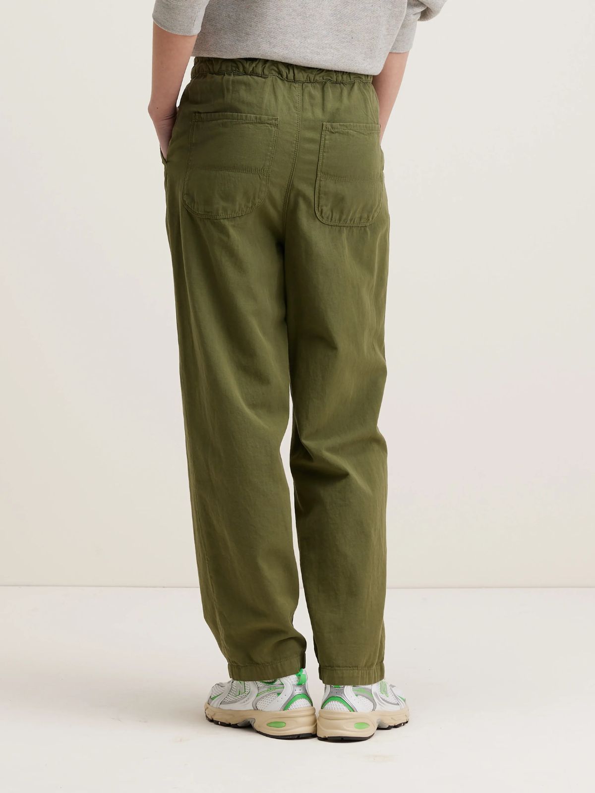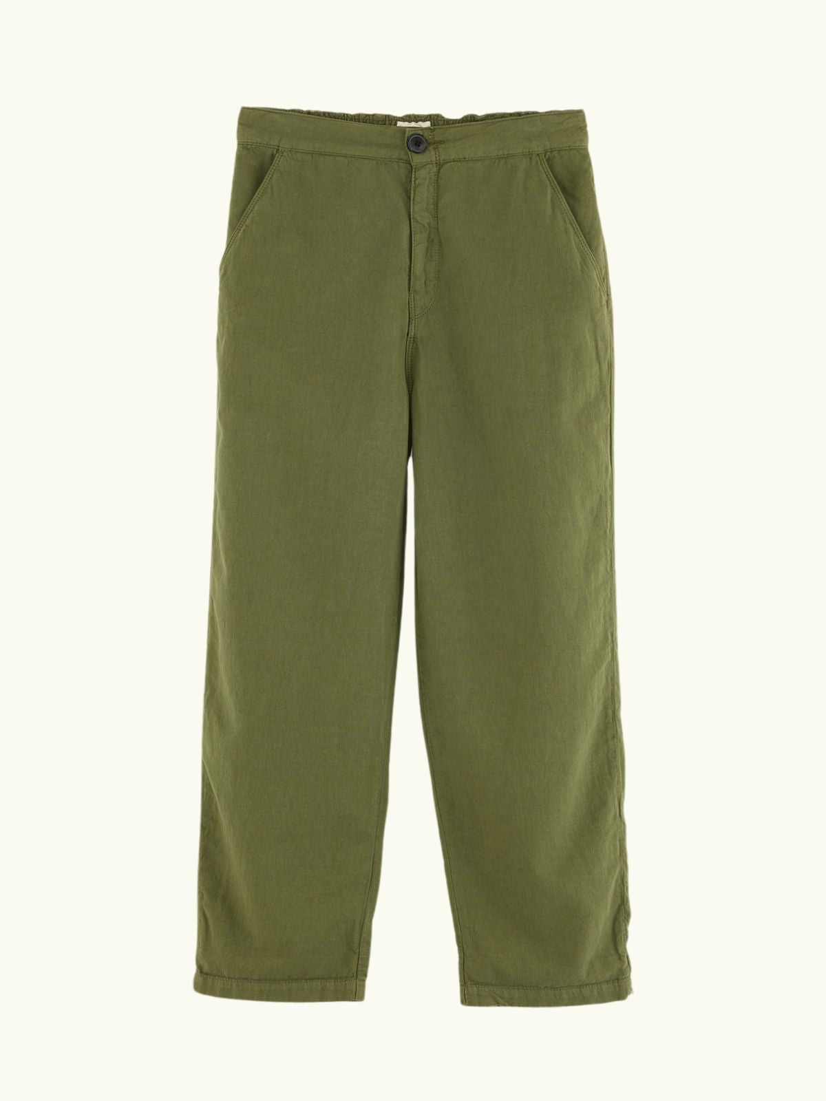 Relaxed trousers with elastic waist in khaki green cotton and linen.