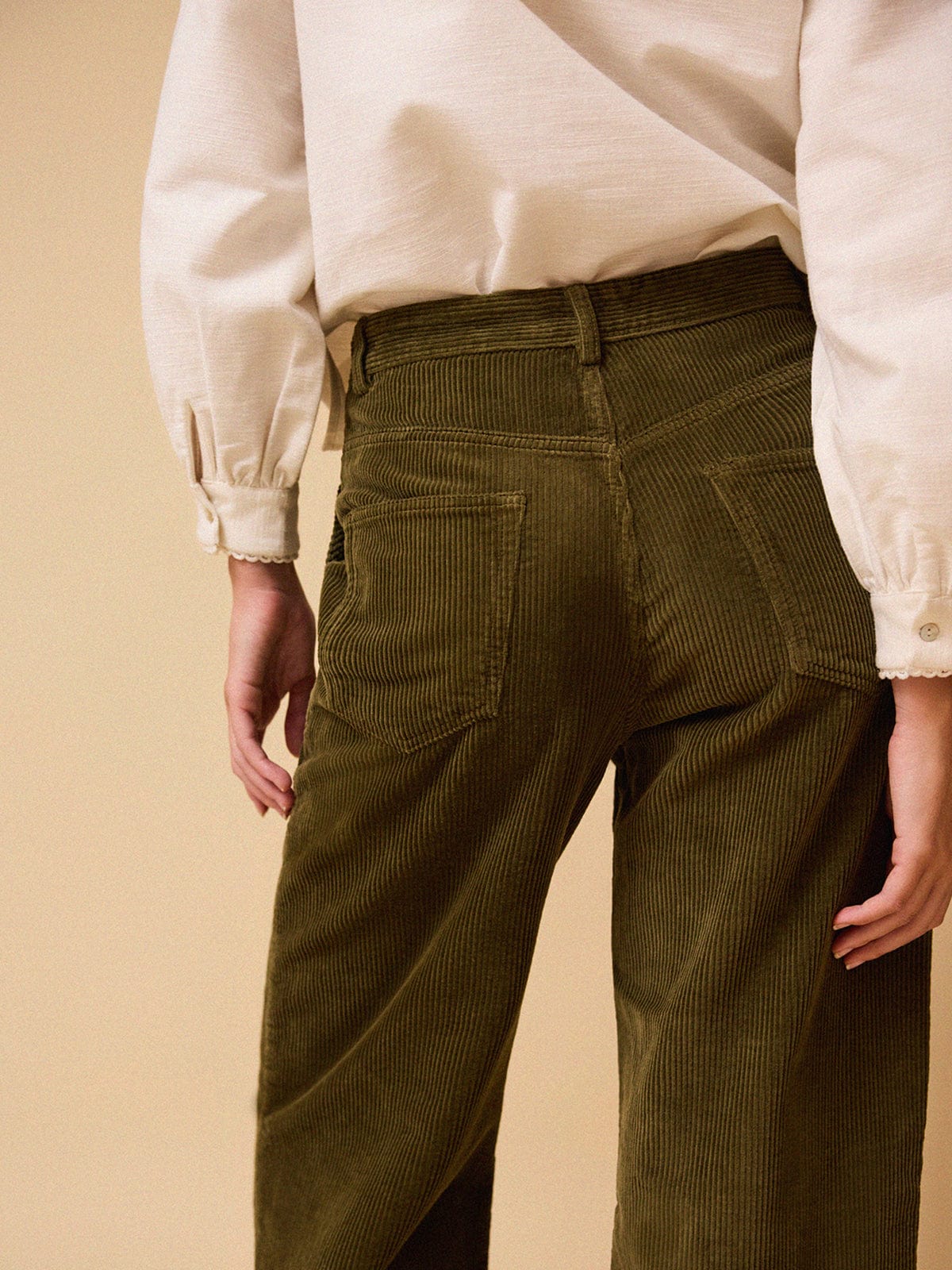 The Reign Cord Trousers in soft, khaki corduroy are serving a high-waisted, retro look with patch pockets at the front and back and a full-length wide leg. Pair with the Raine Cord Waistcoat for flawless autumnal energy.