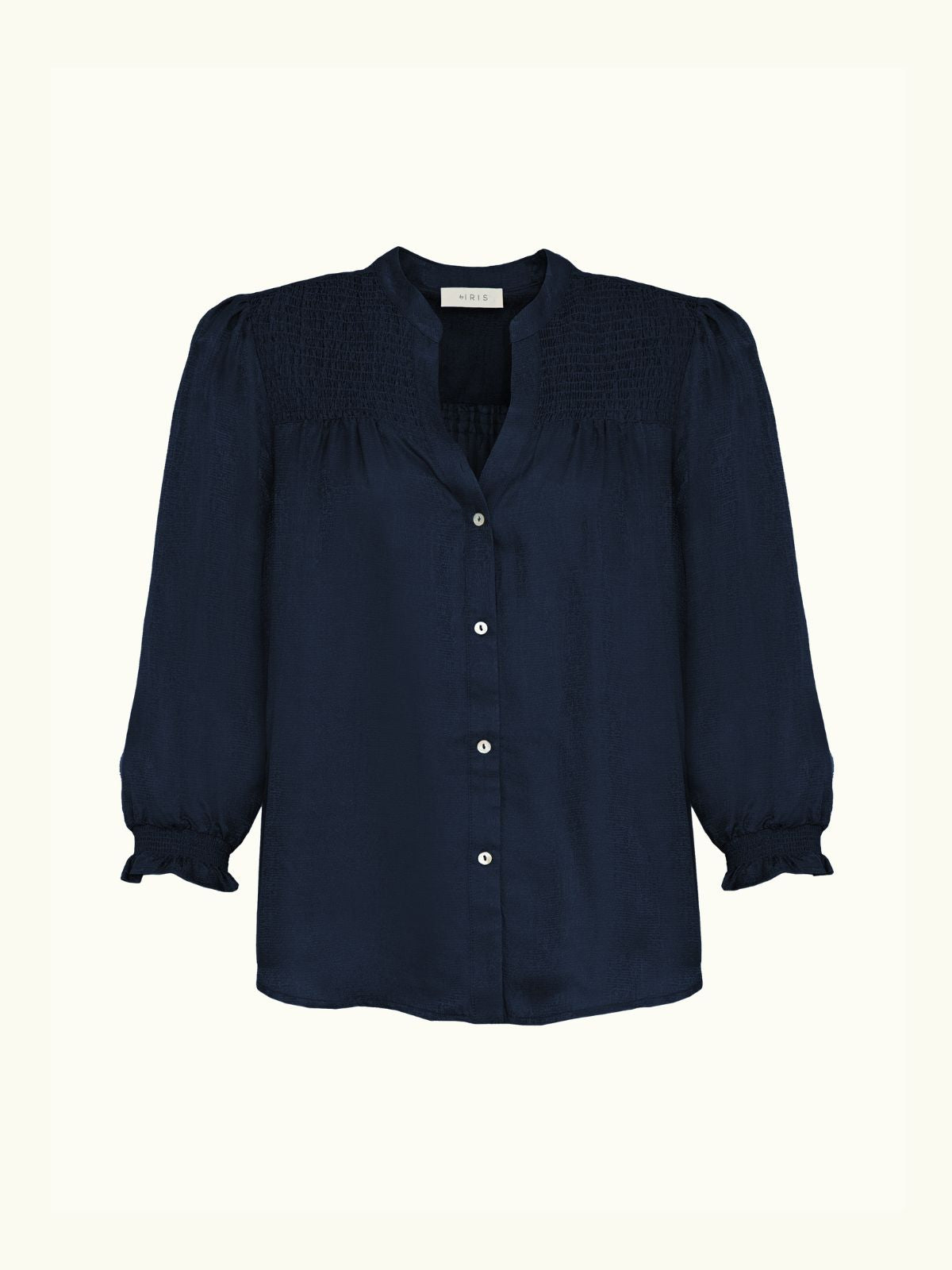 This silky, blouse is an Iris classic – with her smocked yoke, ruffled cuffs and a mandarin collar that cuts down to an open V, she has a classic, grown-up feel but is slinky enough for an evening out. New for Spring 26 in Navy Blue.
